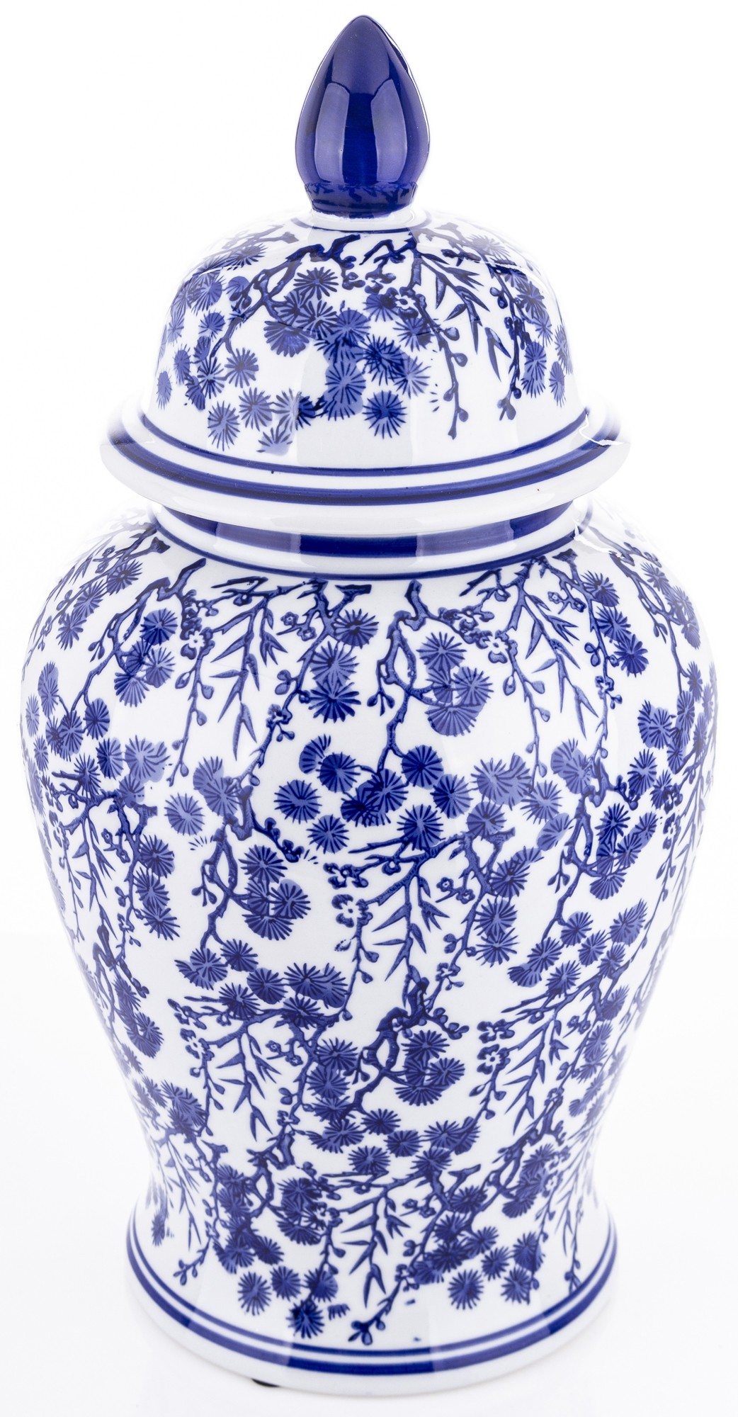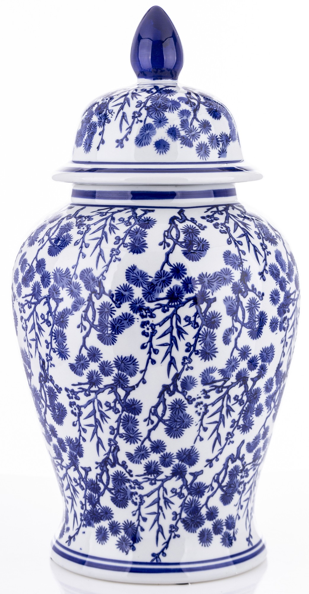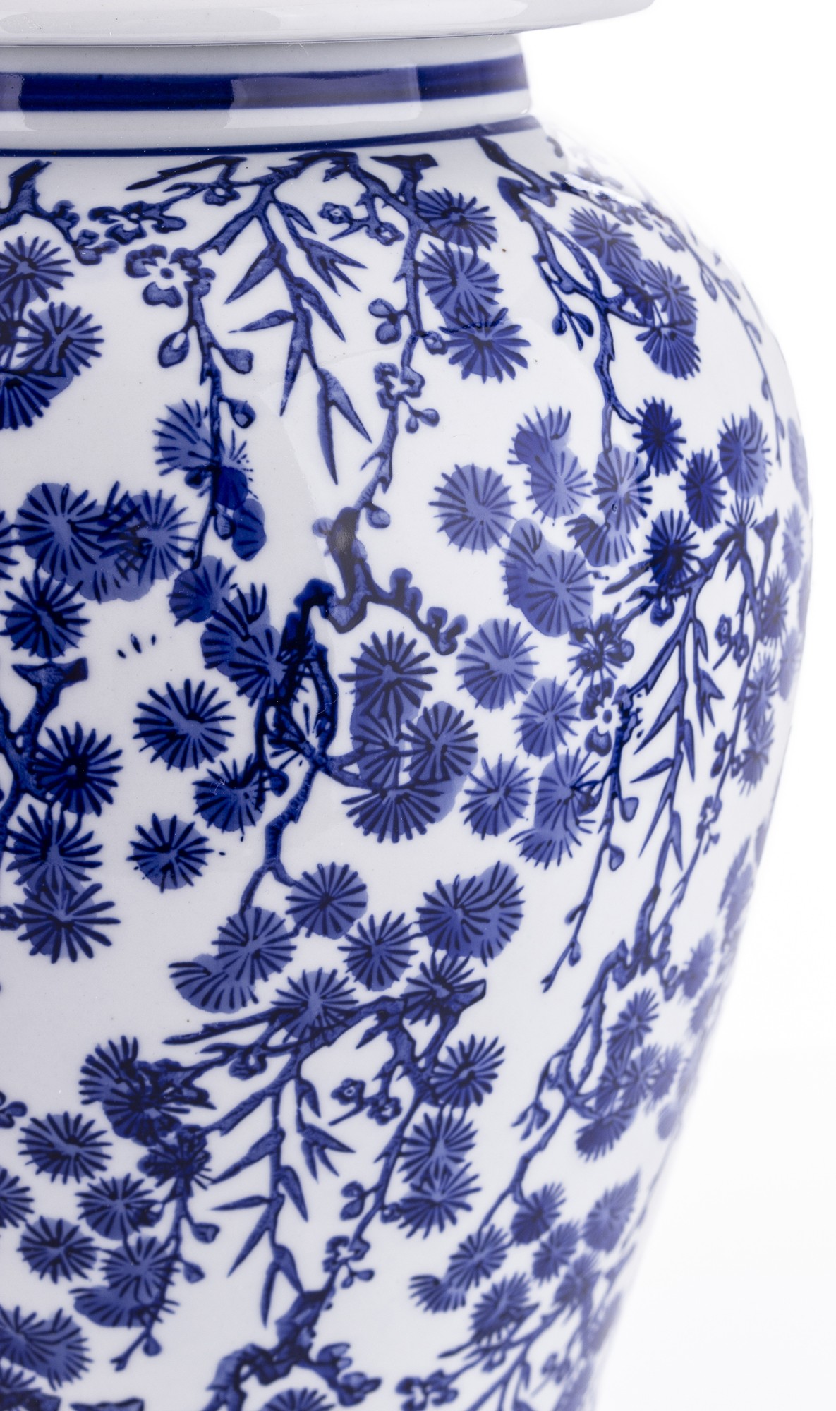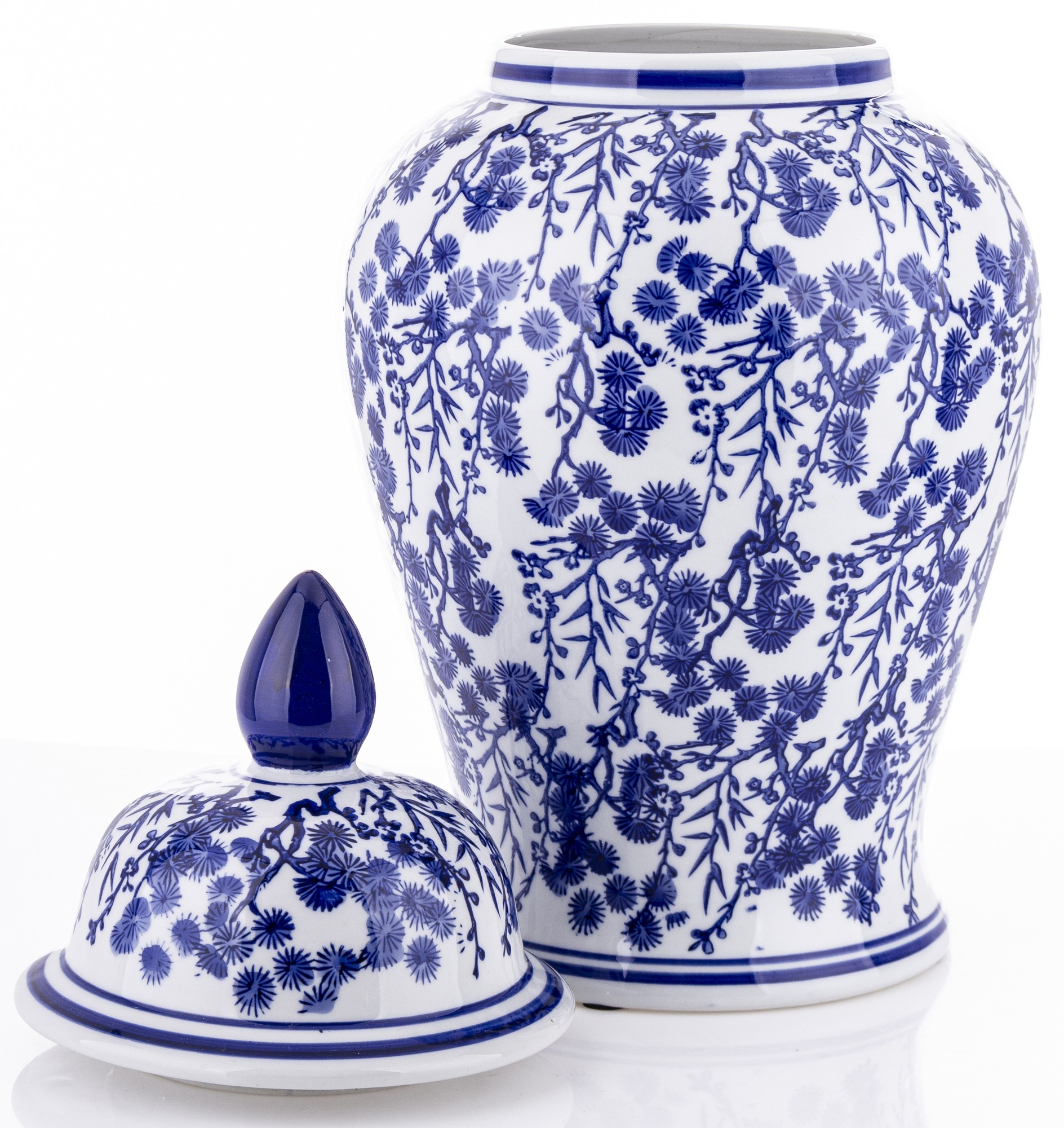 Piękny wazon z pokrywką Blue1 to idealny dodatek do każdego wnętrza. Wykonany z ceramiki w kolorze białym, zdobiony delikatnymi niebieskimi wzorami roślinnymi, dodaje elegancji i świeżości każdemu pomieszczeniu. Doskonały sposób na wyeksponowanie kwiatów czy dekoracyjnych gałązek.