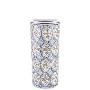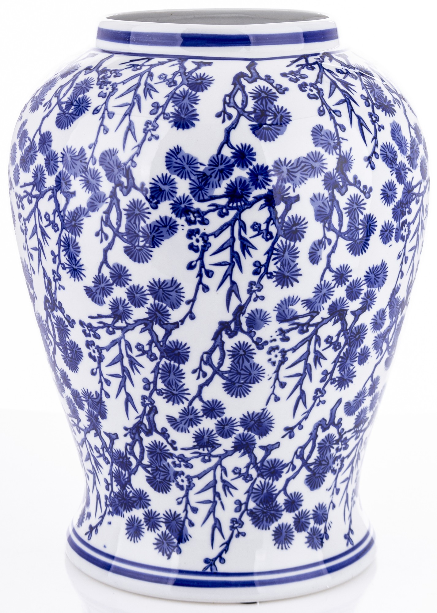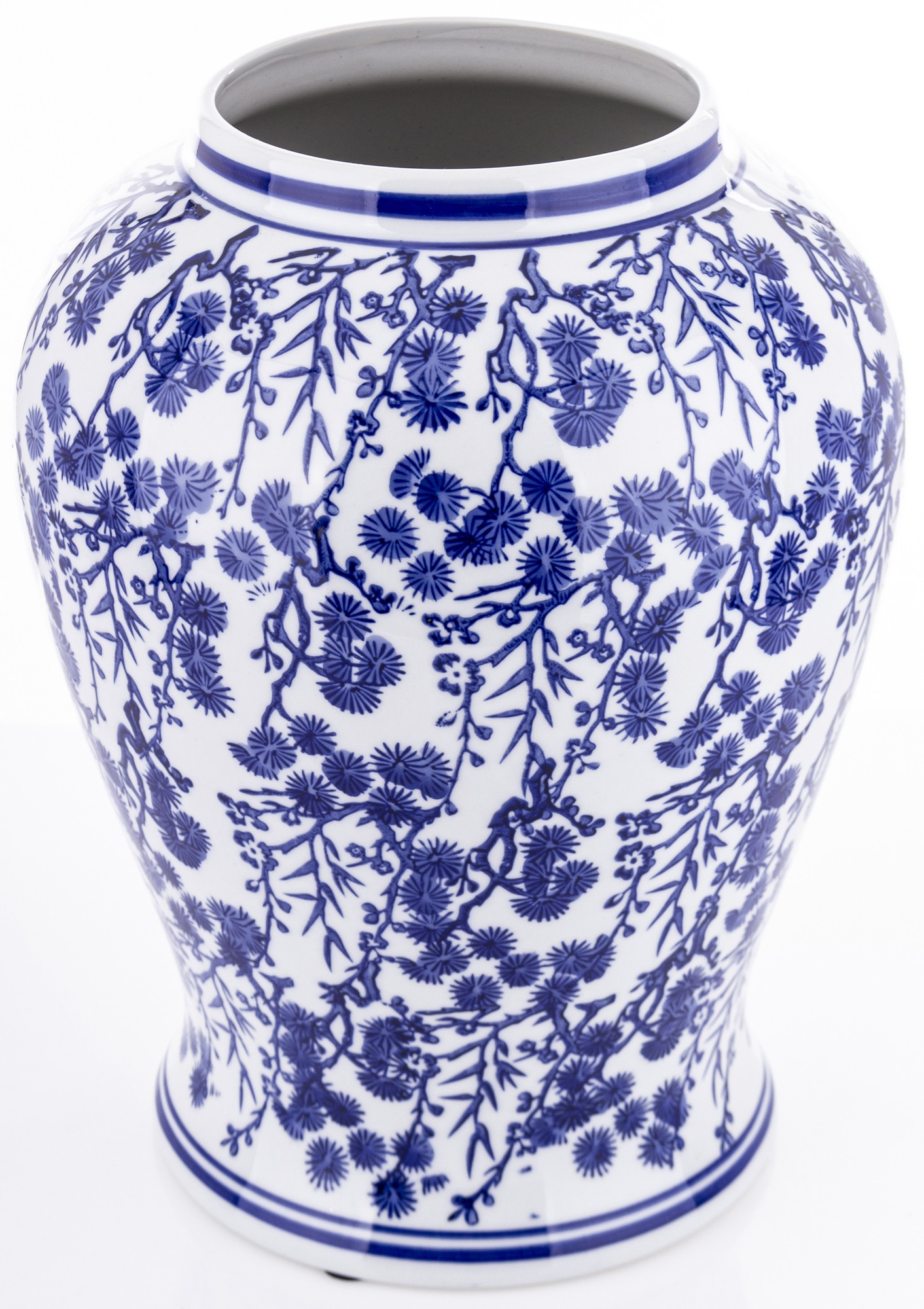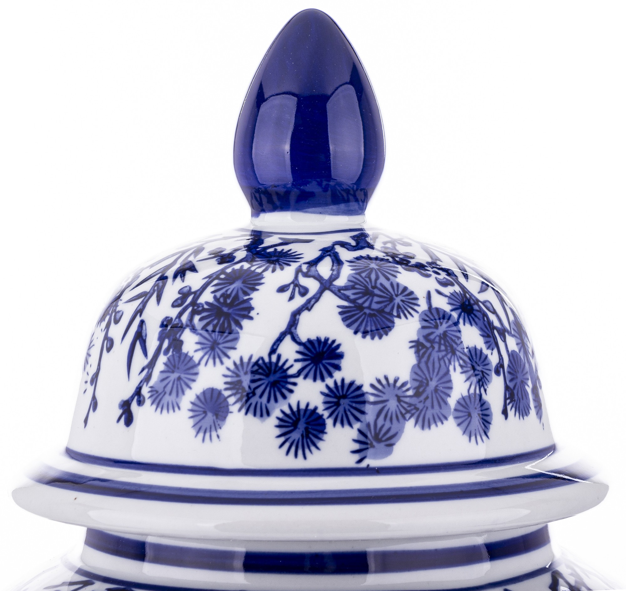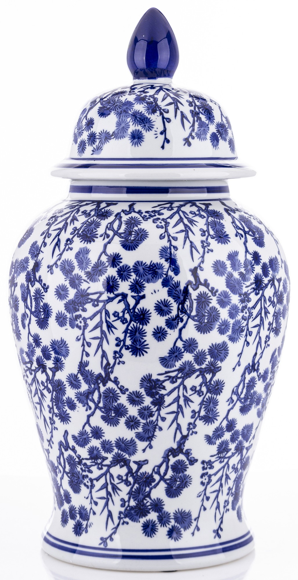 Piękny wazon z pokrywką Blue1 to idealny dodatek do każdego wnętrza. Wykonany z ceramiki w kolorze białym, zdobiony delikatnymi niebieskimi wzorami roślinnymi, dodaje elegancji i świeżości każdemu pomieszczeniu. Doskonały sposób na wyeksponowanie kwiatów czy dekoracyjnych gałązek.