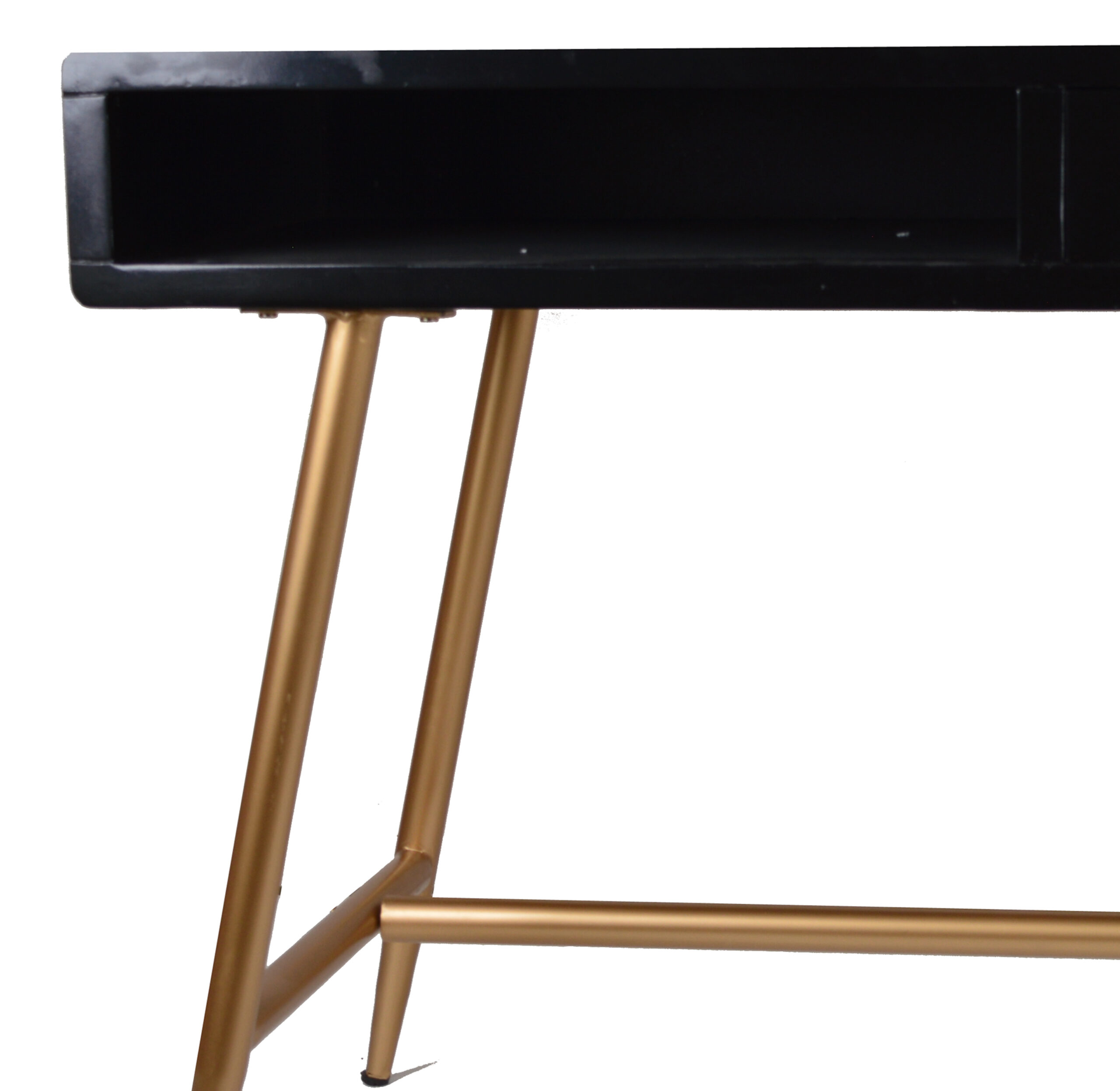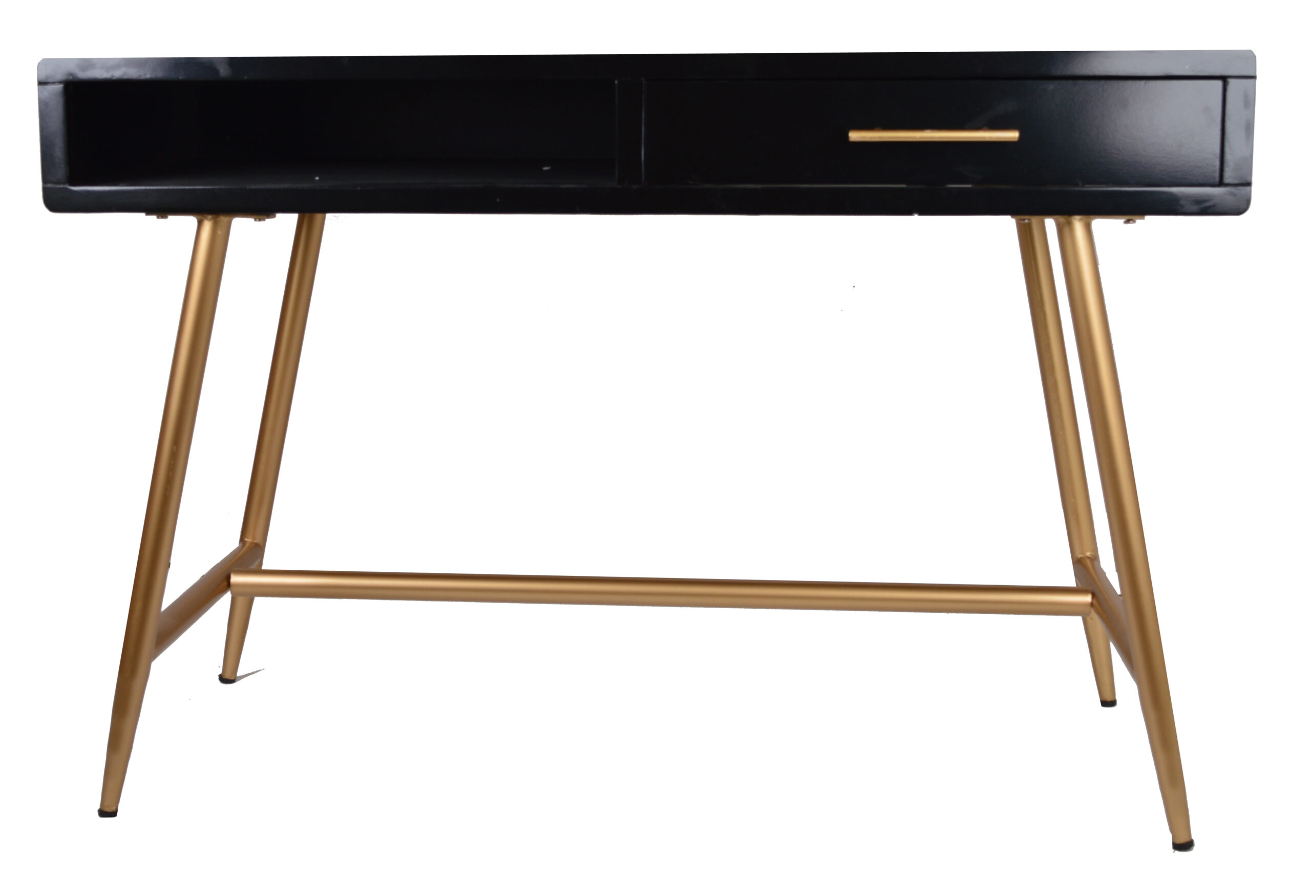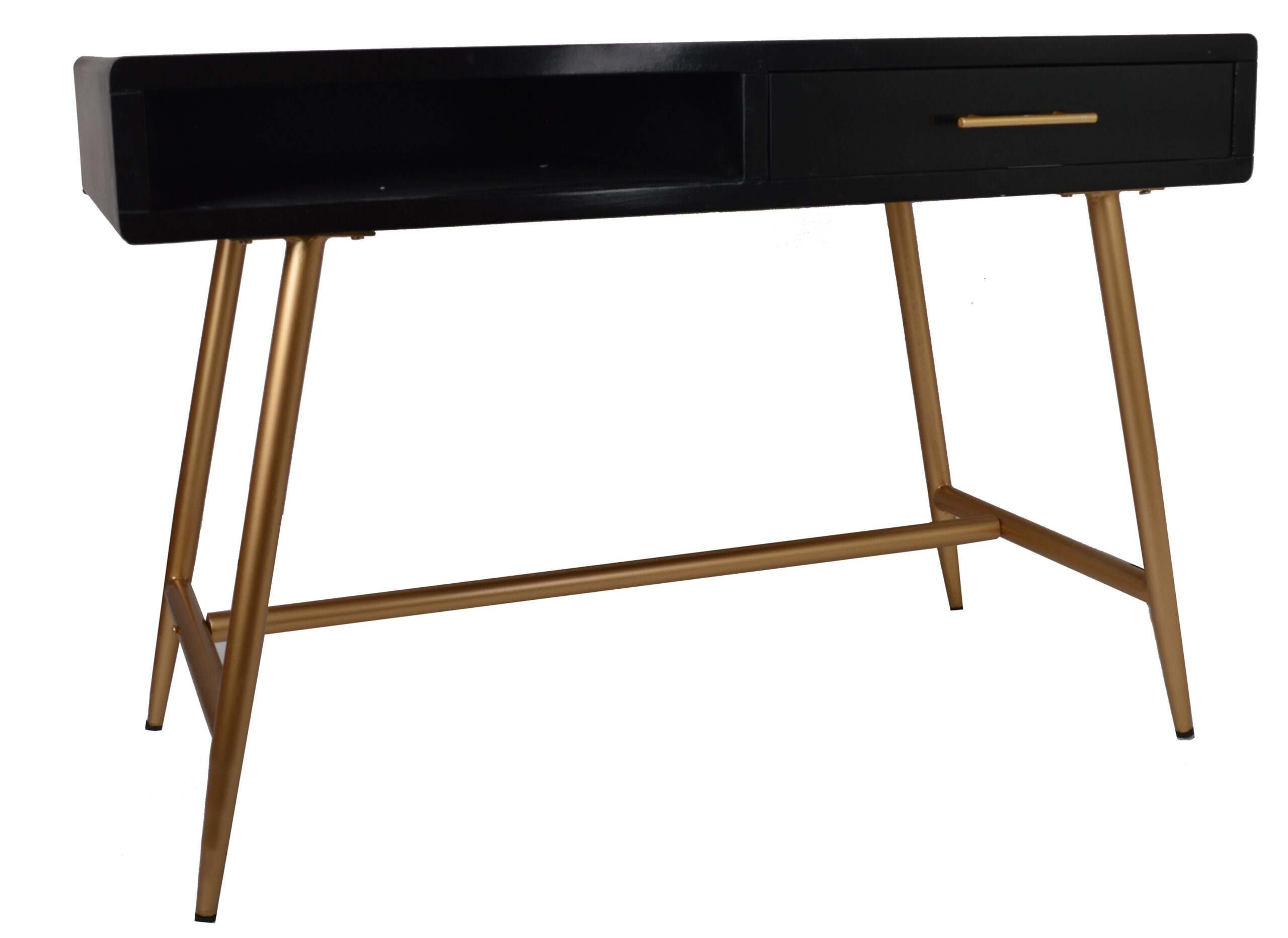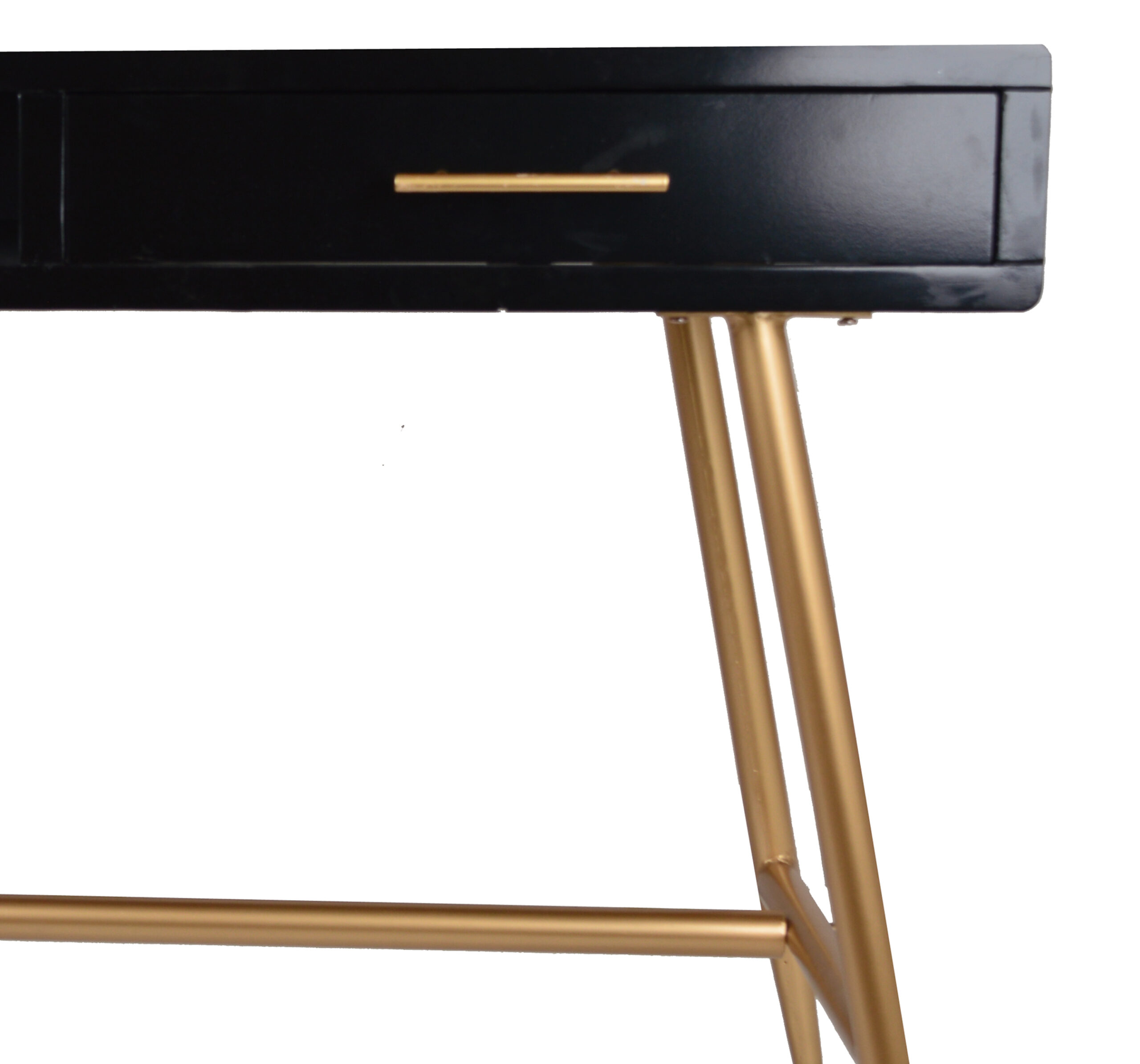 Biurko czarne z szufladą na złotych nogach NAKA to elegancki i nowoczesny mebel, który doskonale wpasuje się w różnorodne wnętrza, zarówno domowe, jak i biurowe. Jego minimalistyczny design w połączeniu z efektownymi złotymi nogami nadaje mu wyjątkowego charakteru, czyniąc go idealnym wyborem dla osób ceniących sobie estetykę i funkcjonalność.