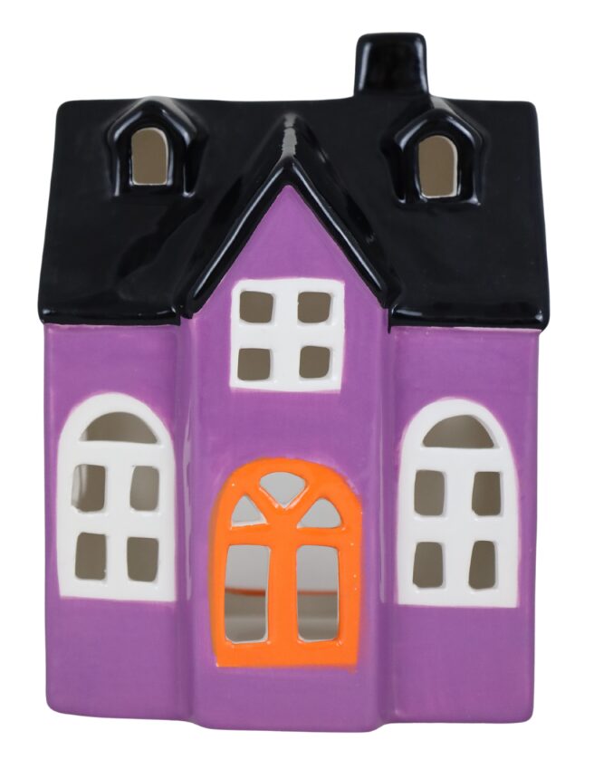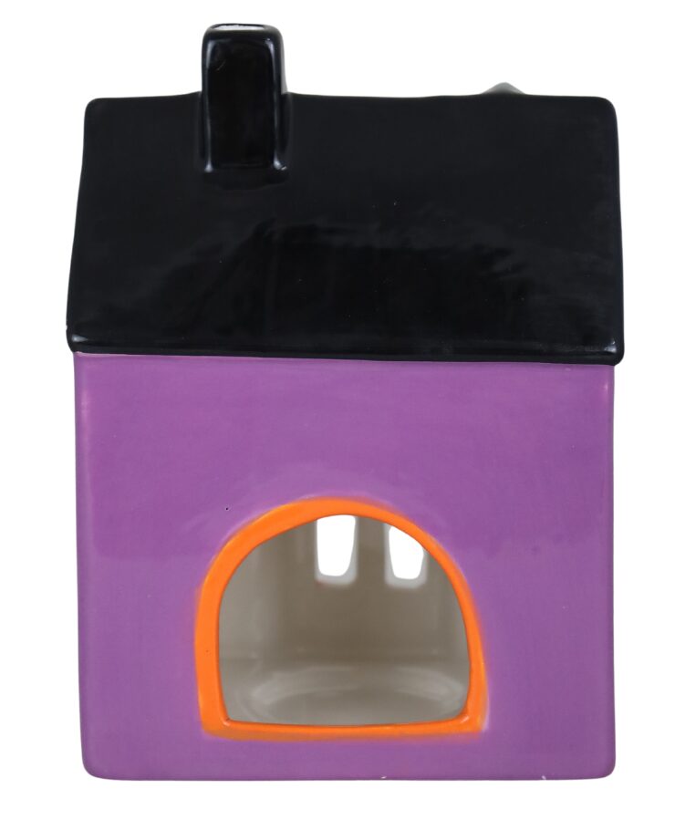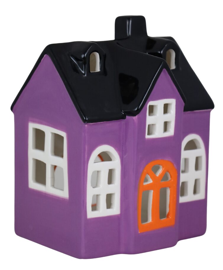 Postaw na oryginalność i wprowadź do swojego wnętrza magiczny nastrój z ceramicznym domkiem Halloween na t-light w fioletowo-czarnym odcieniu.
