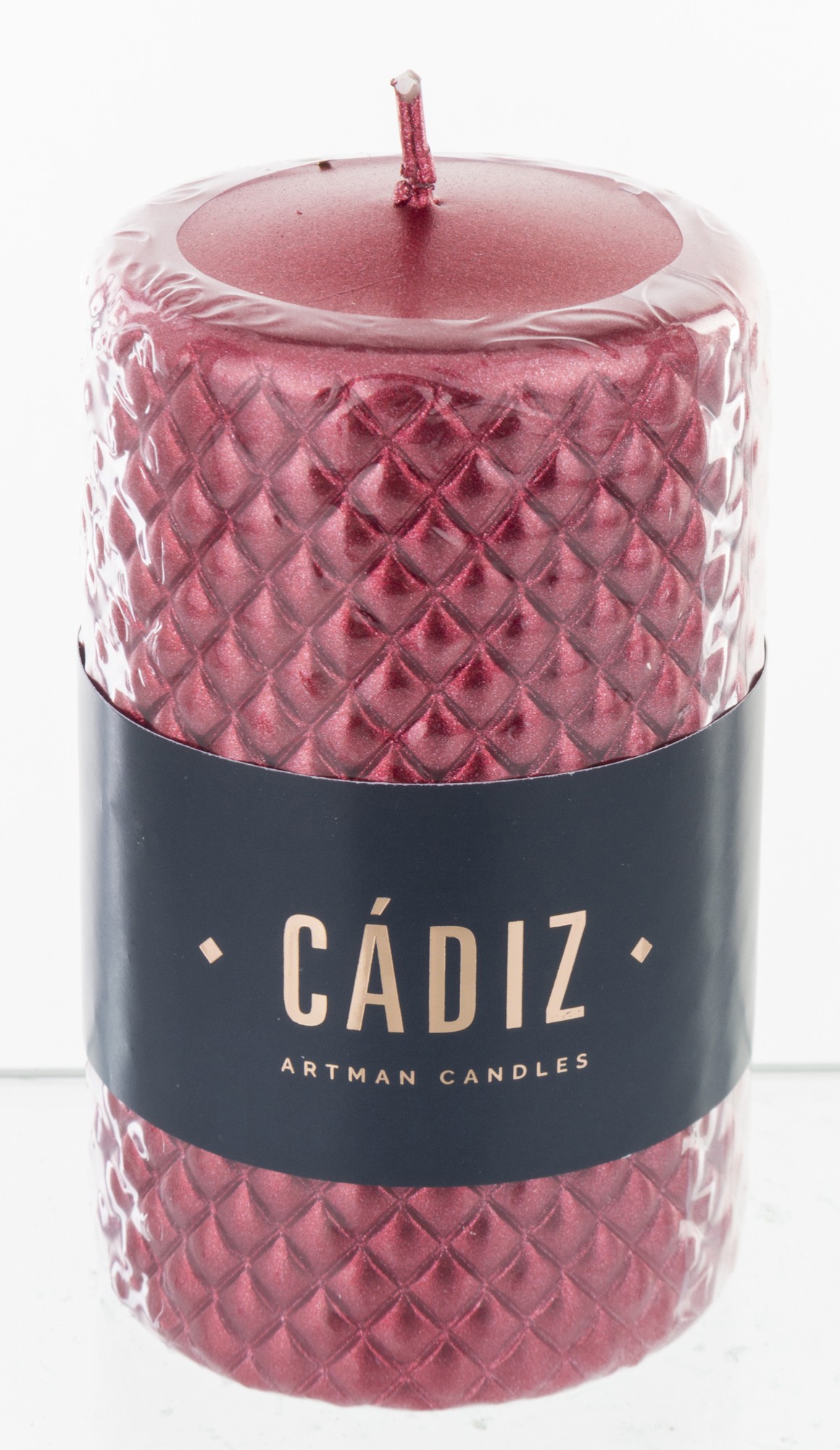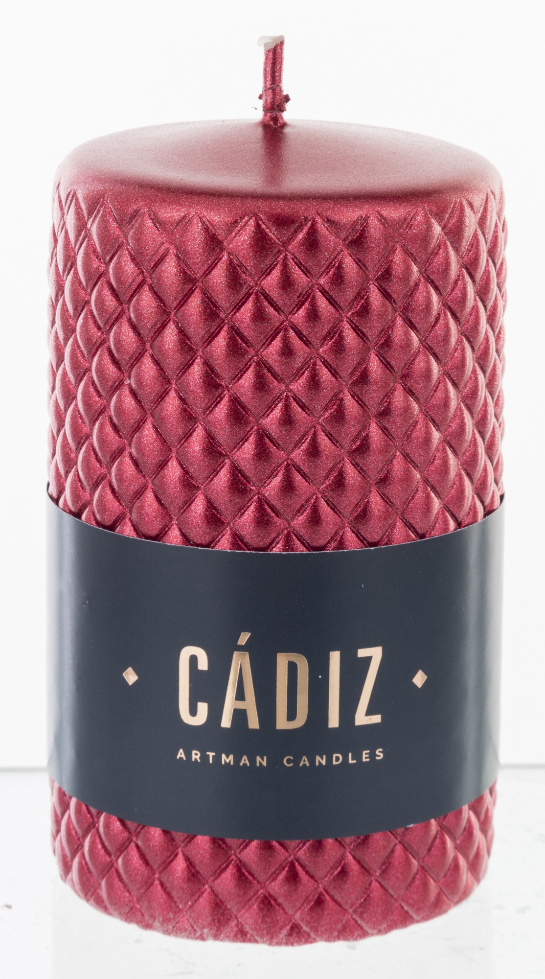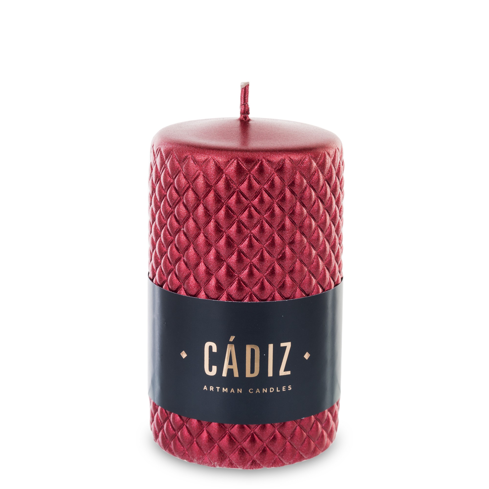 Czerwona świeczka Cadiz o wymiarach 12x7x7 cm zachwyca głęboką barwą, lekkim połyskiem i powierzchnią o fakturze przypominającej łuskę. Jej czas palenia wynosi aż 65 godzin, dzięki czemu możesz cieszyć się jej pięknem i ciepłym światłem przez długi czas.
