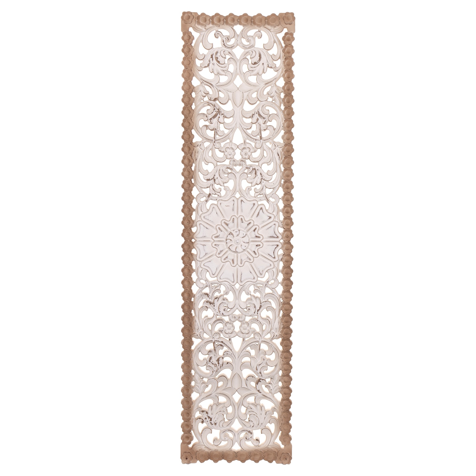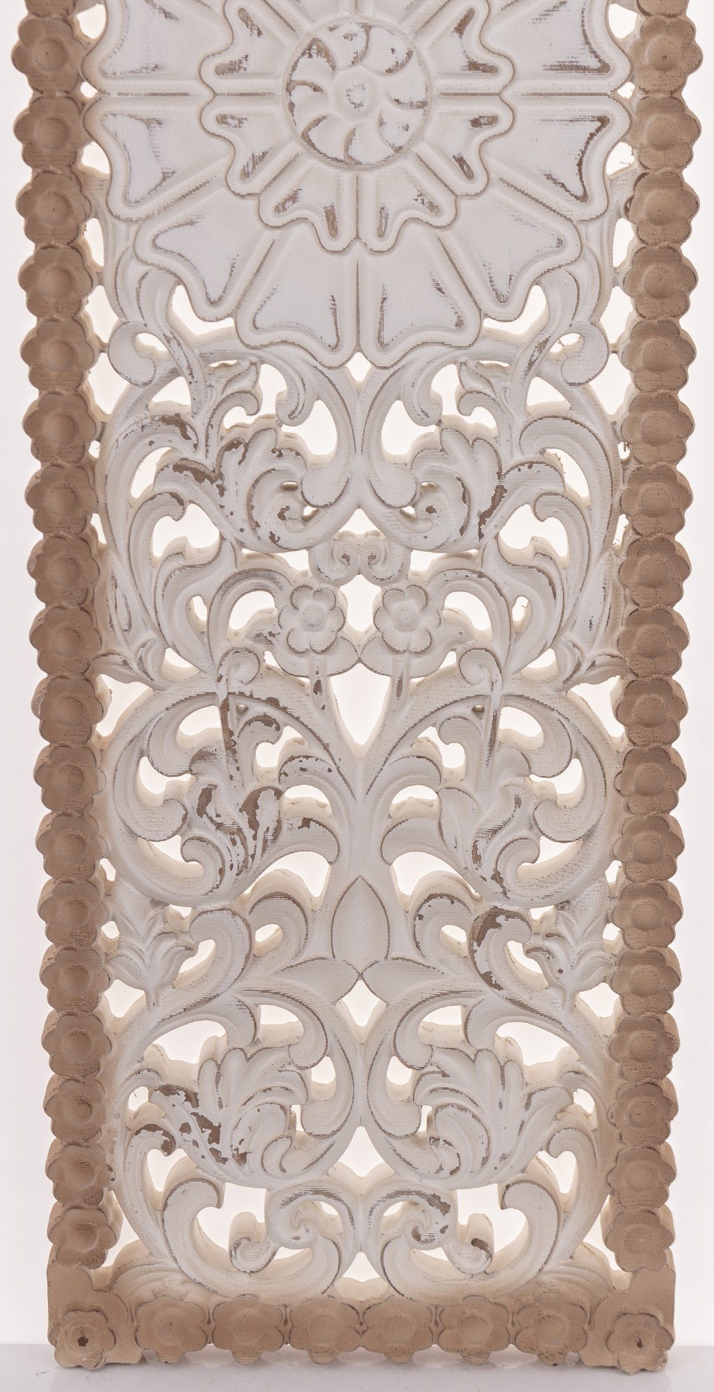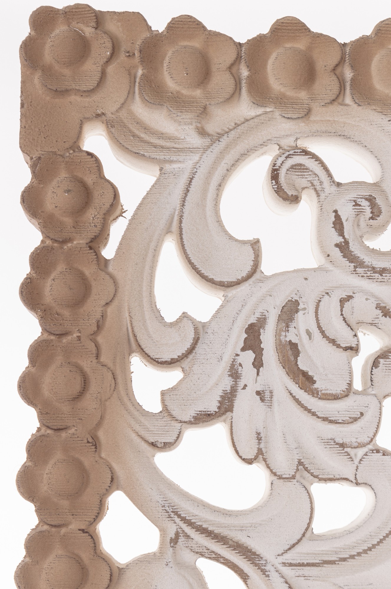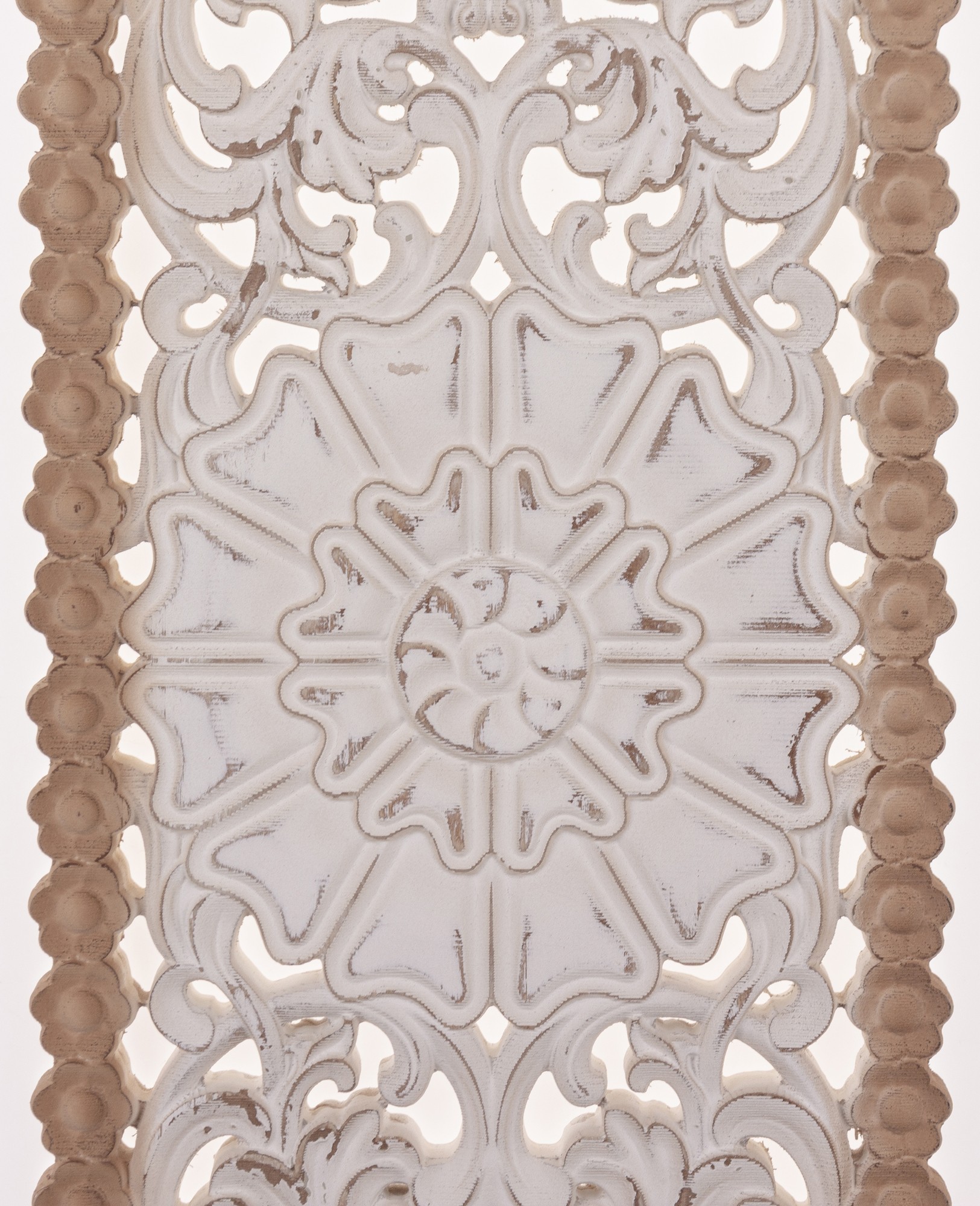 Dekoracja Ścienna ECORSI – Sielski Urok w Stylu Prowansalskim. Ożyw swoje ściany naturalnym pięknem i sielskim urokiem! Dekoracja ścienna ECORSI to elegancki, pionowy panel z drewna, łączący naturalną, brązową ramę z misternie rzeźbionym, ażurowym wzorem inspirowanym motywami floralnymi. Białe, postarzane wykończenie idealnie wpisuje się w styl prowansalski, shabby chic czy skandynawski, dodając wnętrzu lekkości i tekstury.