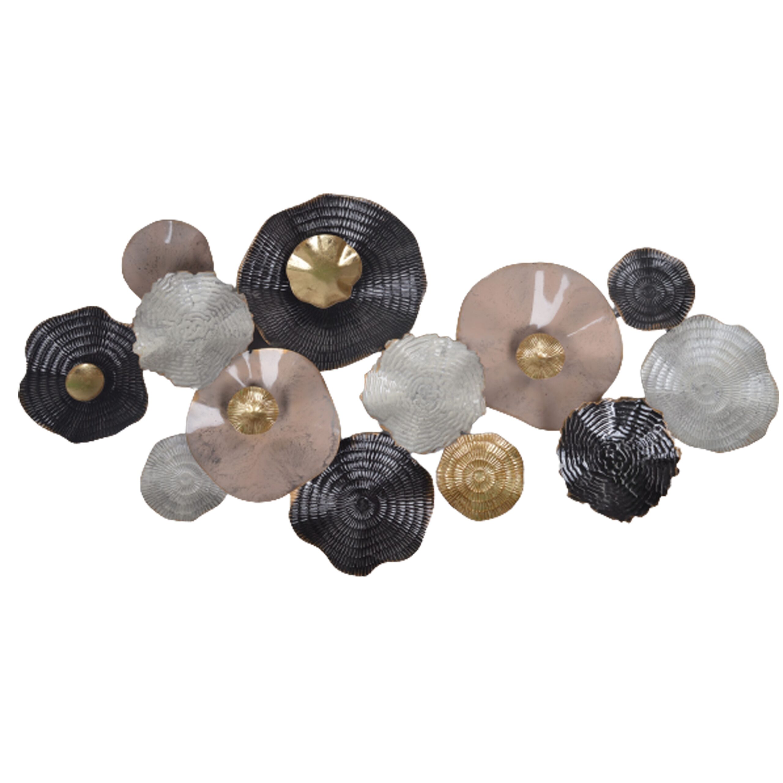Metalowe elementy w wielkich rozmiarach tworzą niezwykłą kompozycję, która zarazem przyciąga uwagę, jak i dodaje głębi przestrzeni. Ta dekoracja jest nie tylko estetycznym dodatkiem, ale także dynamicznym wyrazem sztuki, który nadaje pomieszczeniu wyjątkowego charakteru.