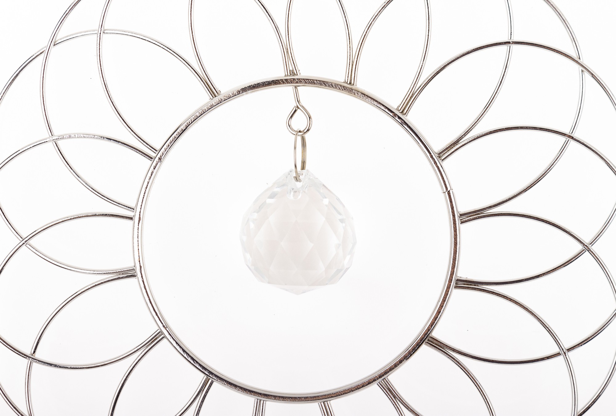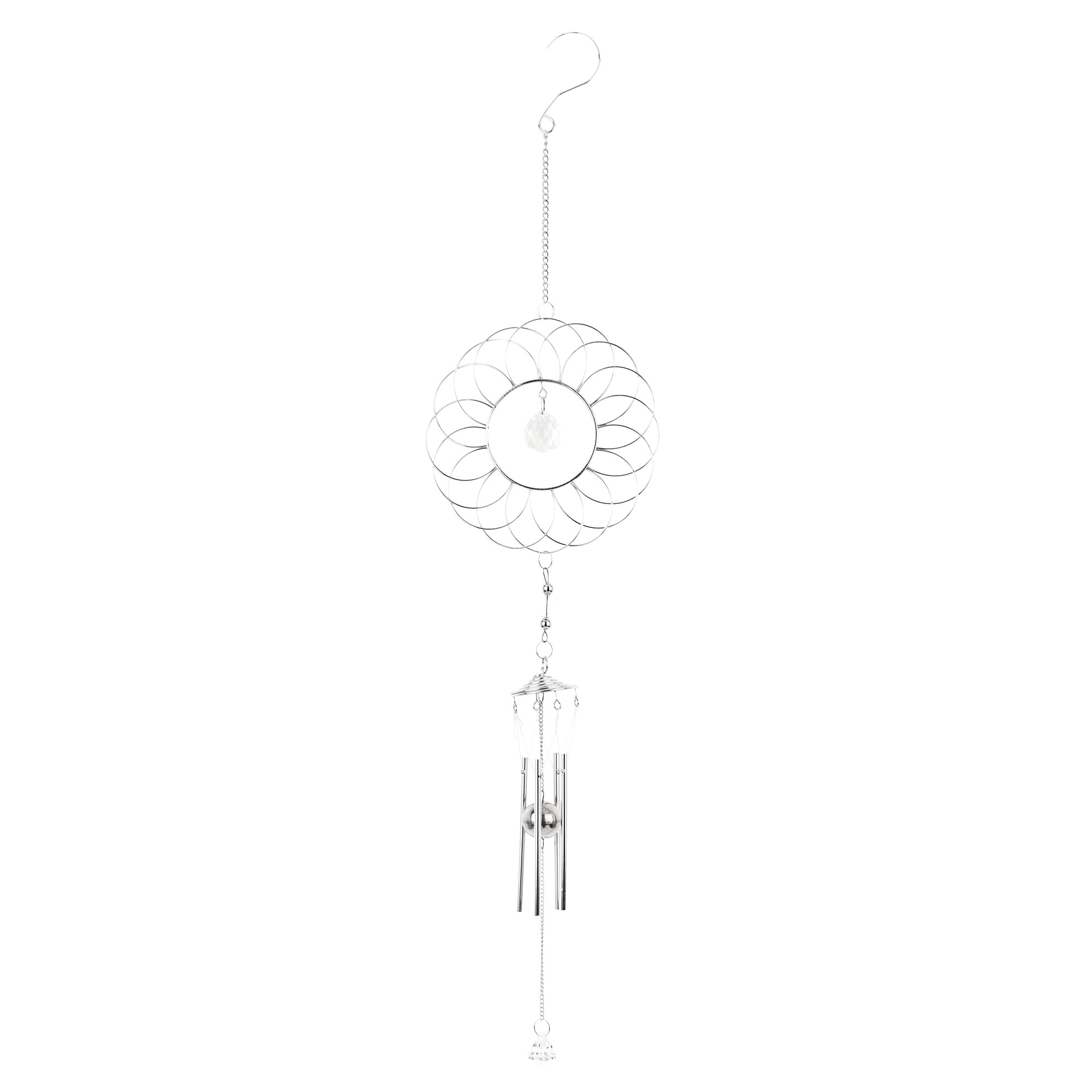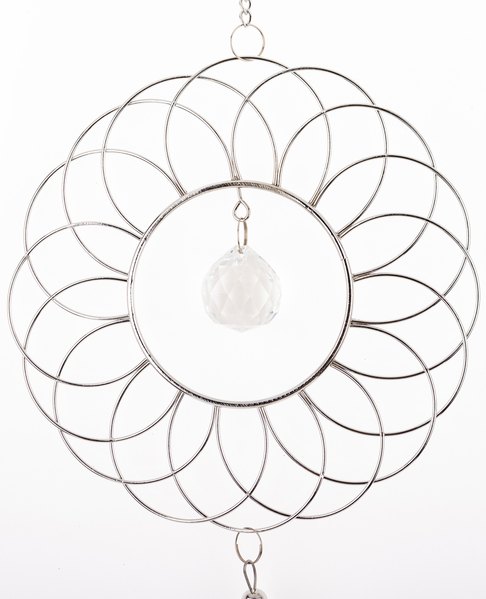 Wisząca metalowa ozdoba w posiaci eleganckiej geometrycznej kompozycji w formie pętelek układających się w kształt koła, z zawieszonym w środku delikatnym wisiorkiem. Od głównej części ozdoby odchodzi subtelny łańcuszek, do którego przymocowane są podłużne dzwoneczki, które delikatnie brzęczą na wietrze. Idealna ozdoba do zawieszenia w oknie, na balkonie lub jako element dekoracyjny w pokoju, dodaje przestrzeni wyjątkowego uroku i subtelności.