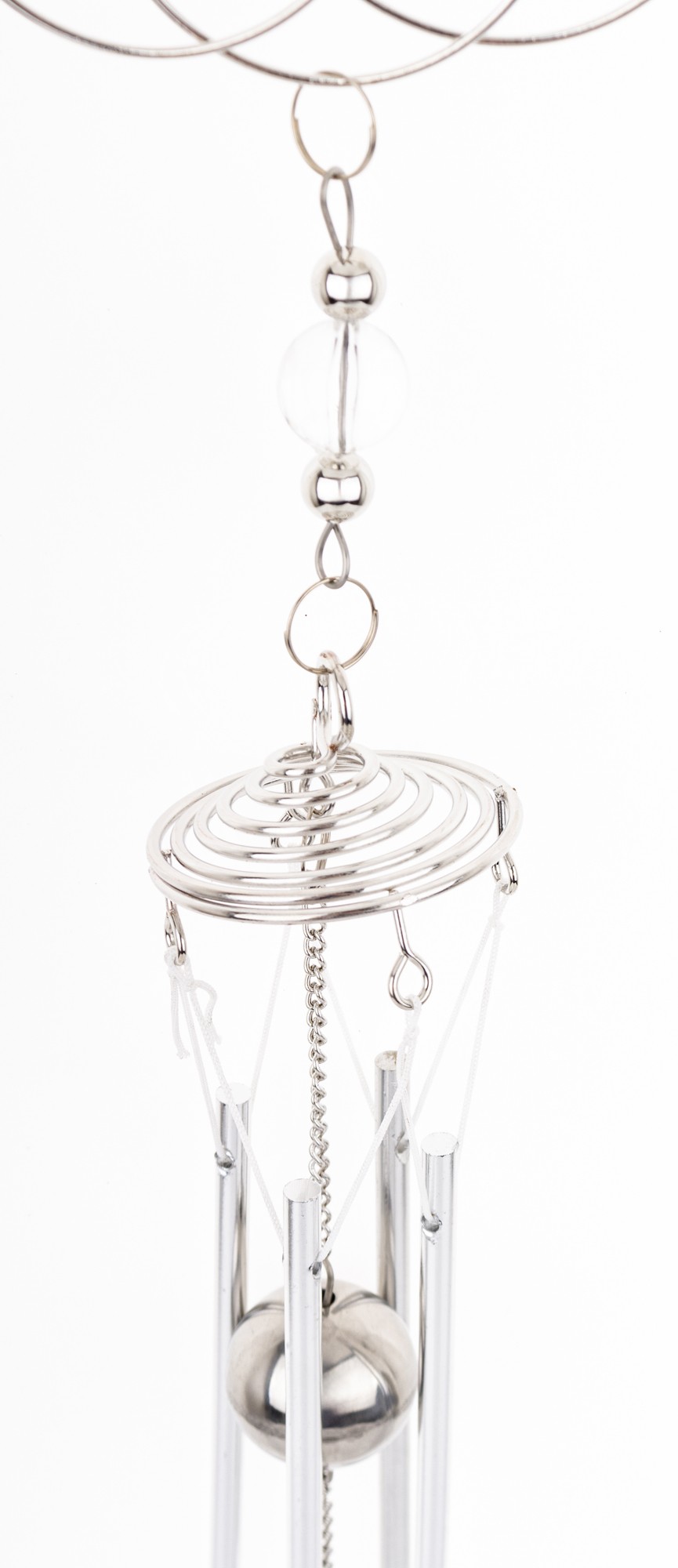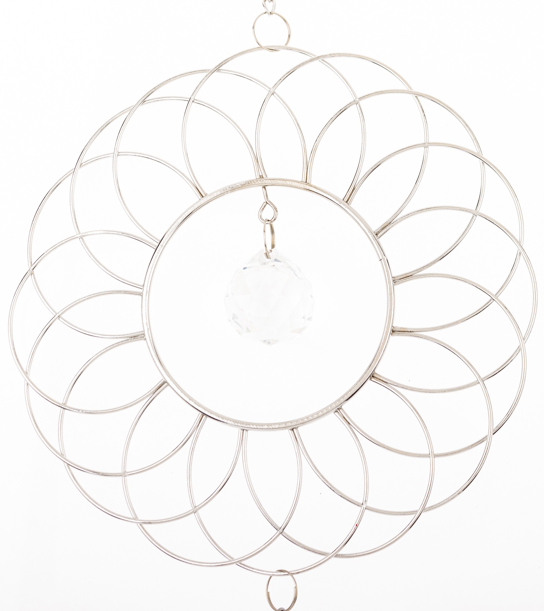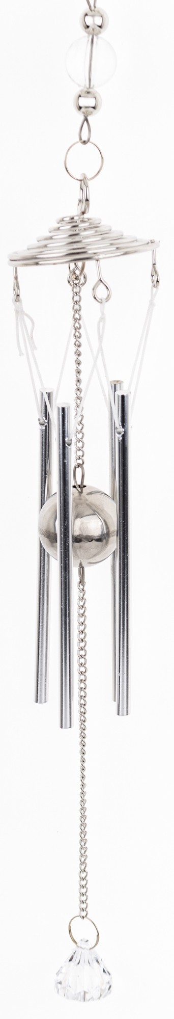 Wisząca metalowa ozdoba w posiaci eleganckiej geometrycznej kompozycji w formie pętelek układających się w kształt koła, z zawieszonym w środku delikatnym wisiorkiem. Od głównej części ozdoby odchodzi subtelny łańcuszek, do którego przymocowane są podłużne dzwoneczki, które delikatnie brzęczą na wietrze. Idealna ozdoba do zawieszenia w oknie, na balkonie lub jako element dekoracyjny w pokoju, dodaje przestrzeni wyjątkowego uroku i subtelności.