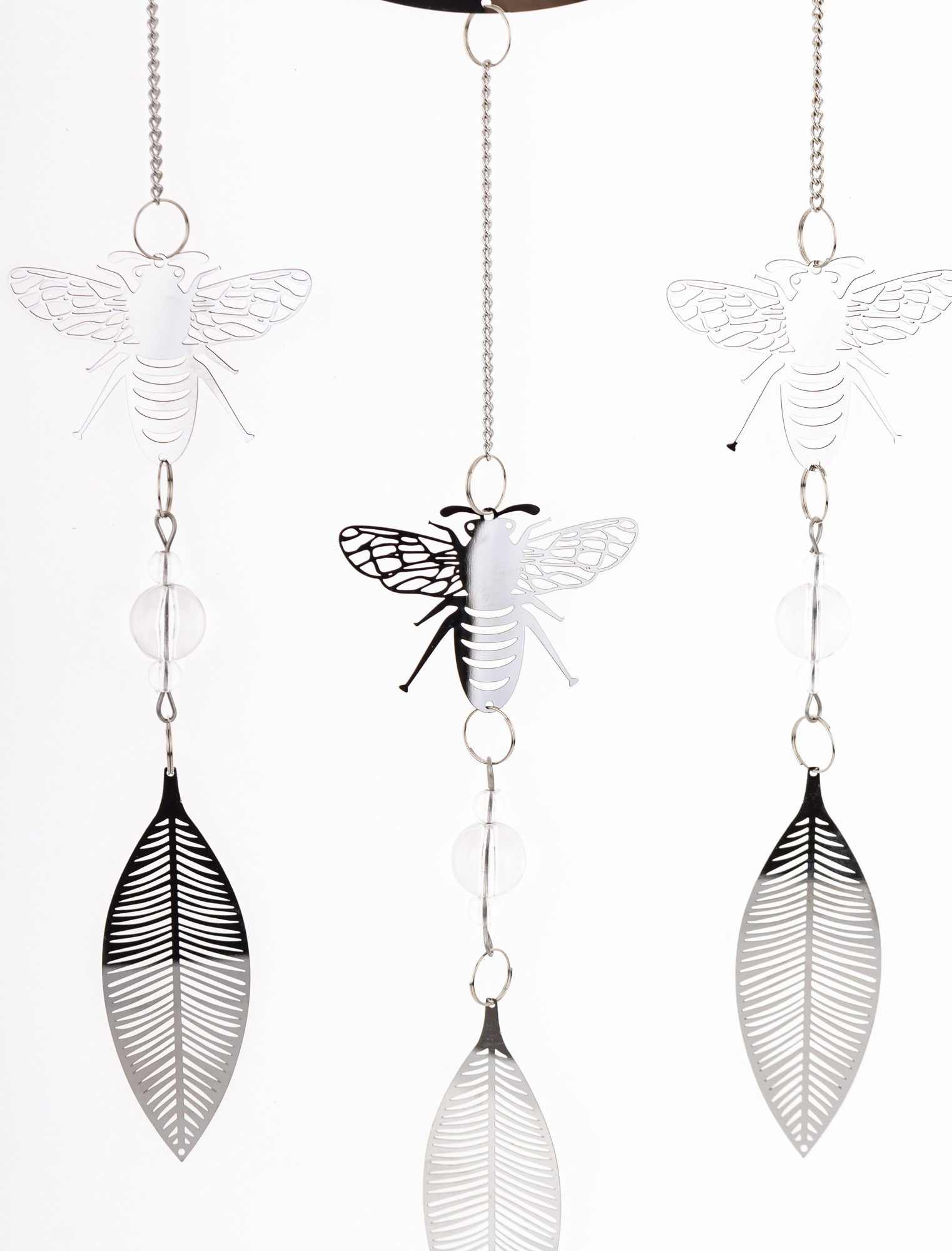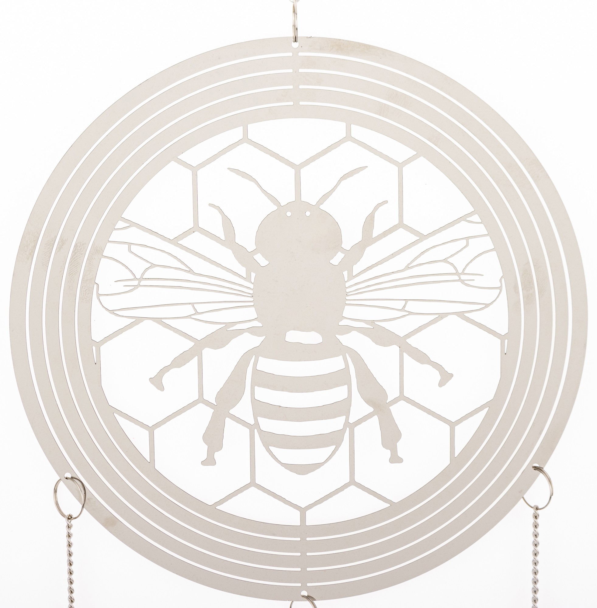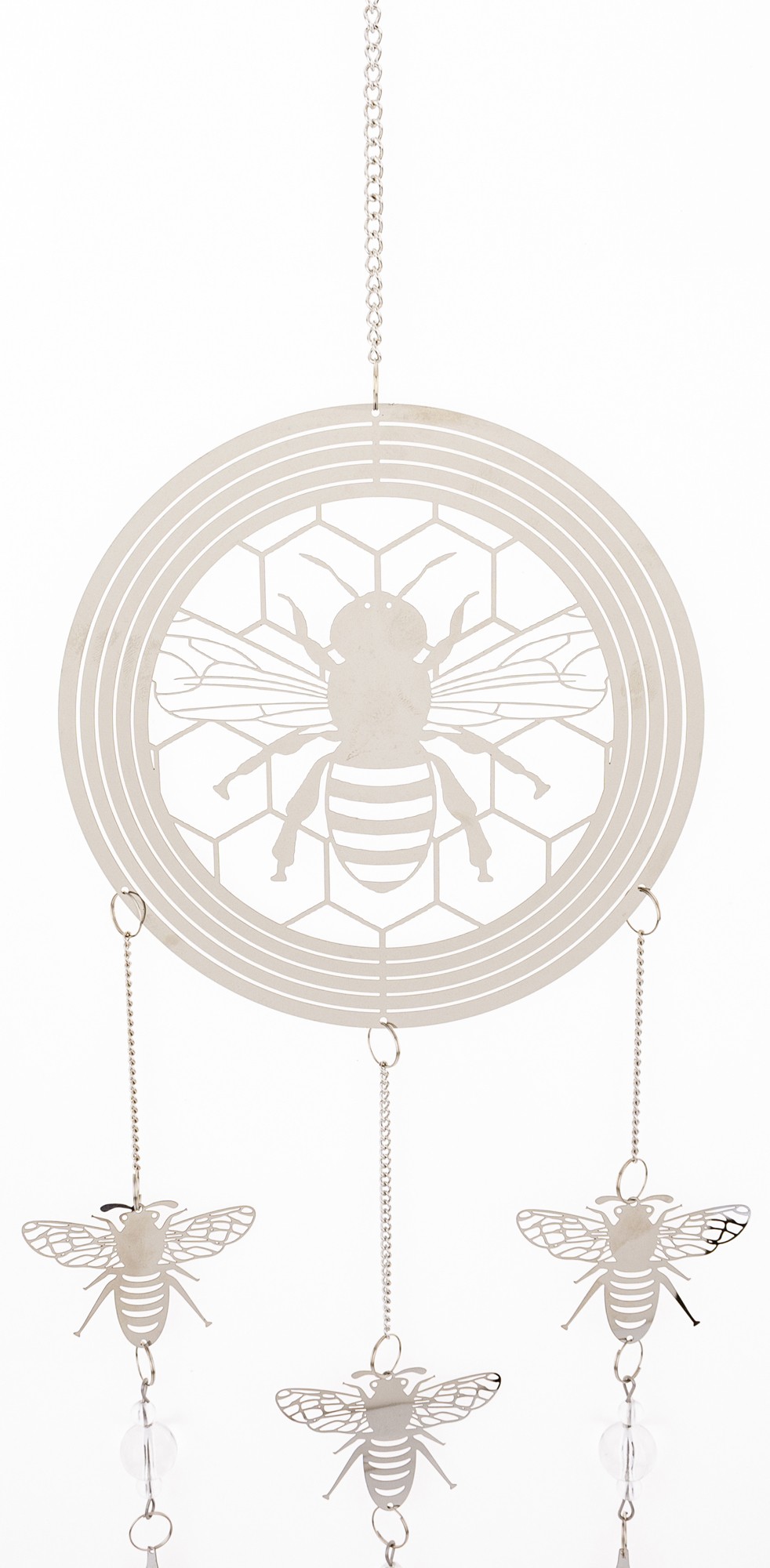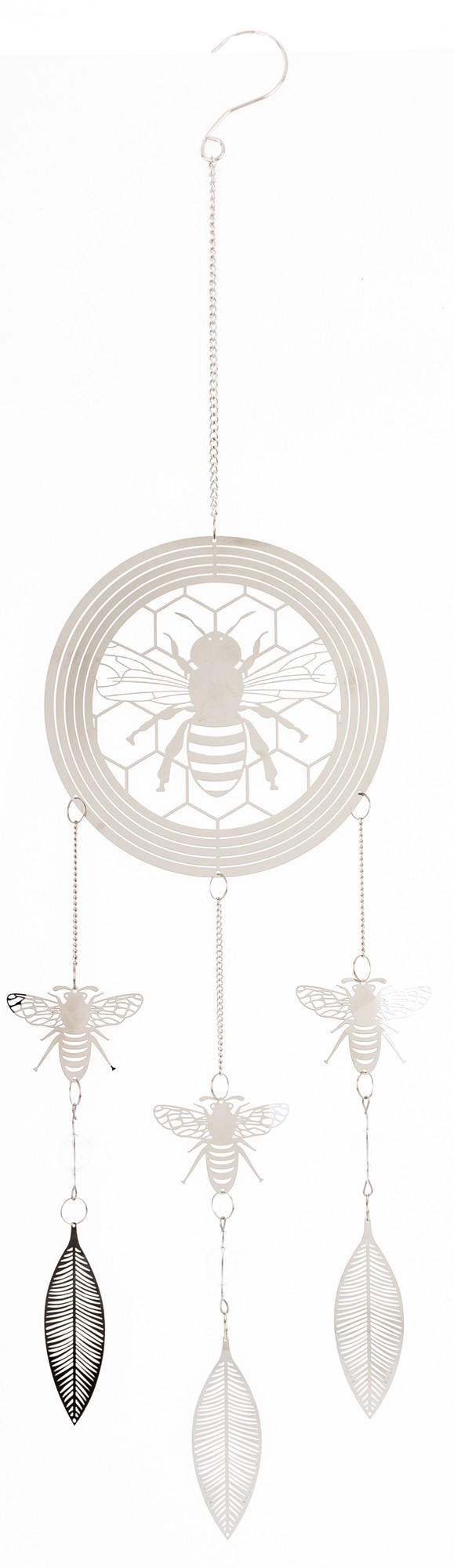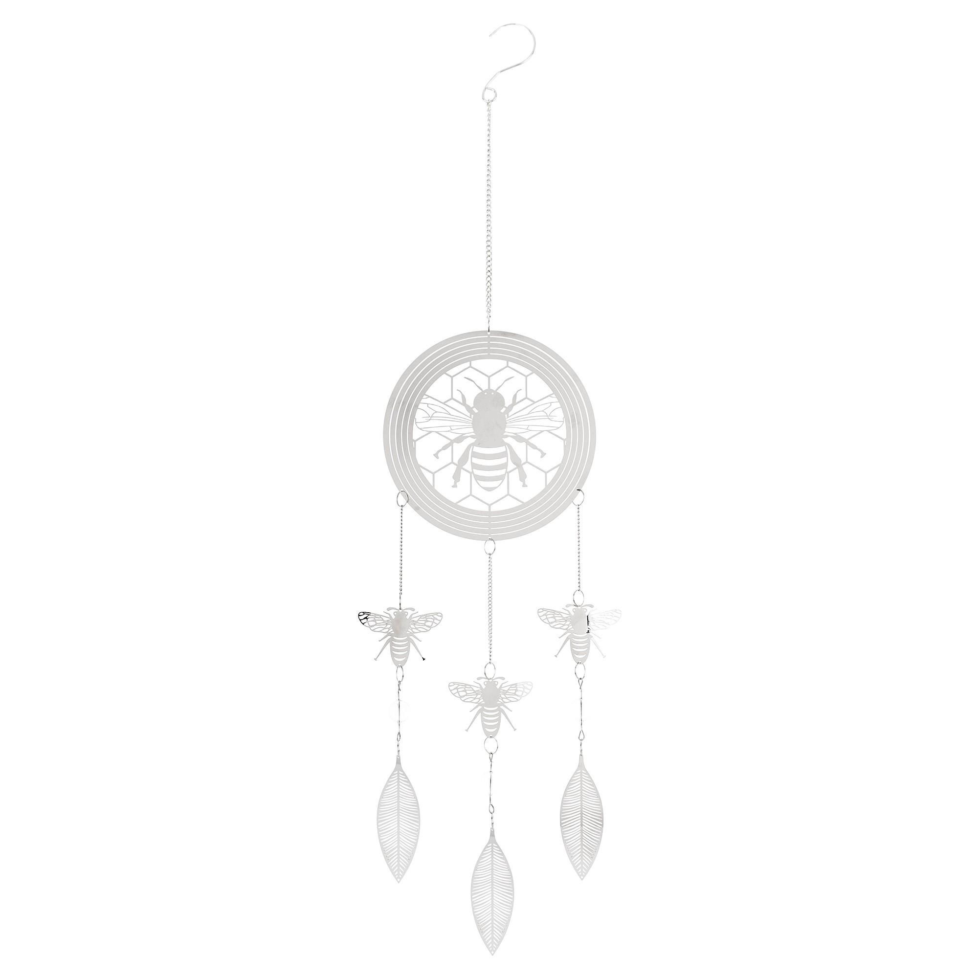 Wyjątkowa wisząca dekoracja w kształcie przypominającym łapacz snów wykonana z cienkiego metalu w eleganckim srebrnym kolorze to doskonały sposób na dodanie charakteru i uroku Twojemu wnętrzu. W dekoracji dominuje pszczeli motyw- jej głównym elementem jest koło, w którym umieszczona jest pszczoła na plastrze miodu. Z koła wychodzą trzy łańcuszki, na każdym z nich zawieszona jest pszczoła, a zakończone są one delikatnymi listkami, co nadaje dekoracji lekkości i naturalnego uroku.