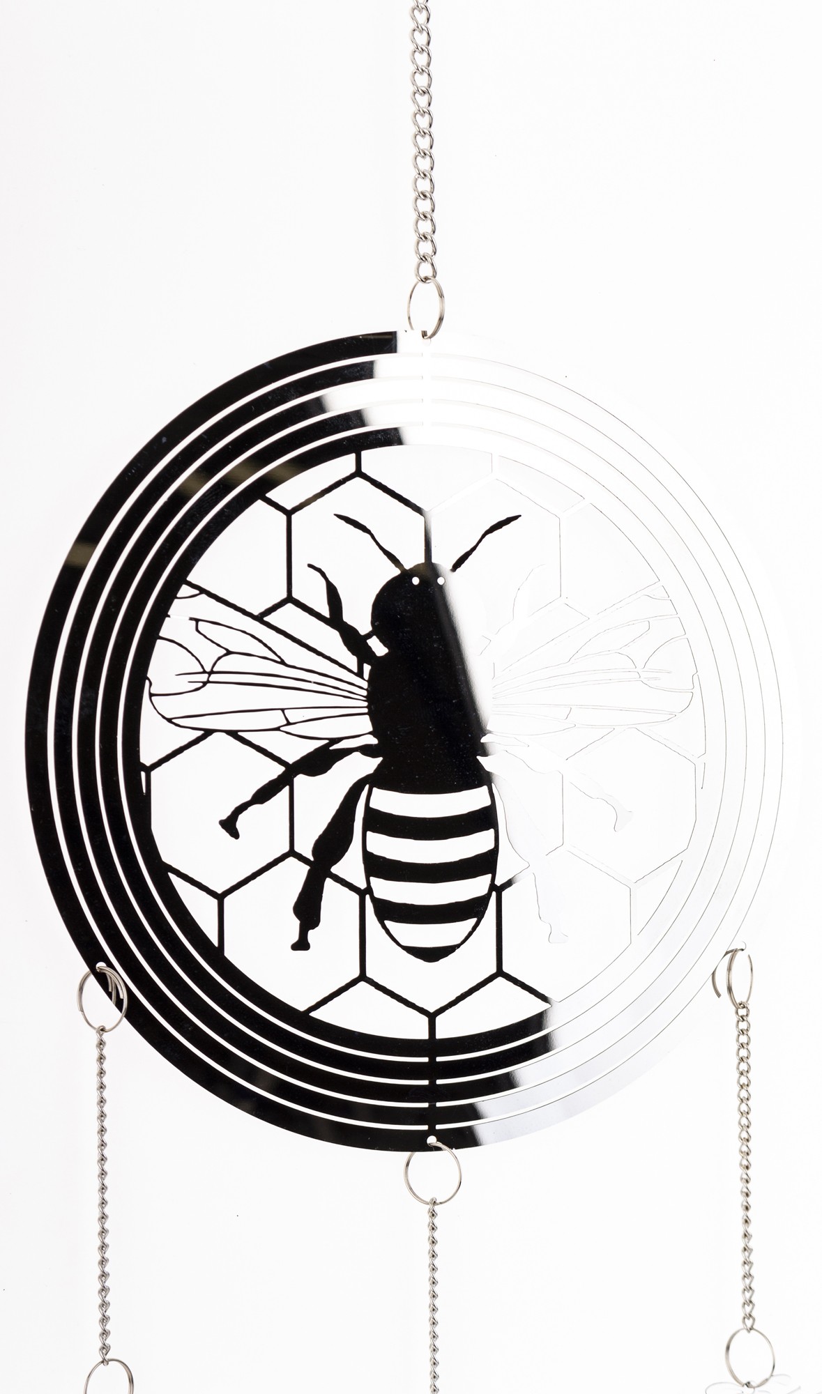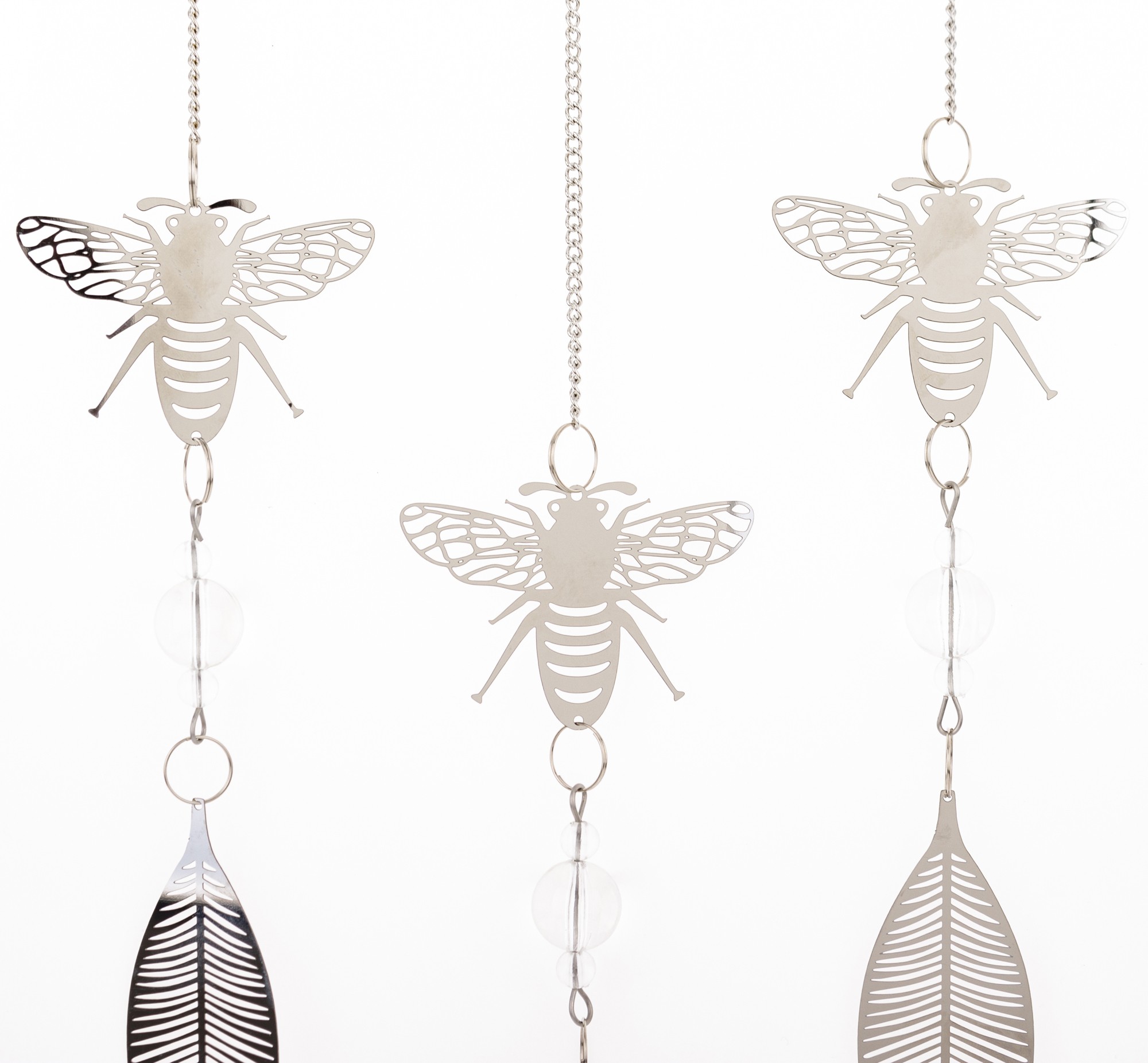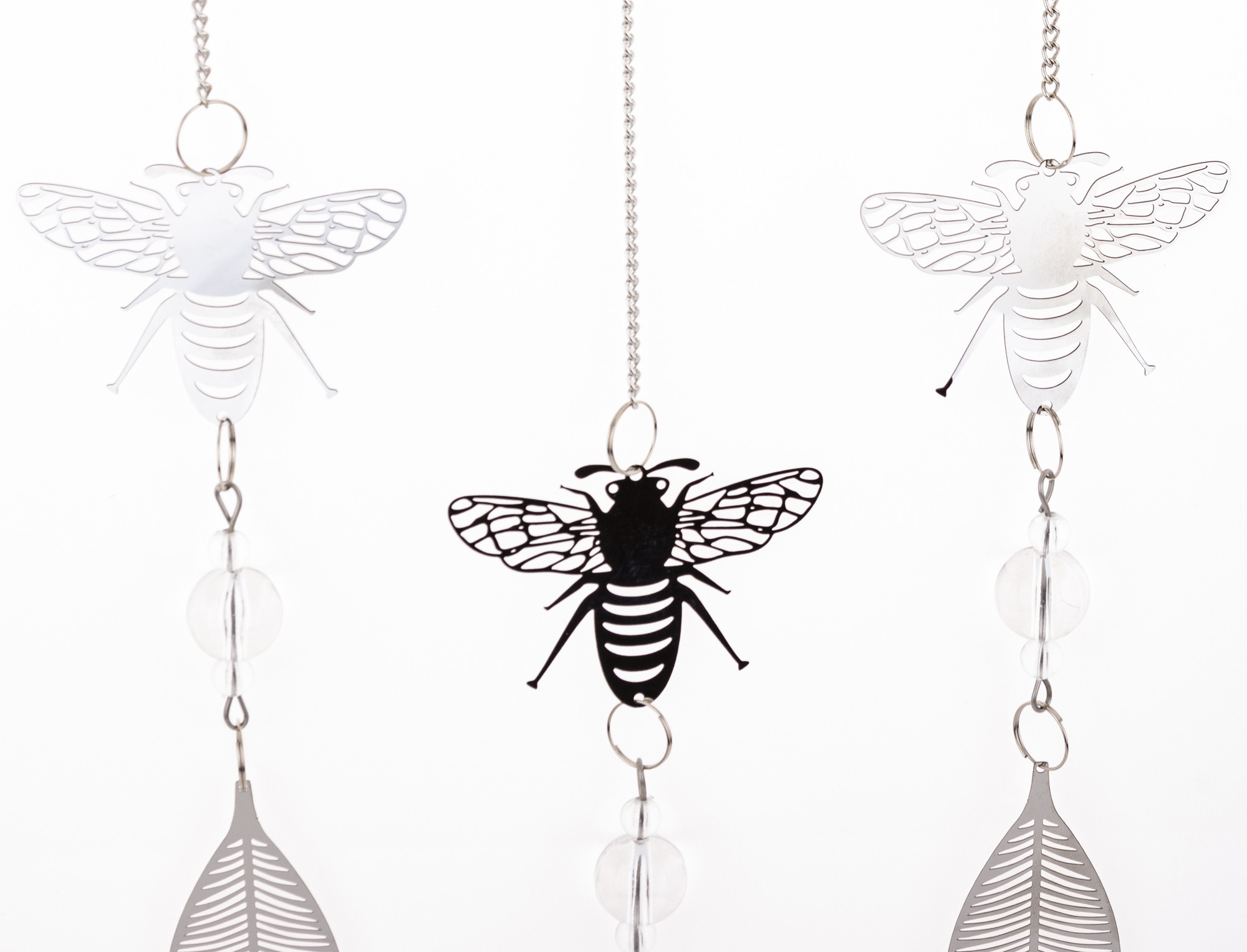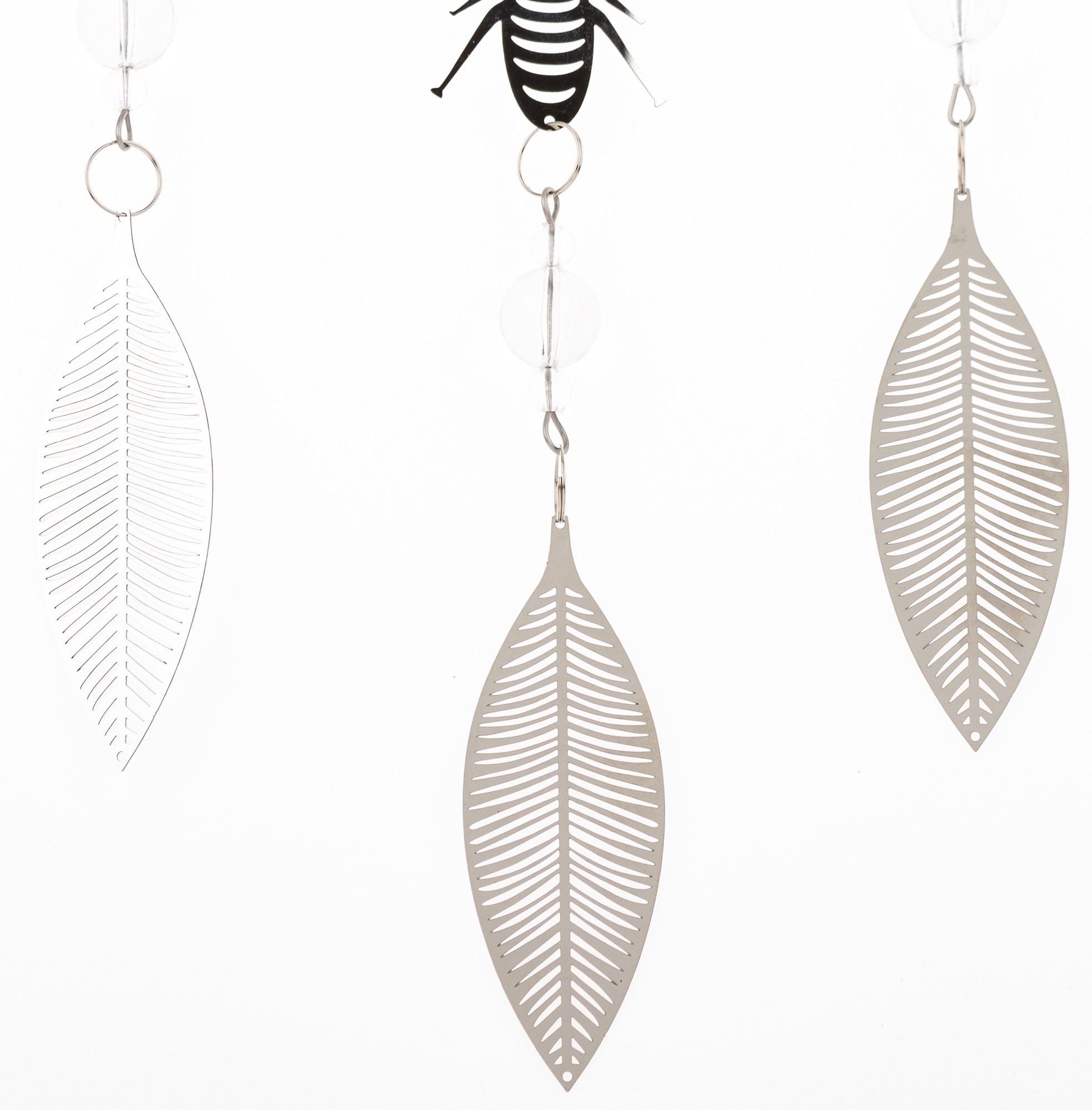 Wyjątkowa wisząca dekoracja w kształcie przypominającym łapacz snów wykonana z cienkiego metalu w eleganckim srebrnym kolorze to doskonały sposób na dodanie charakteru i uroku Twojemu wnętrzu. W dekoracji dominuje pszczeli motyw- jej głównym elementem jest koło, w którym umieszczona jest pszczoła na plastrze miodu. Z koła wychodzą trzy łańcuszki, na każdym z nich zawieszona jest pszczoła, a zakończone są one delikatnymi listkami, co nadaje dekoracji lekkości i naturalnego uroku.