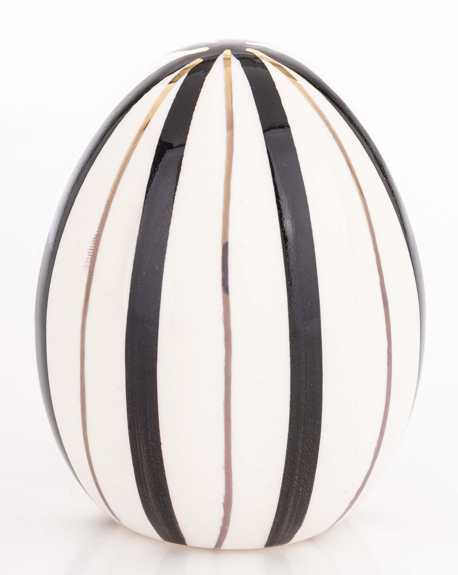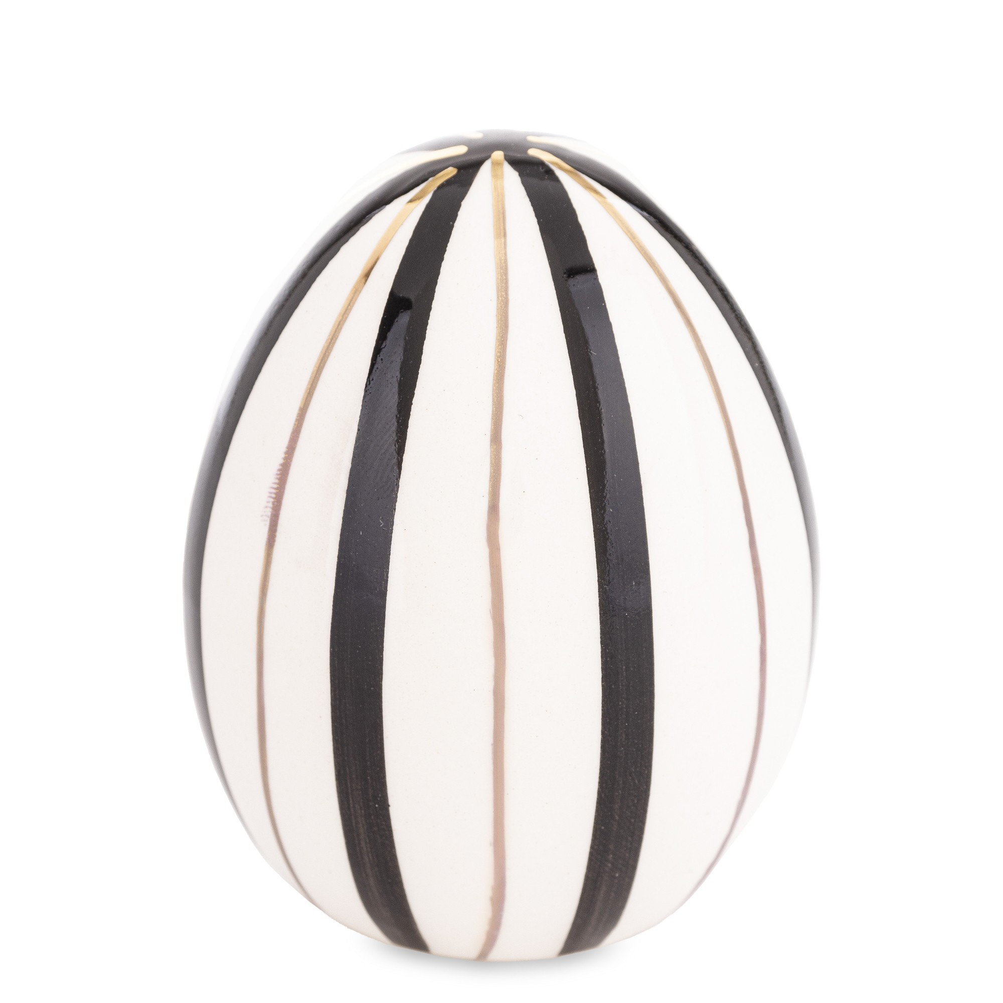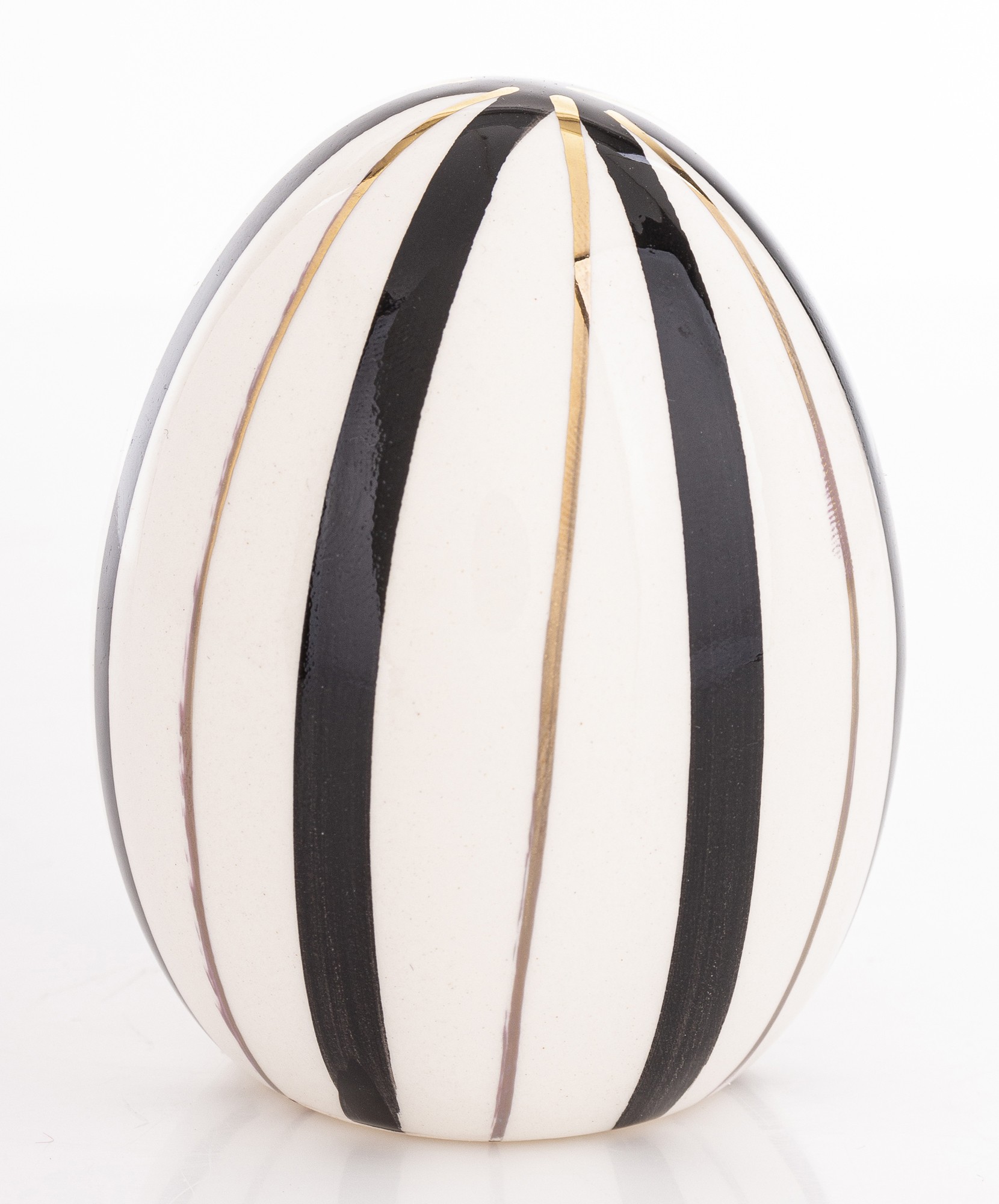 Dekoracyjne Jajko Biało-Czarne EGARA – Graficzna Elegancja z Złotym Akcentem. Odkryj siłę kontrastu i wyrafinowanego wzornictwa. Dekoracyjne Jajko EGARA to unikalna ozdoba, która łączy ponadczasowy duet bieli i czerni z luksusowym wykończeniem, tworząc przyciągający wzrok element dekoracyjny. Figurka charakteryzuje się odważnym, pionowym wzorem pasków. Ten geometryczny, precyzyjny wzór nadaje jajku dynamiki i sprawia, że jest to nie tylko dekoracja, ale małe dzieło sztuki użytkowej.