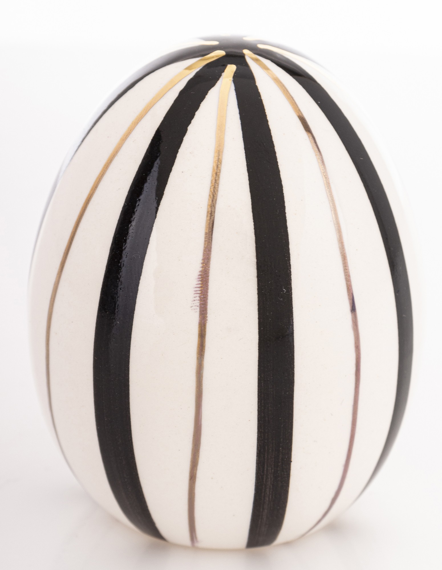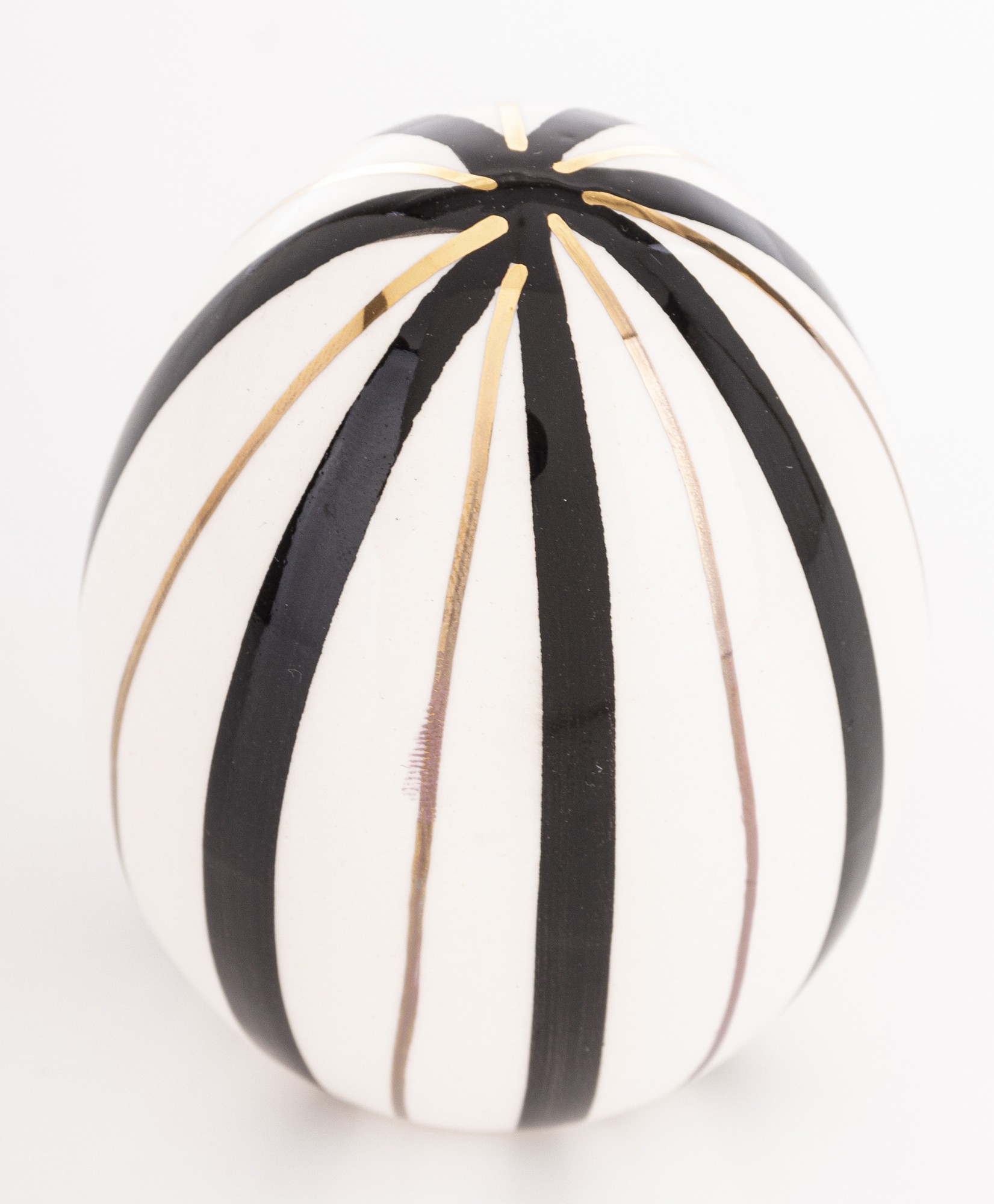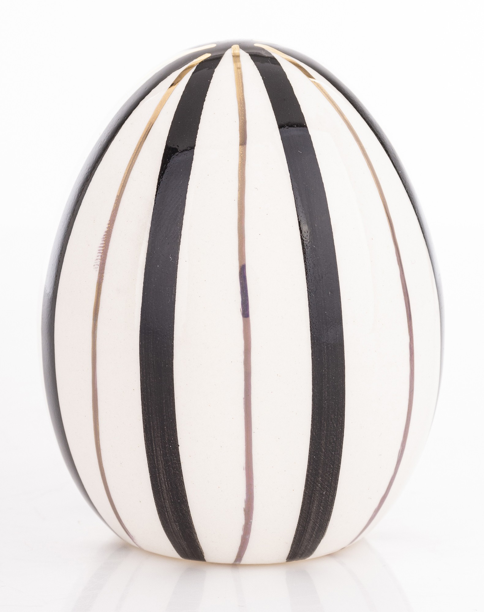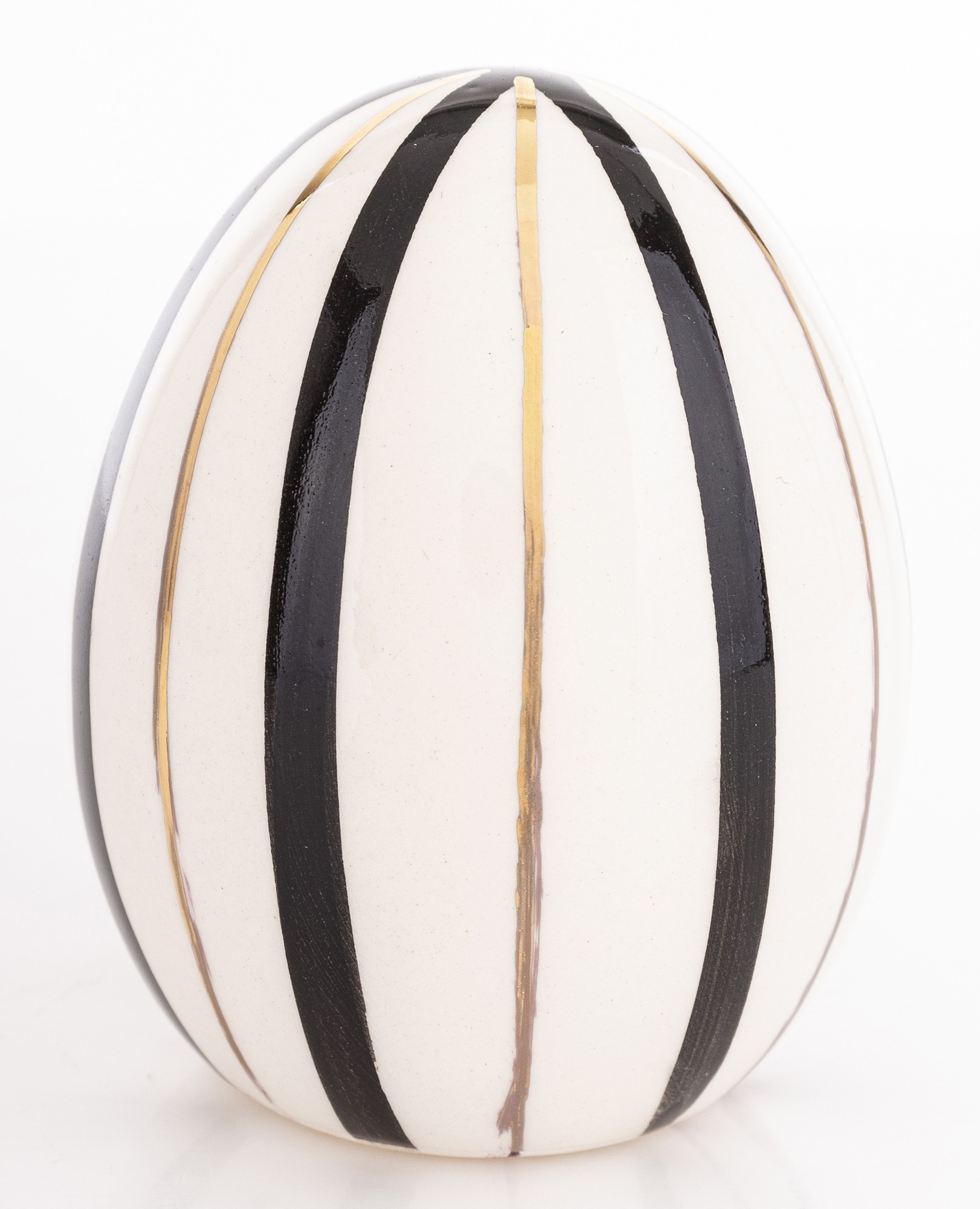 Dekoracyjne Jajko Biało-Czarne EGARA – Graficzna Elegancja z Złotym Akcentem. Odkryj siłę kontrastu i wyrafinowanego wzornictwa. Dekoracyjne Jajko EGARA to unikalna ozdoba, która łączy ponadczasowy duet bieli i czerni z luksusowym wykończeniem, tworząc przyciągający wzrok element dekoracyjny. Figurka charakteryzuje się odważnym, pionowym wzorem pasków. Ten geometryczny, precyzyjny wzór nadaje jajku dynamiki i sprawia, że jest to nie tylko dekoracja, ale małe dzieło sztuki użytkowej.