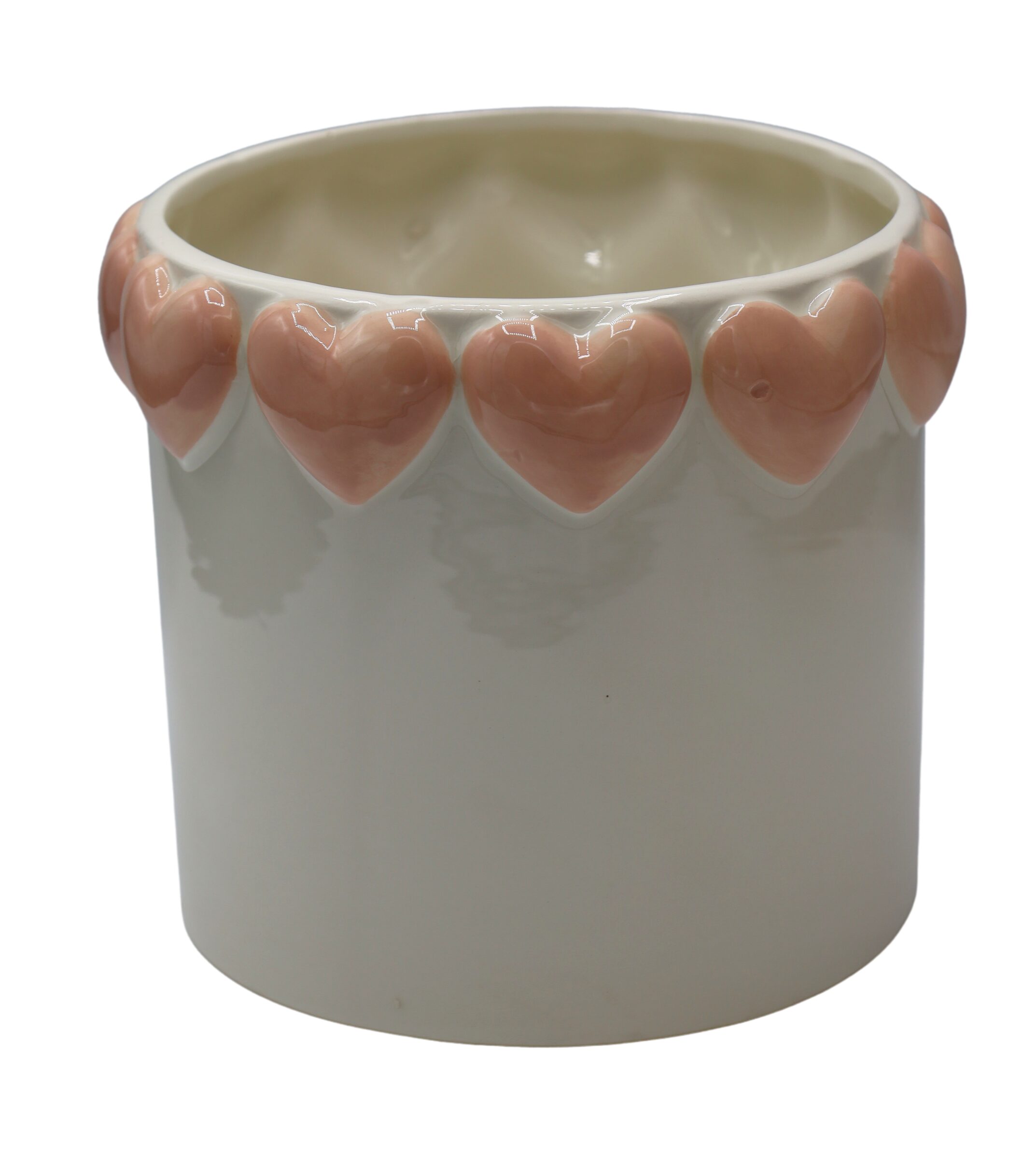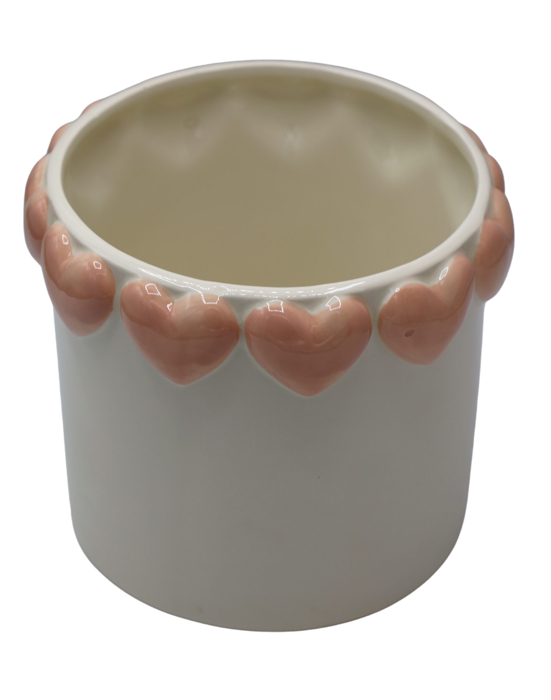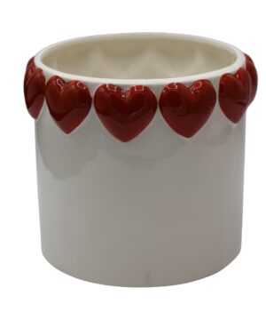Mała doniczka ceramiczna OSKOL w kolorze białym, ozdobiona rzędem wypukłych, różowych serduszek umieszczonych na górnej krawędzi. Doniczka ma prosty, cylindryczny kształt, co sprawia, że jest elegancka i uniwersalna. Różowe serduszka dodają jej uroku i romantycznego charakteru, co czyni ją idealnym dodatkiem do wnętrz, szczególnie w okresie walentynek lub jako prezent dla ukochanej osoby. Doniczka może być używana do małych roślin doniczkowych, sukulentów lub jako dekoracyjny pojemnik.