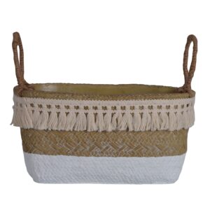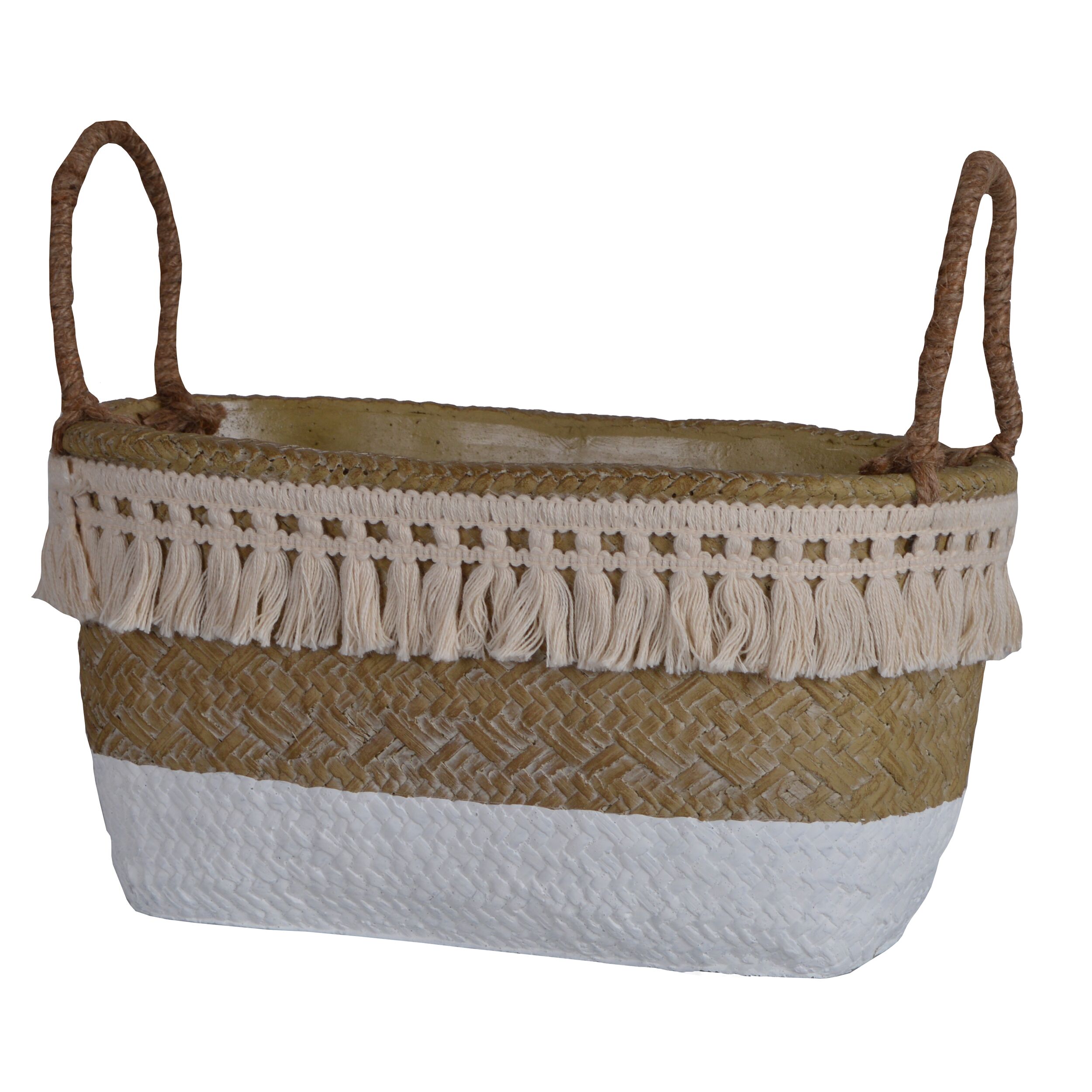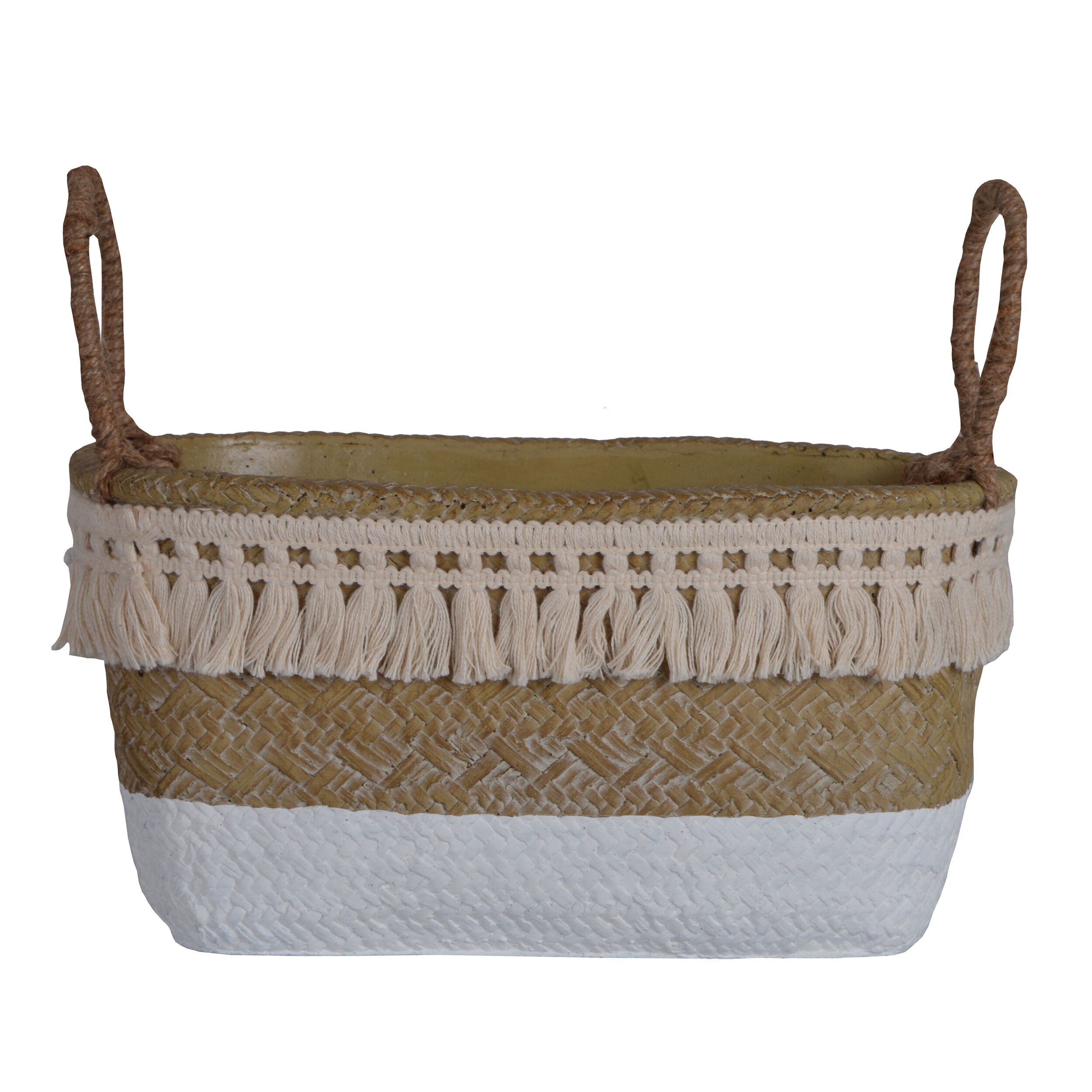 Doniczka ceramiczna w stylu boho o podłużnym kształcie, w kolorach beżu i bieli, w dużym rozmiarze, to imponujący element dekoracyjny, który wyróżni się w każdym wnętrzu.