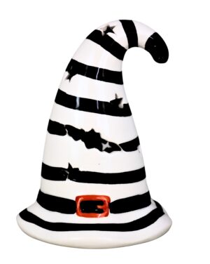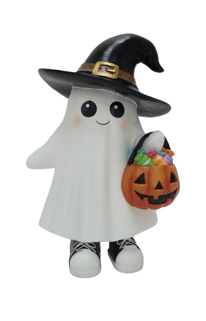 Poznaj DUSZKA OREKA W KAPELUSZU – dekorację, która zachwyca nie tylko halloweenowym klimatem, ale też wyjątkową osobowością. Ten biały duszek o zaokrąglonym kształcie i miękkich liniach ubrany jest w czarny kapelusz czarownicy z brązowym paskiem i złotą klamrą. Jego duże, błyszczące oczy i rumiane policzki nadają mu przyjazny, figlarny wyraz twarzy, który z pewnością wywoła uśmiech na twarzy każdego gościa.