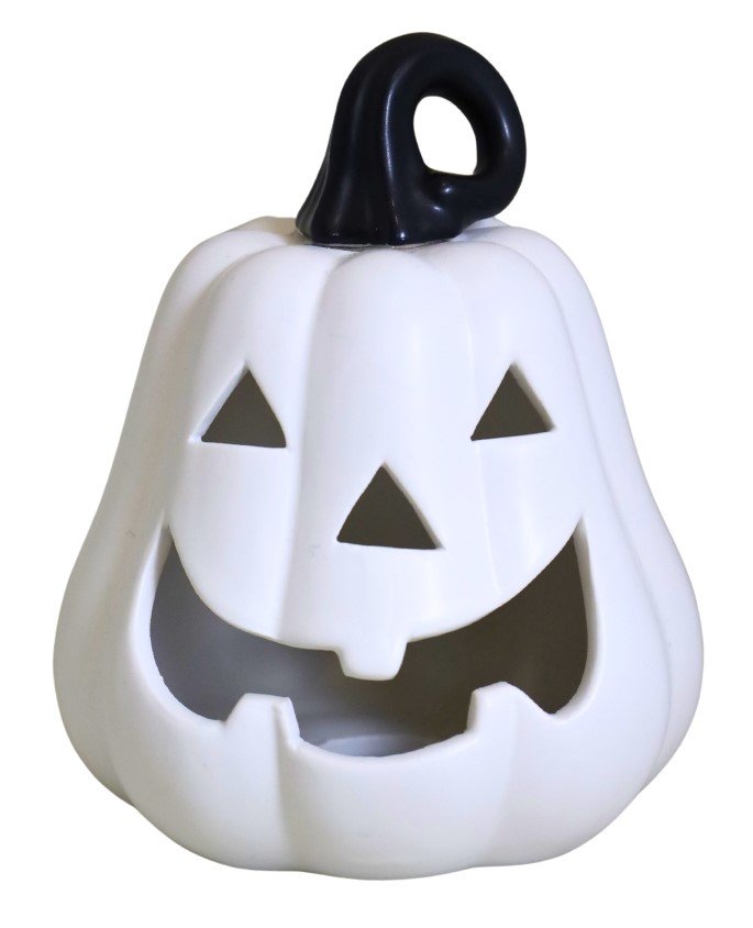 DYNIA CERAMICZNA VANDI BIAŁO-CZARNA LED to stylowa dekoracja halloweenowa z efektem świetlnym. Wykonana z białej ceramiki z czarnym trzonkiem, posiada klasyczny wyraz twarzy jack-o’-lanterna, który rozświetla się ciepłym światłem LED – idealna na jesienne wieczory.