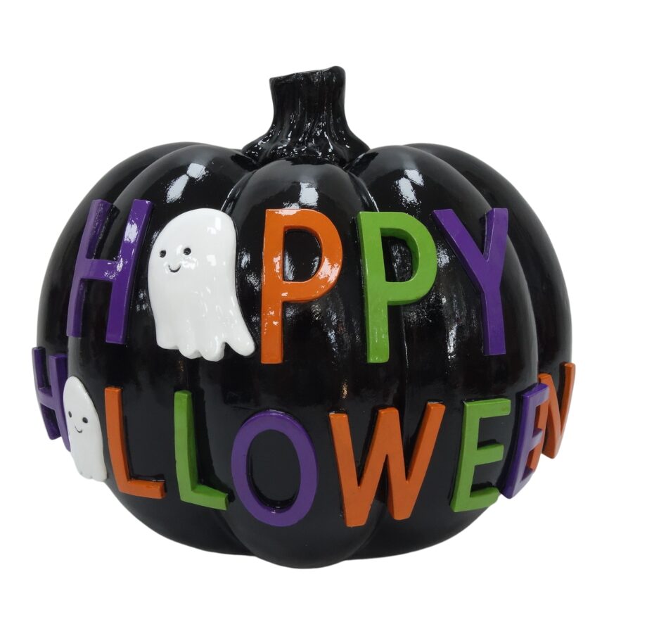 DYNIA CZARNA „HAPPY HALLOWEEN” BLACK to nietuzinkowa dekoracja halloweenowa, która łączy klasyczne motywy z nowoczesnym, pastelowym stylem. Czarna dynia z kolorowym napisem i uroczymi duszkami to idealny akcent do wnętrz w stylu glamour lub boho.