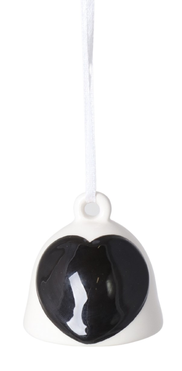 Dzwoneczek AMOUR to subtelna ceramiczna zawieszka w bieli z kontrastowym czarnym sercem. Idealna jako dekoracja na Walentynki, święta lub do wnętrz w stylu romantycznego minimalizmu.