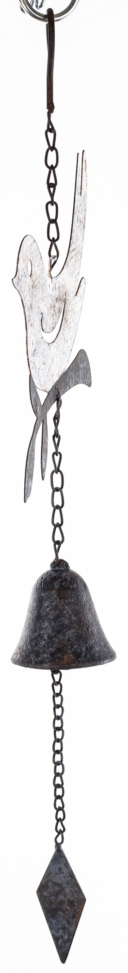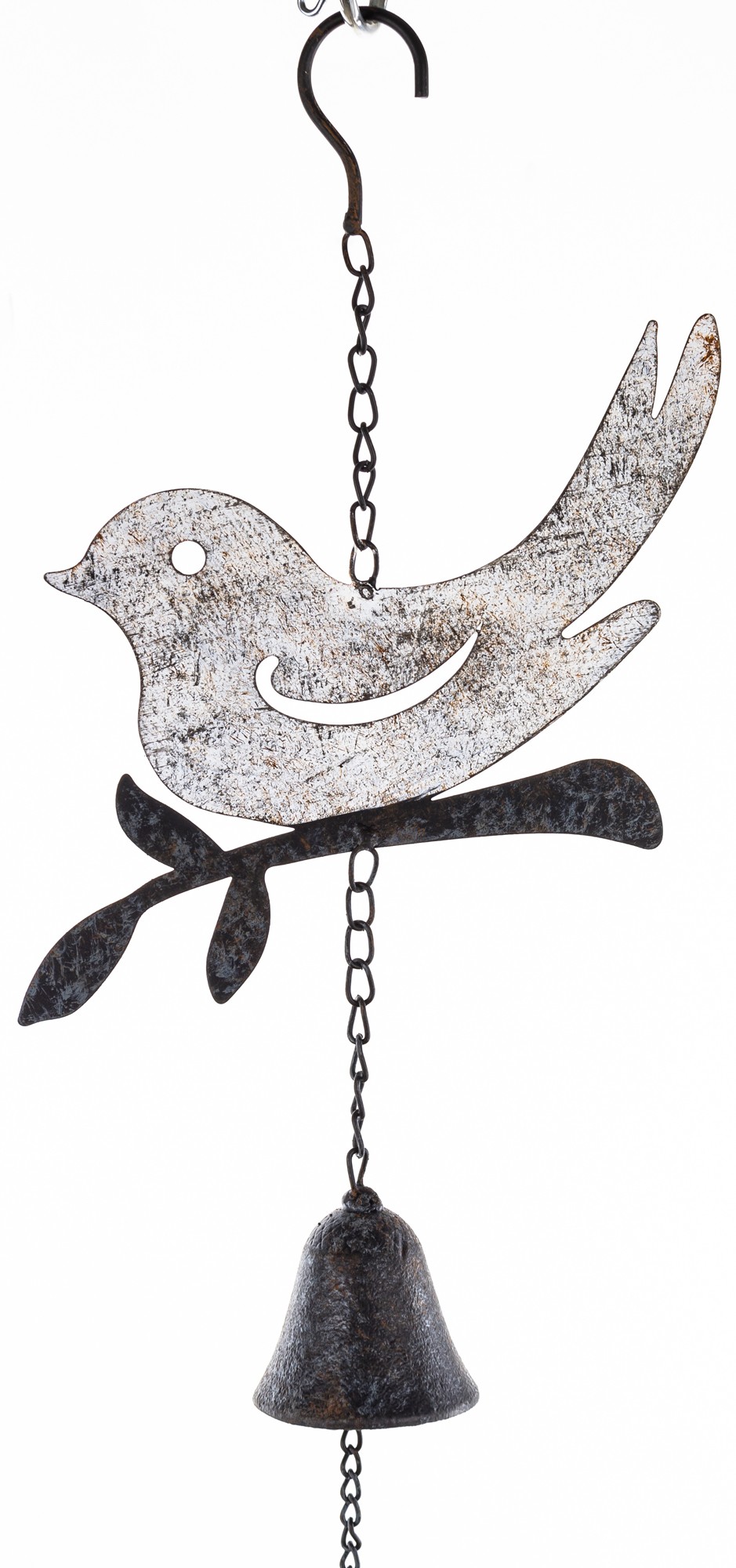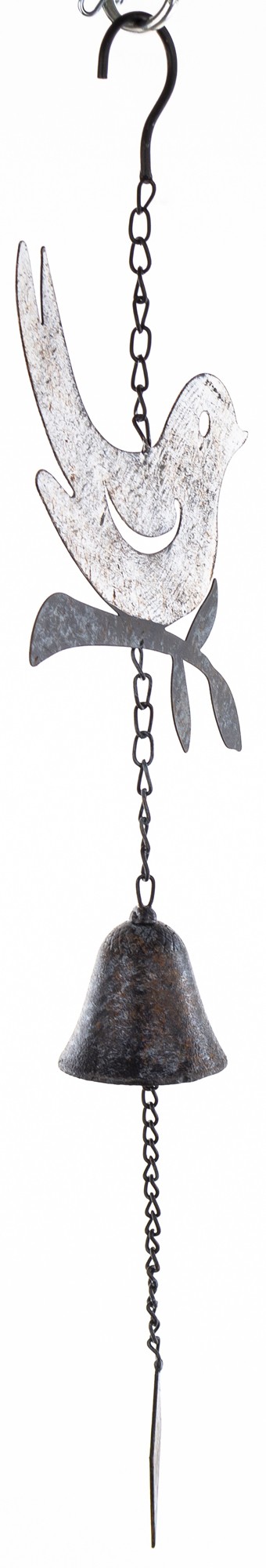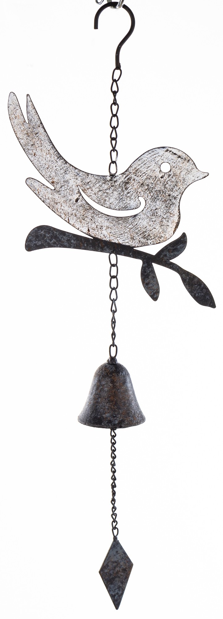 Metalowa dekoracja wisząca, której centralnym elementem jest ptak siedzący na gałązce, to piękny i unikalny dodatek do Twojego ogrodu lub balkonu. Do ptaka doczepiony jest dzwonek, który pobrzękuje na wietrze. Ta ozdoba doskonale komponuje się z zielenią roślin i kwiatów, podkreślając ich piękno. Dekoracja jest wykonana z metalu w srebrnym kolorze, ale z efektem postarzenia materiału. Można ją zawiesić w ogrodzie, na tarasie lub balkonie, dodając przestrzeni wyjątkowego charakteru.