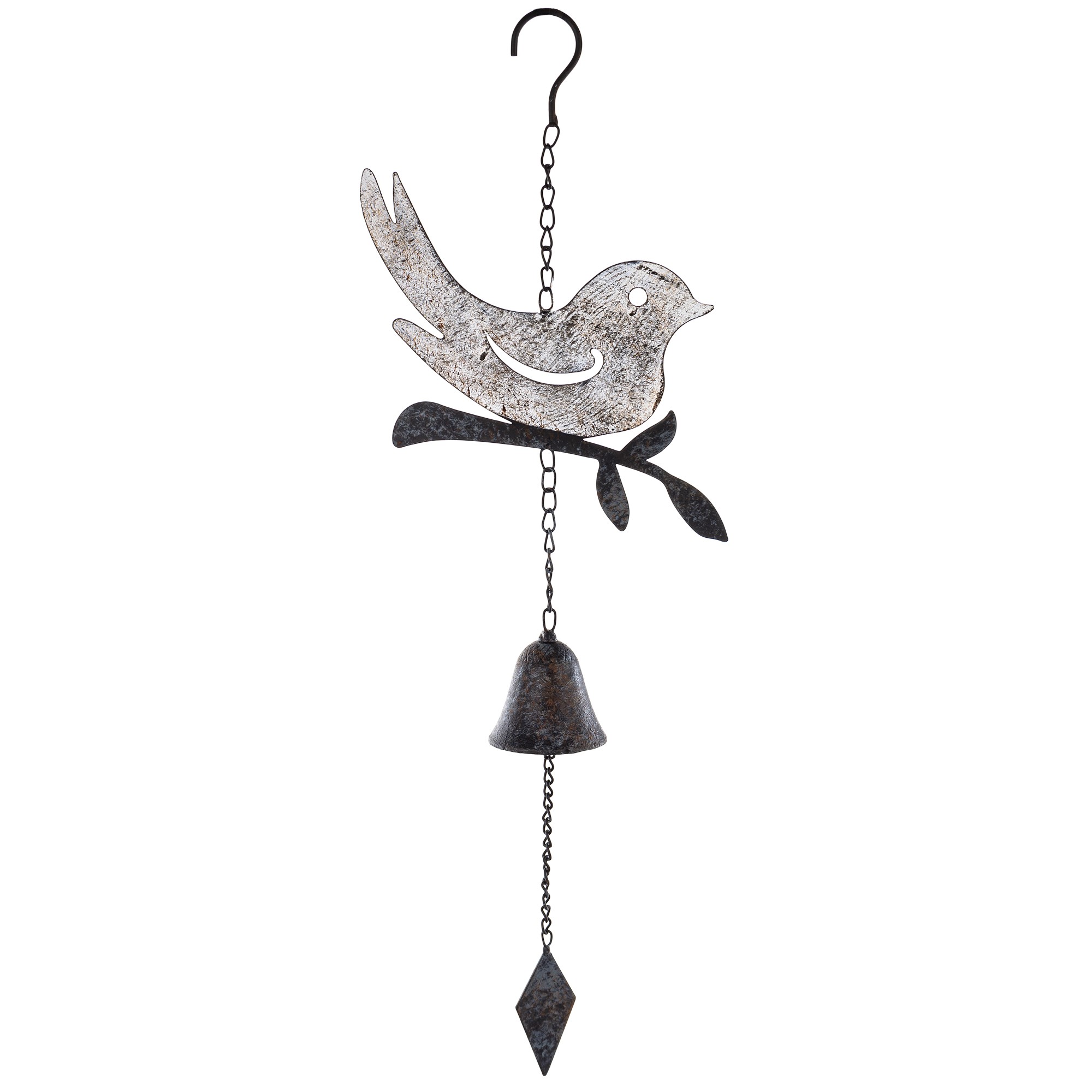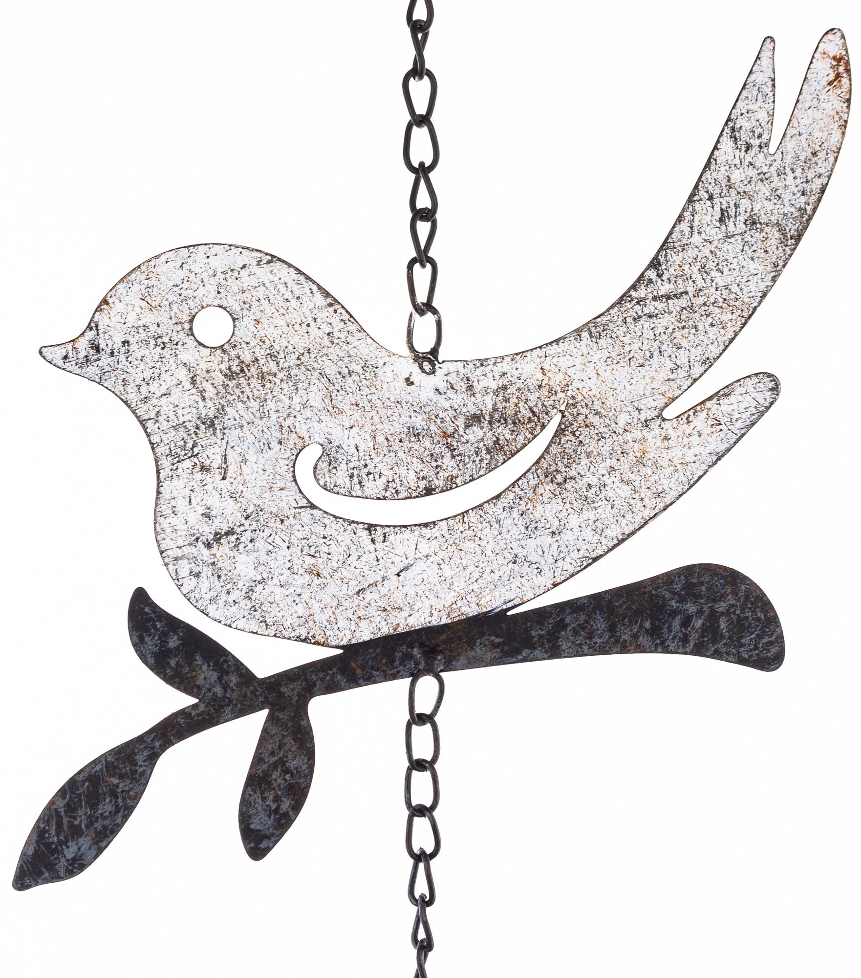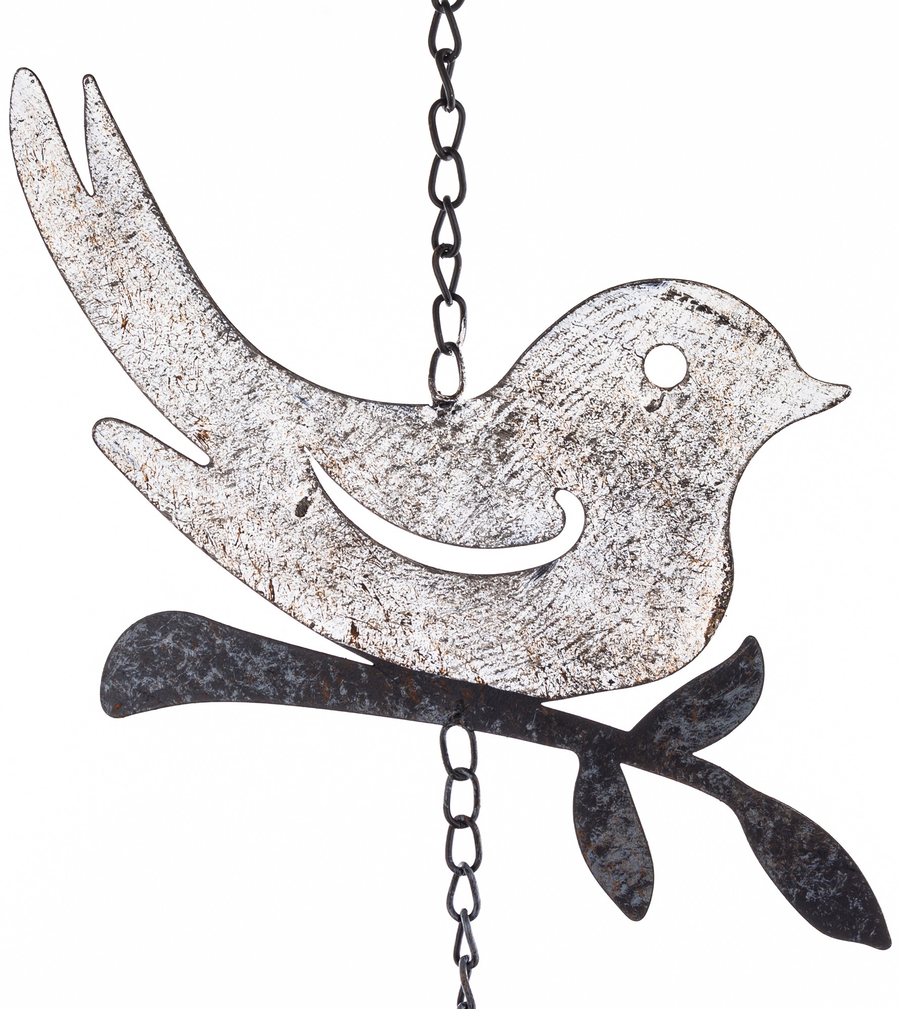 Metalowa dekoracja wisząca, której centralnym elementem jest ptak siedzący na gałązce, to piękny i unikalny dodatek do Twojego ogrodu lub balkonu. Do ptaka doczepiony jest dzwonek, który pobrzękuje na wietrze. Ta ozdoba doskonale komponuje się z zielenią roślin i kwiatów, podkreślając ich piękno. Dekoracja jest wykonana z metalu w srebrnym kolorze, ale z efektem postarzenia materiału. Można ją zawiesić w ogrodzie, na tarasie lub balkonie, dodając przestrzeni wyjątkowego charakteru.