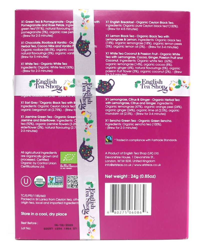 W naszym zestawie prezentowym znajdą Państwo herbaty o wyjątkowych smakach, takie jak: Green Tea & Pomegranate/Chocolate, Rooibos & Vanilla/Pure White Tea/Super Berries/Earl Grey/Jasmine Green Tea/English Breakfast/Lemon Black Tea/White Tea Coconut & Passion Fruit/Perfect Peppermint/Lemongrass, Citrus & Ginger/Sencha Green Tea.
