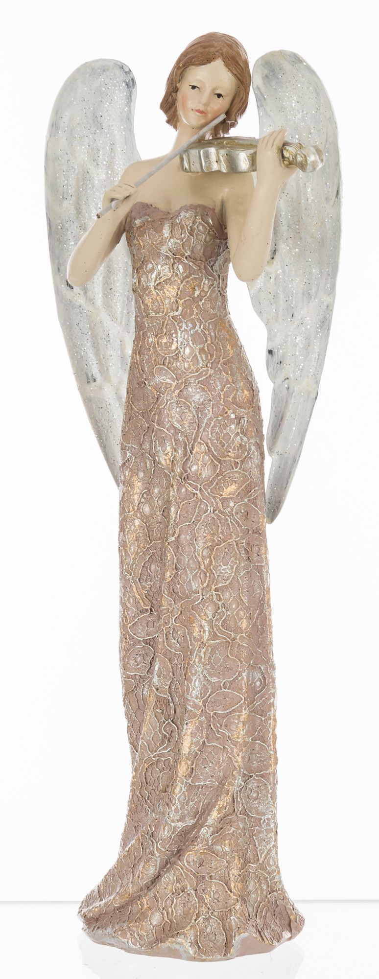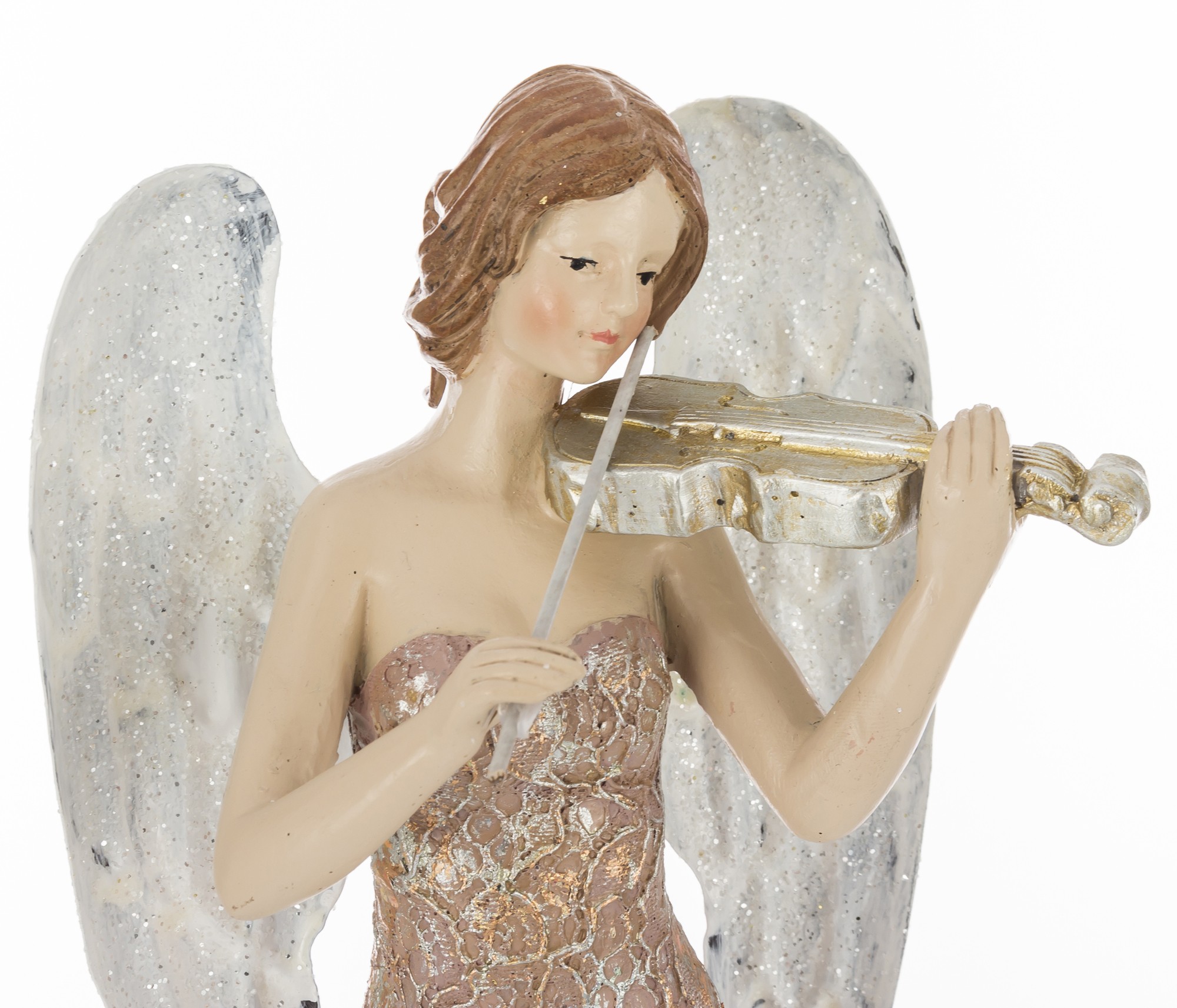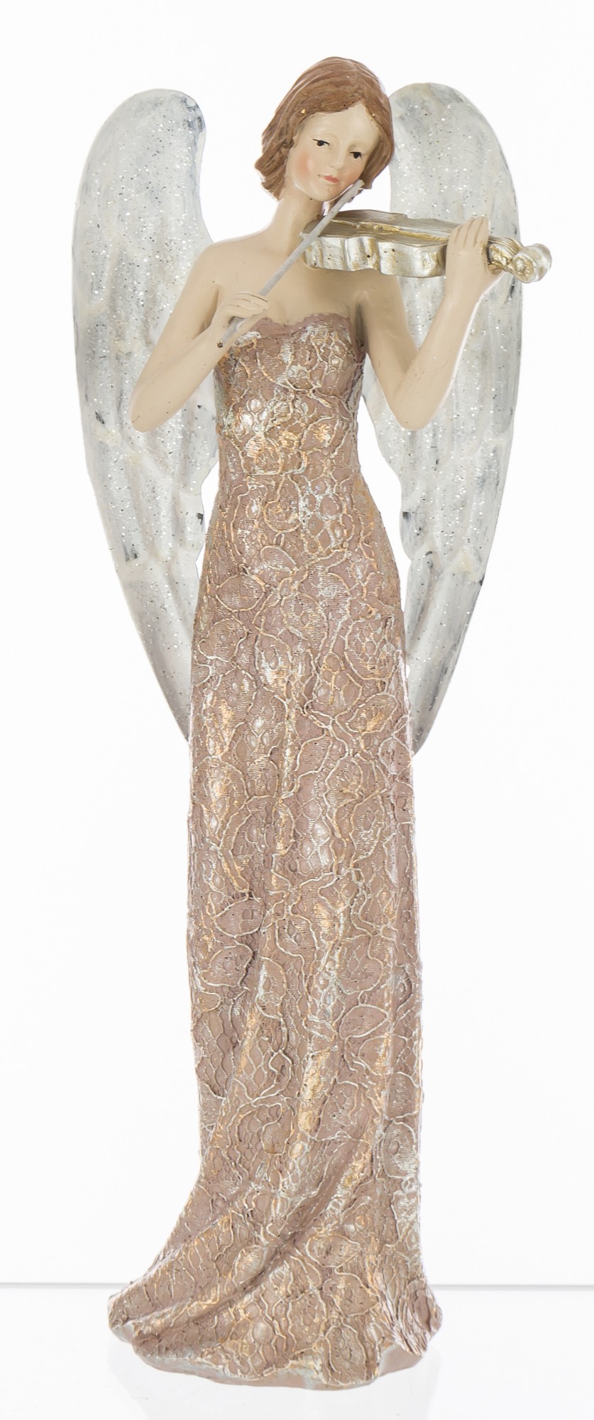 Figurka Anioł-Prom. SKRZYPCE to wyjątkowy element dekoracyjny, który łączy duchowość z artystycznym wyrazem. Przedstawia anioła w długiej, teksturowanej sukni o różowo-złotym odcieniu, grającego na skrzypcach z delikatnym skupieniem i spokojem. Jego srebrzyste skrzydła dodają blasku, a subtelne detale – od rzeźbionych fałd materiału po realistyczne wykończenie instrumentu – świadczą o wysokiej jakości wykonania.