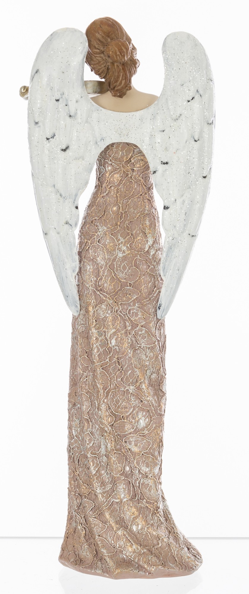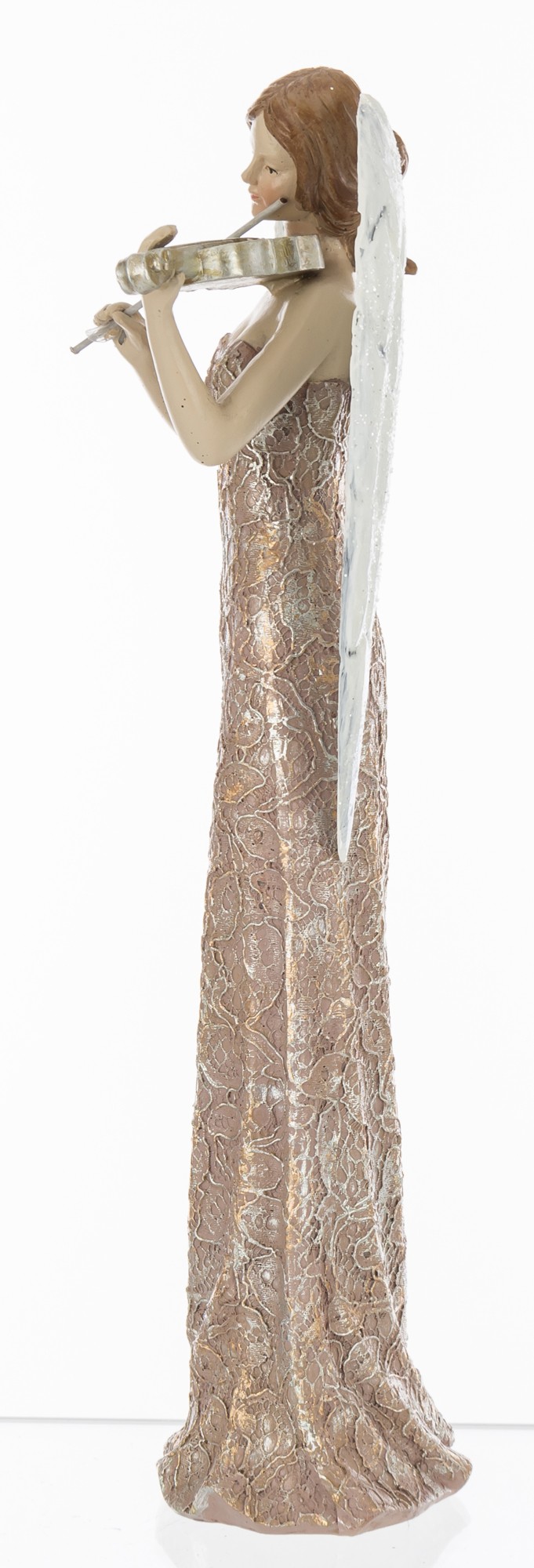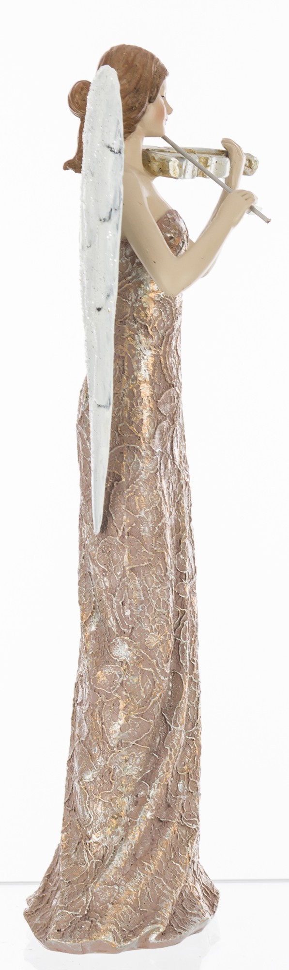 Figurka Anioł-Prom. SKRZYPCE to wyjątkowy element dekoracyjny, który łączy duchowość z artystycznym wyrazem. Przedstawia anioła w długiej, teksturowanej sukni o różowo-złotym odcieniu, grającego na skrzypcach z delikatnym skupieniem i spokojem. Jego srebrzyste skrzydła dodają blasku, a subtelne detale – od rzeźbionych fałd materiału po realistyczne wykończenie instrumentu – świadczą o wysokiej jakości wykonania.