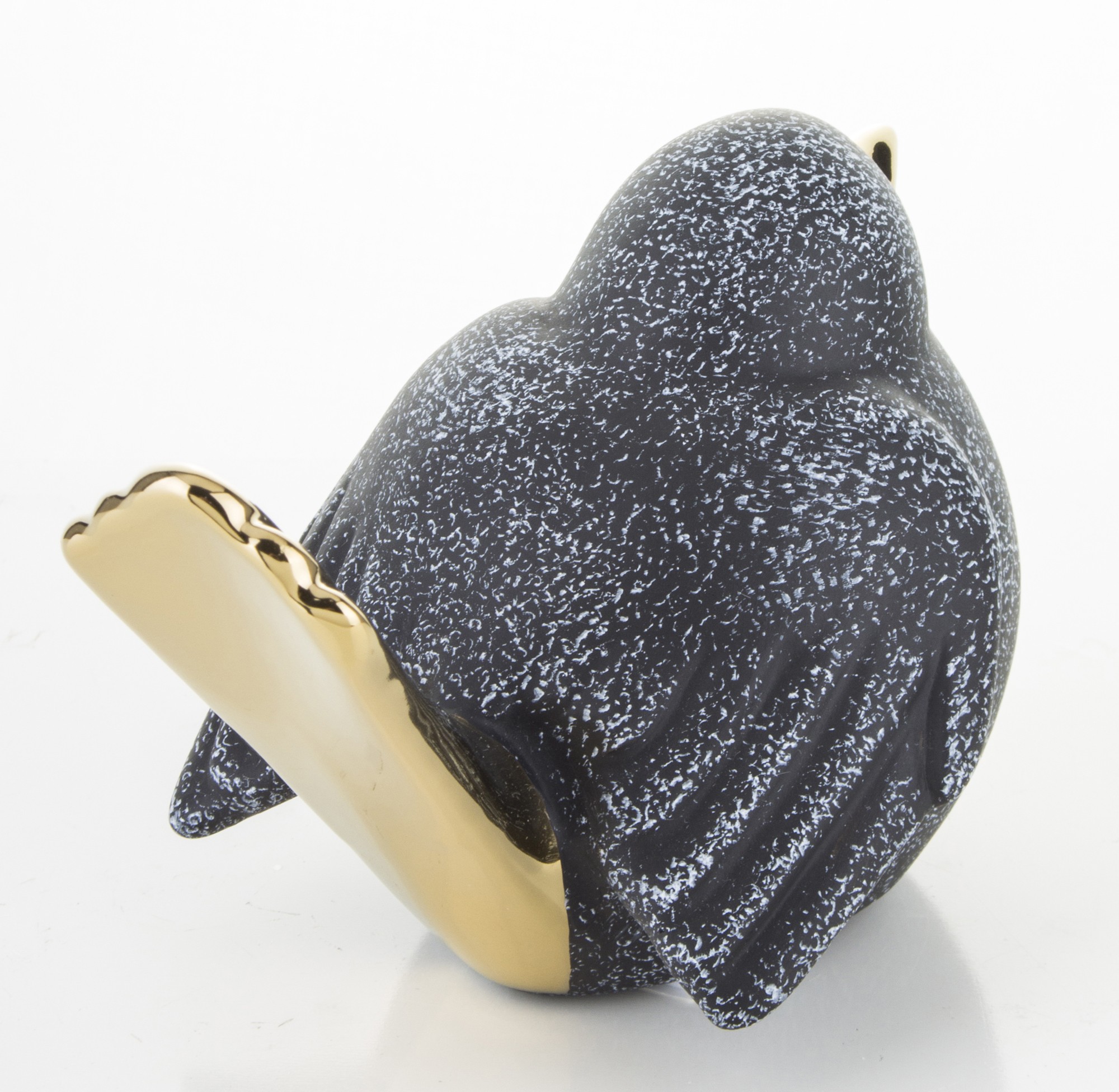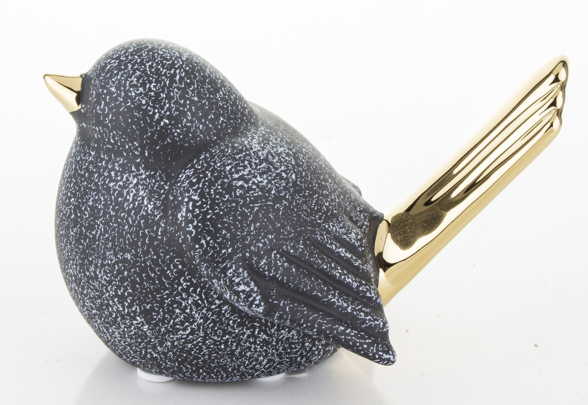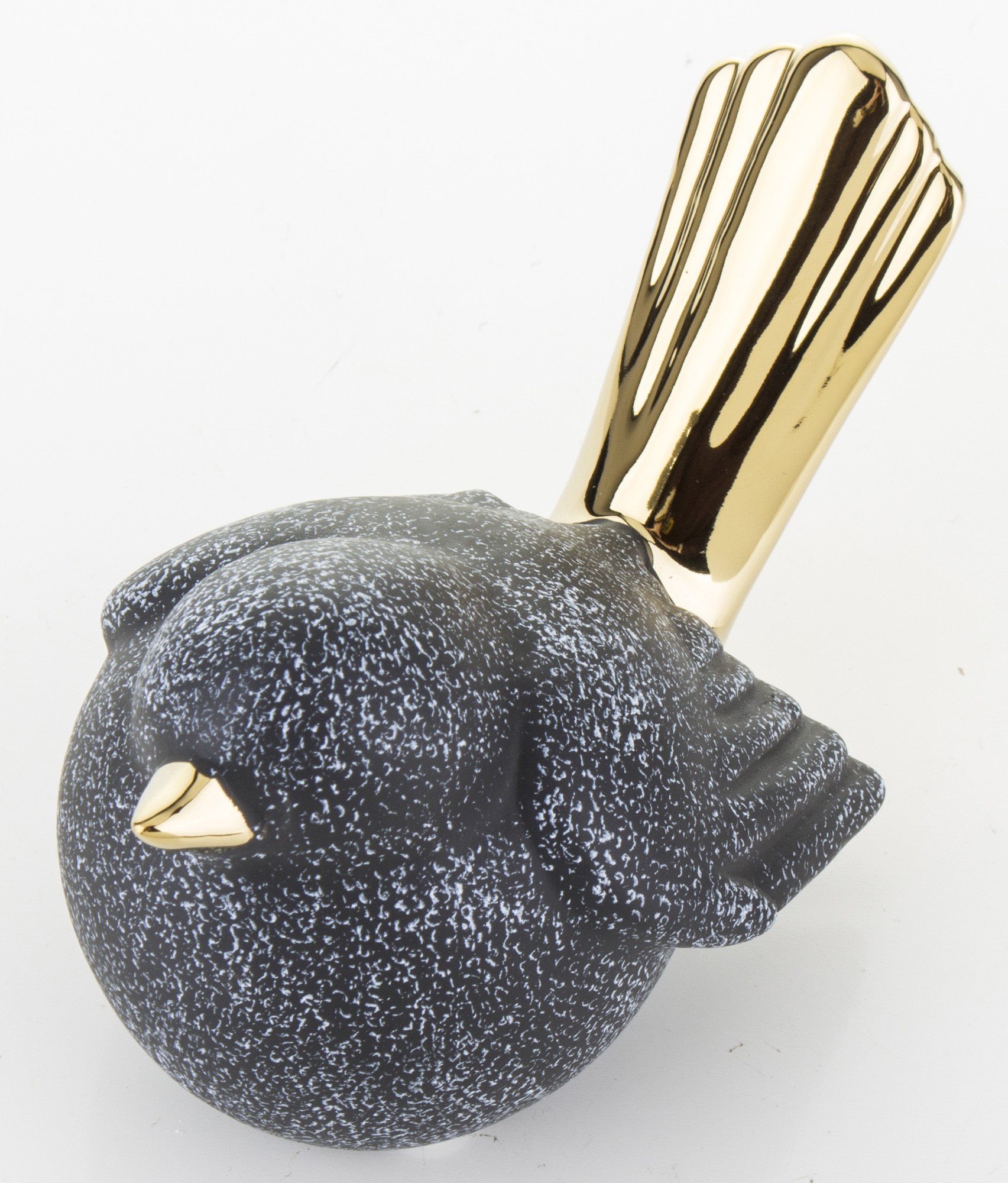 Ceramiczna figurka ptaka w kolorze czarnym z białymi plamkami i złotymi akcentami to elegancki dodatek do każdego wnętrza. Mały złoty dzióbek i długi ogon podkreślają jego wyjątkowy design, a pękaty brzuszek dodaje uroku. Rozmiar figurki to 8x13x8 cm. Idealna na prezent lub do własnej kolekcji.