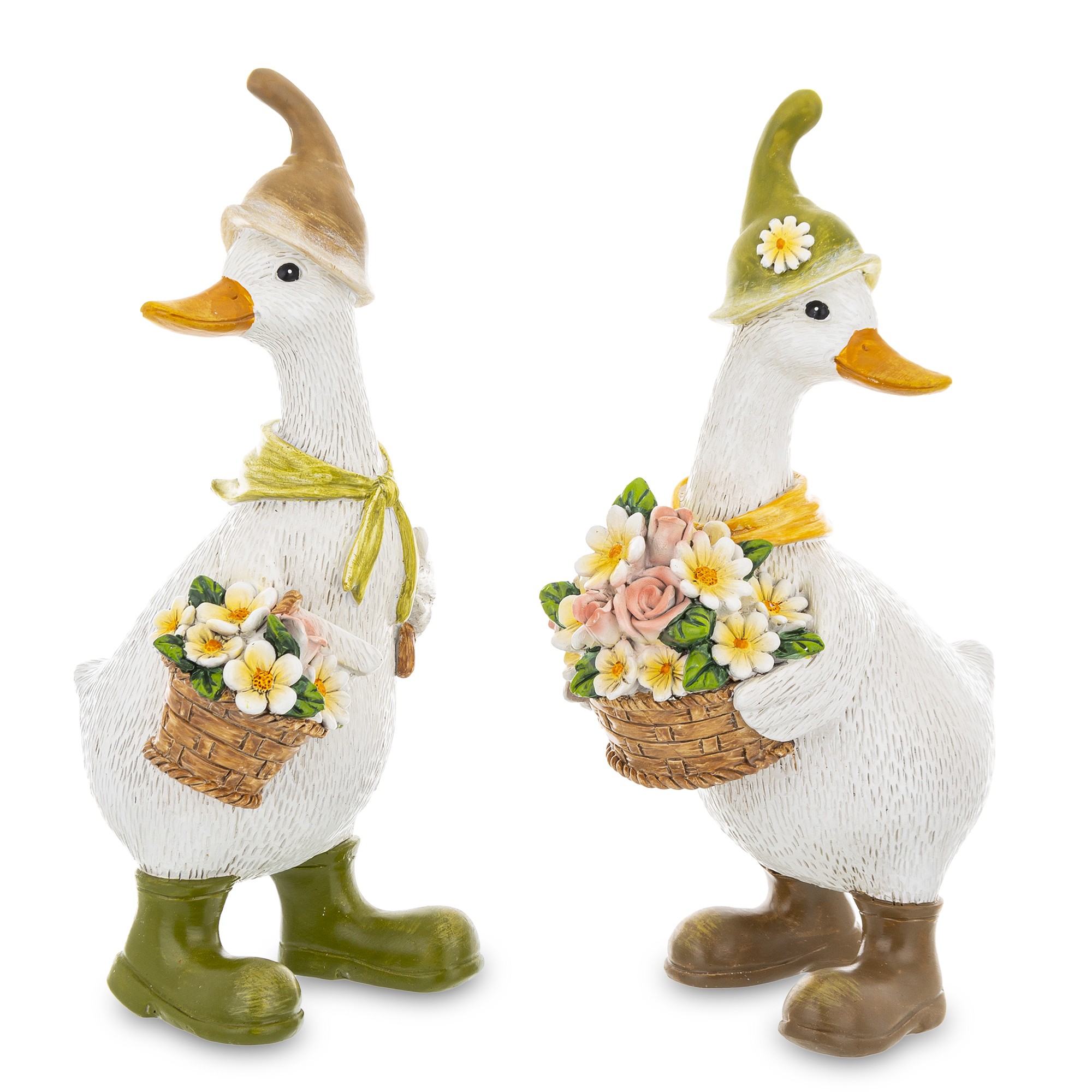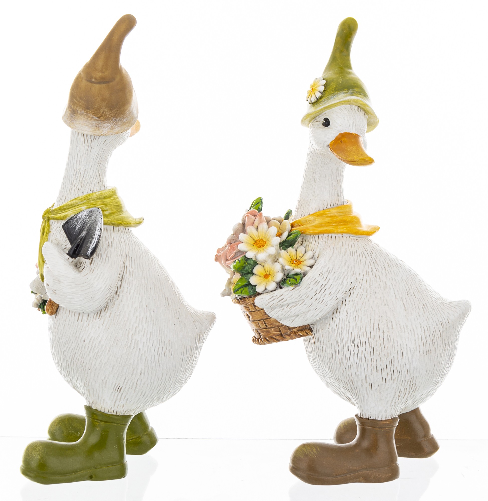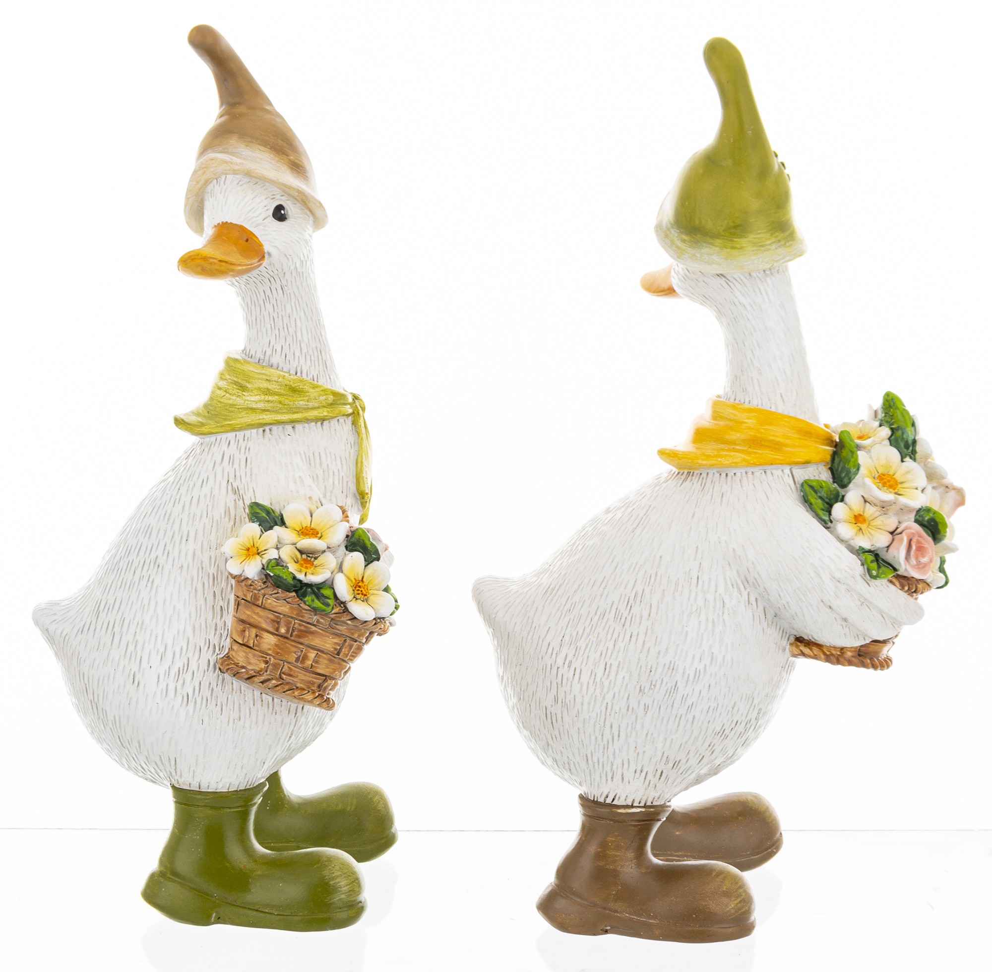 Ta pełna wdzięku figurka przedstawia dwie stylizowane gęsi, które wyglądają jakby właśnie wróciły z kwiatowego targu. Ubrane w kapelusze, szaliki i kalosze, każda z nich trzyma koszyk wypełniony kolorowymi kwiatami – od bieli i żółci po róż i zieleń. Ich postawa, detale stroju i wyraz twarzy tworzą scenkę, która emanuje ciepłem, spokojem i radością.