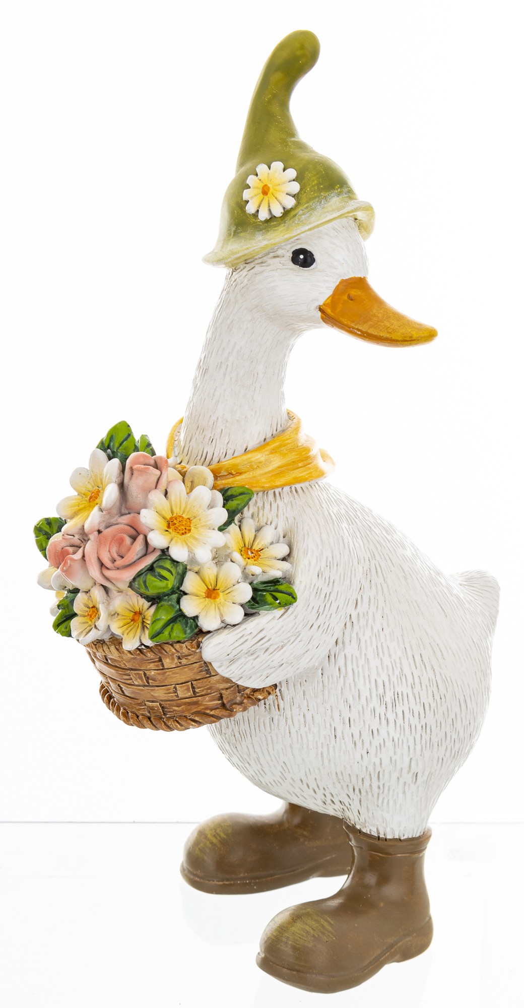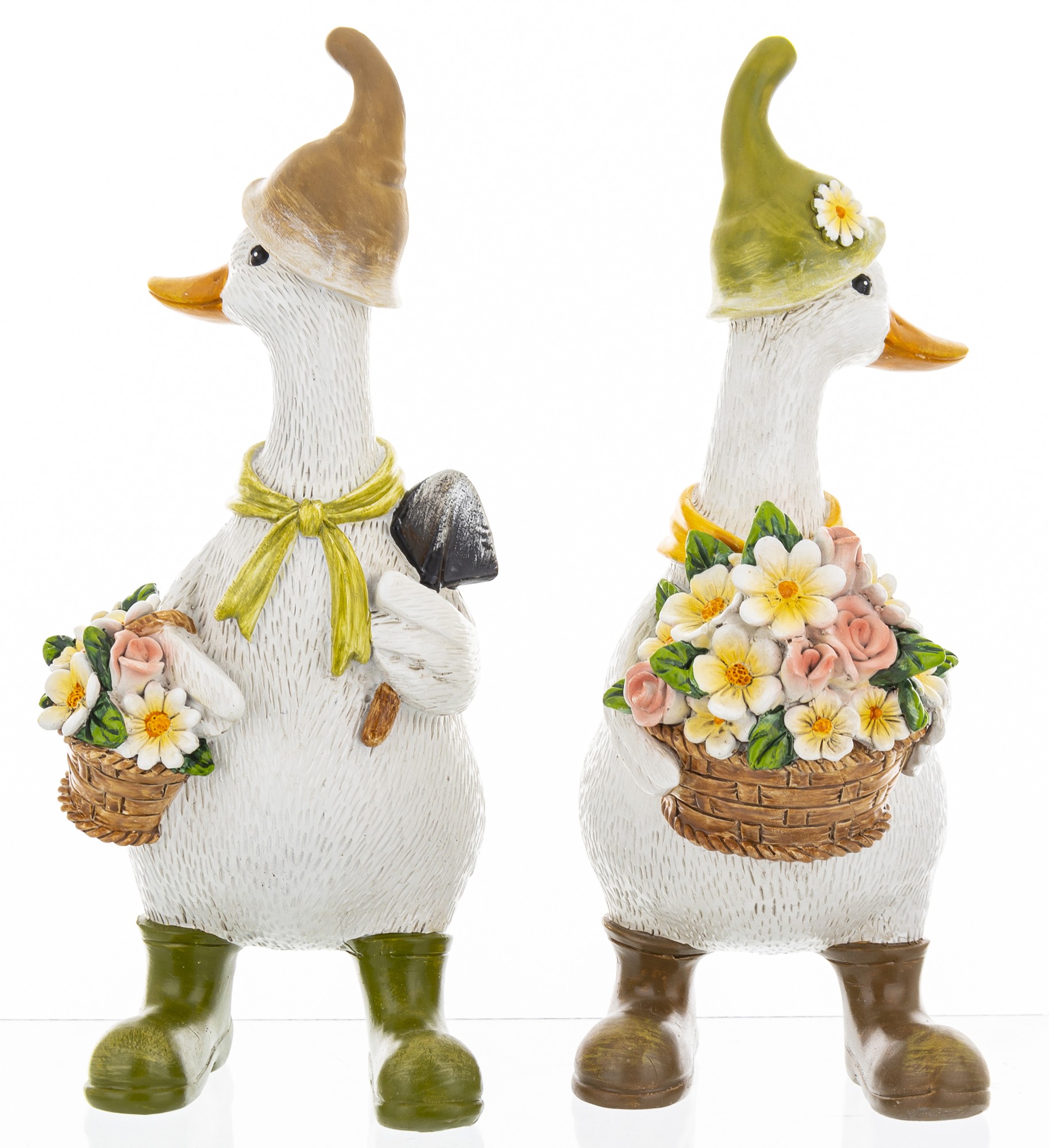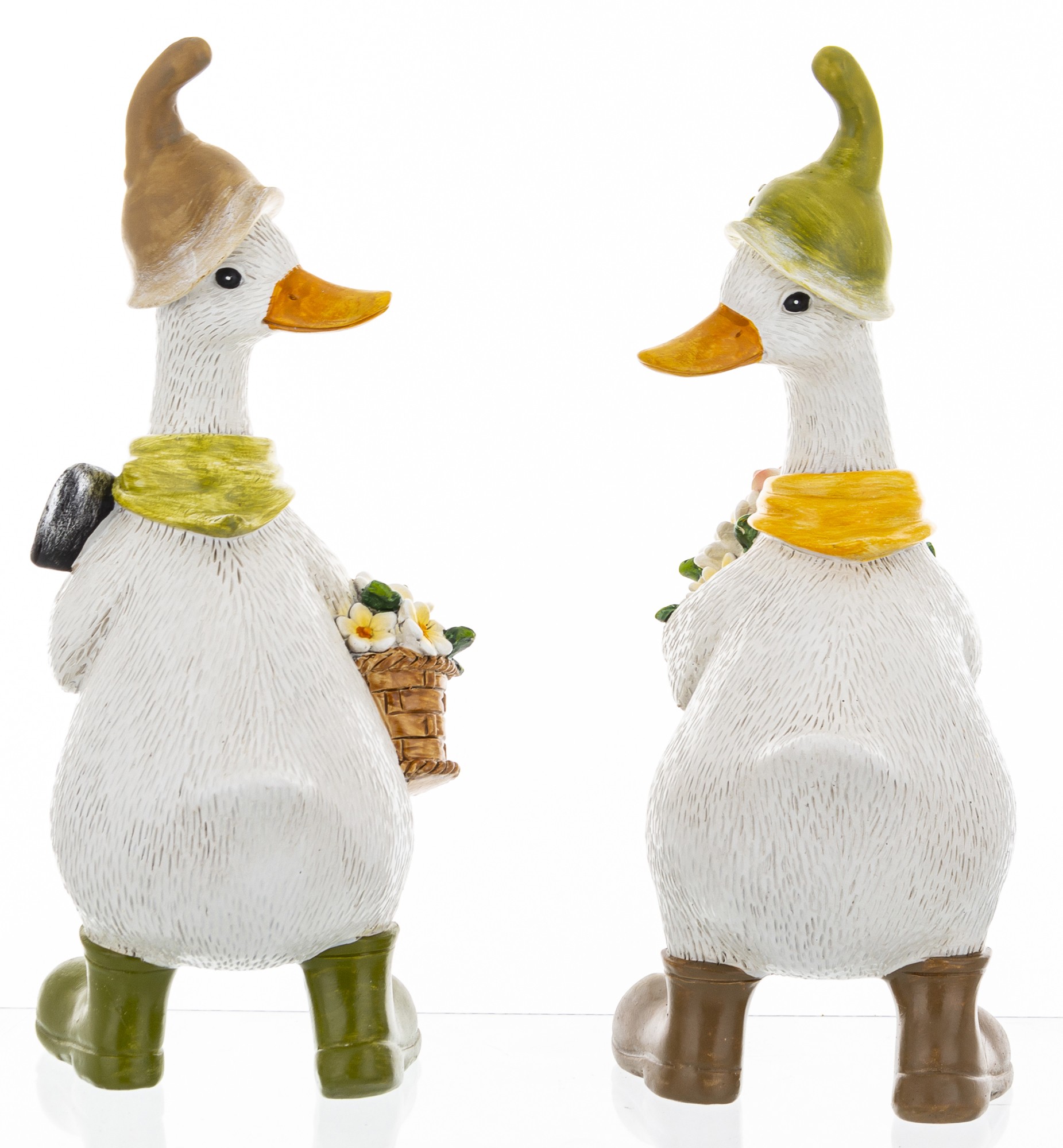 Ta pełna wdzięku figurka przedstawia dwie stylizowane gęsi, które wyglądają jakby właśnie wróciły z kwiatowego targu. Ubrane w kapelusze, szaliki i kalosze, każda z nich trzyma koszyk wypełniony kolorowymi kwiatami – od bieli i żółci po róż i zieleń. Ich postawa, detale stroju i wyraz twarzy tworzą scenkę, która emanuje ciepłem, spokojem i radością.