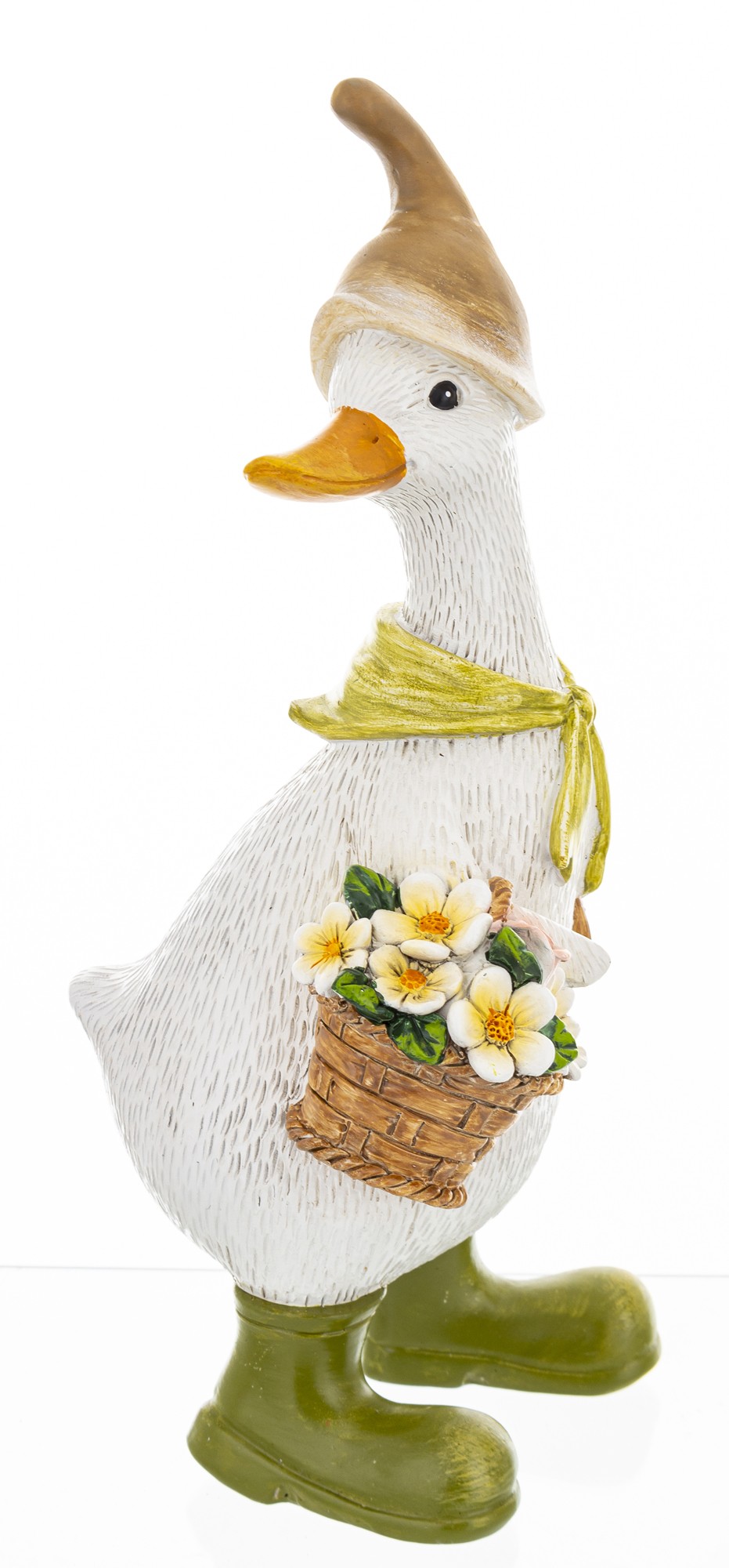 Figurka Gęś KWIATY to dekoracja, która wnosi do wnętrza świeżość i pozytywną energię. Idealna do aranżacji w stylu rustykalnym, romantycznym lub ogrodowym. Świetnie sprawdzi się jako ozdoba parapetu, półki, witryny lub jako prezent dla miłośnika natury, kwiatów i dekoracji z duszą. Dzięki starannemu wykonaniu i dbałości o detale – od faktury piór po realistyczne wykończenie koszyków – przyciąga wzrok i opowiada własną historię o prostych przyjemnościach.