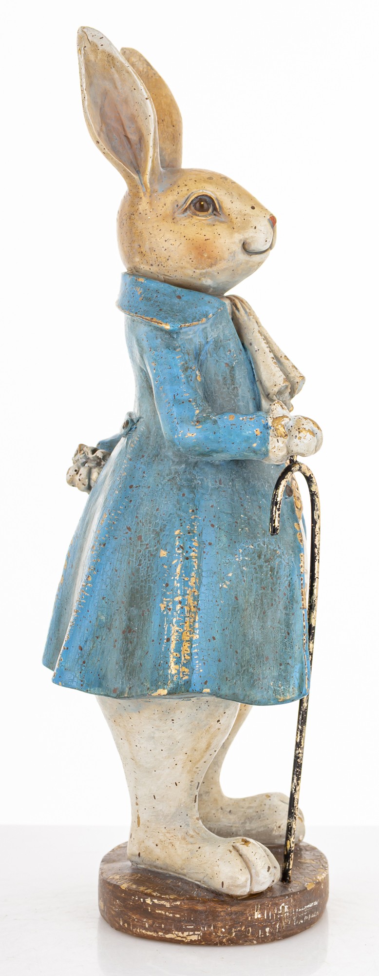Figurka Królik BEAU to dekoracja, która wygląda jak wyjęta z salonu epoki rokokowej. Ten stojący królik, ubrany w błękitny frak z złotymi detalami, wzorzystą kamizelkę i trzymający laskę, prezentuje się z wdziękiem i spokojem. Jego wyprostowana sylwetka, subtelny uśmiech i eleganckie wykończenie sprawiają, że przyciąga wzrok i dodaje wnętrzu wyrafinowanego klimatu.