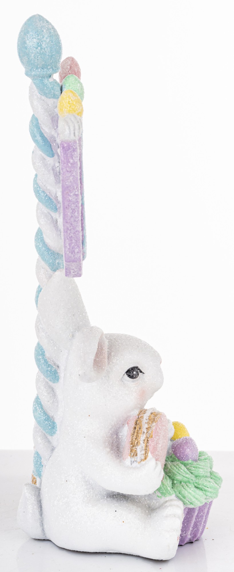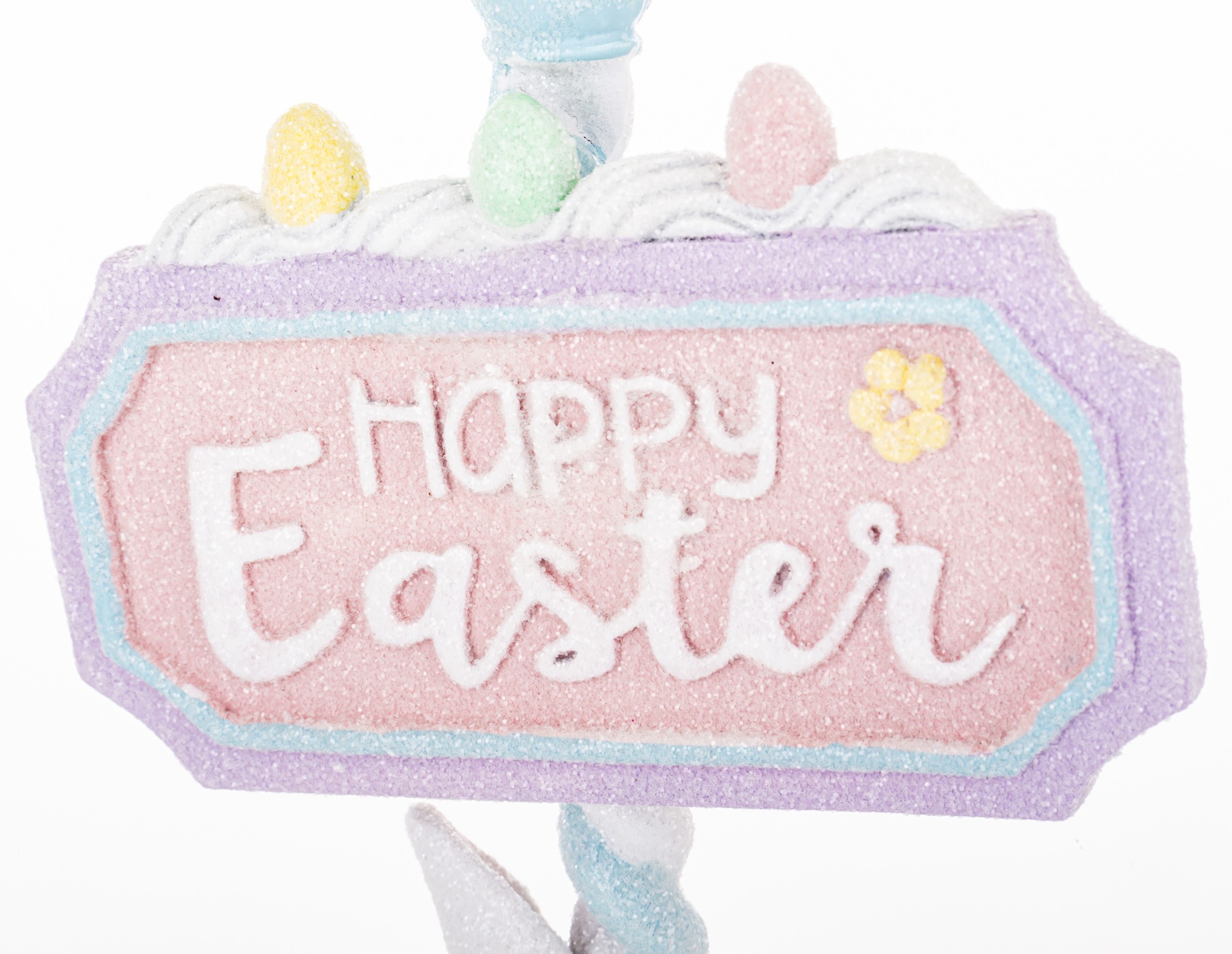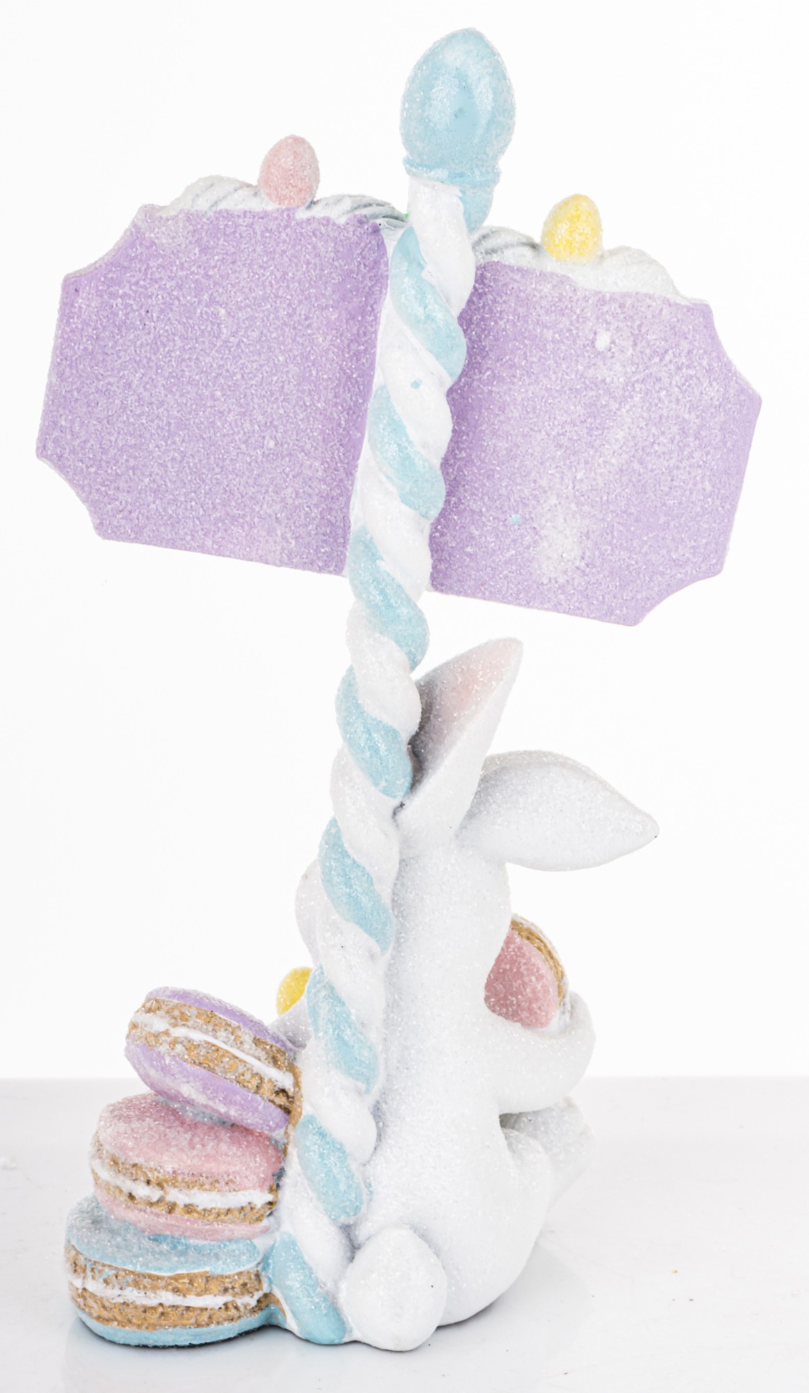 Figurka Królik EASTER to wielkanocna dekoracja, która wygląda jak bajkowa kompozycja ze świątecznej cukierni. Biały króliczek siedzi wśród pastelowych makaroników, trzymając kolorowe jajka, a obok niego wyrasta fantazyjny słupek zakończony płomykowym ornamentem i tabliczką „Happy Easter” w odcieniach fioletu i różu. Całość utrzymana jest w słodkiej palecie barw — mięta, cytryna, róż, lawenda — i ozdobiona detalami, które przyciągają wzrok i wywołują uśmiech.