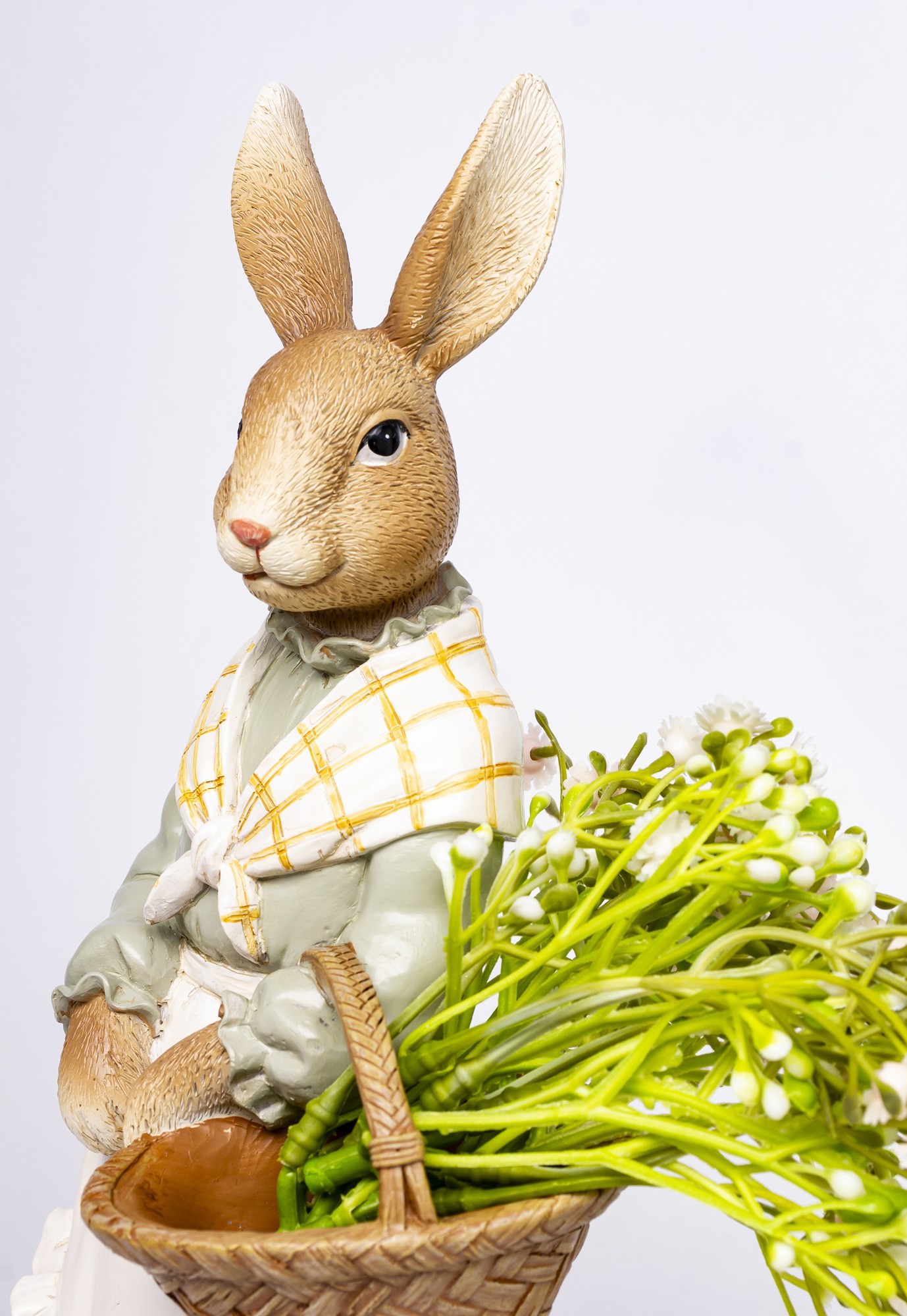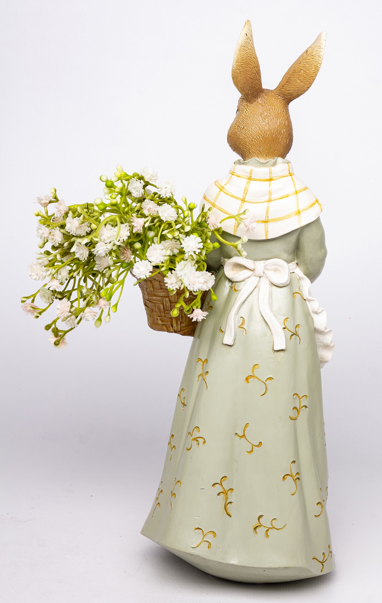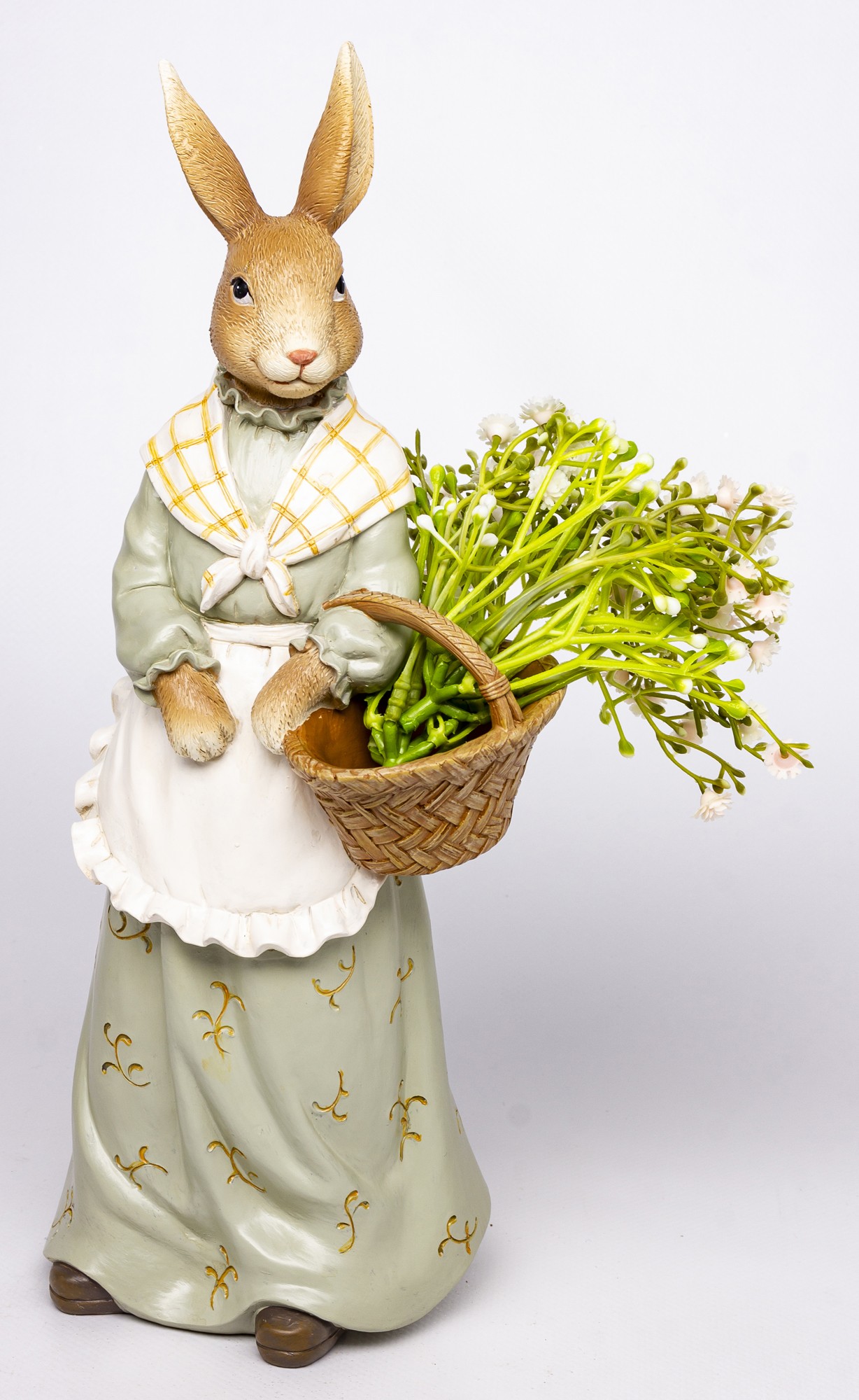 Figurka Królik KOSZYK to dekoracyjna figurka królika w zielonej sukni z koszem pełnym kwiatów. Idealna do wielkanocnych aranżacji, rustykalnych stylizacji i wnętrz z nutą natury.
