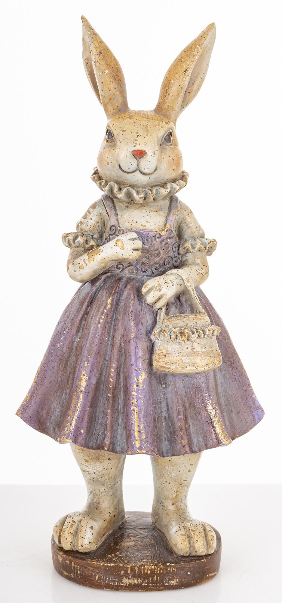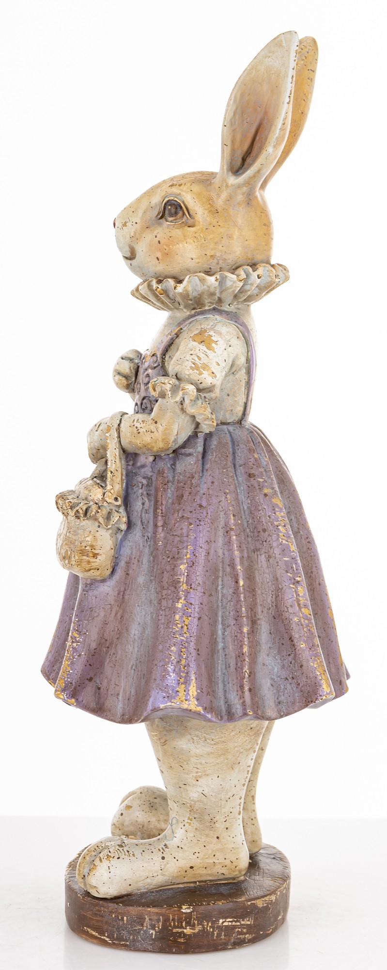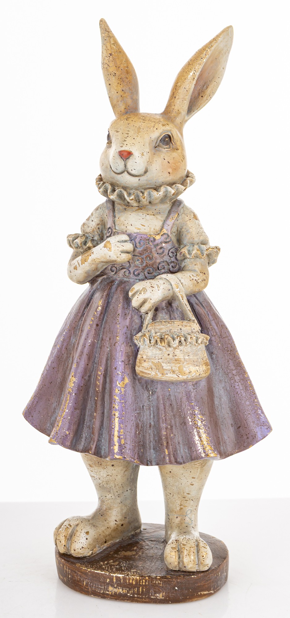 Figurka Królik LAVENDA to urocza dekoracja w stylu vintage — królik w fioletowej sukience z koszyczkiem, idealny do wiosennych aranżacji i wielkanocnych stylizacji.