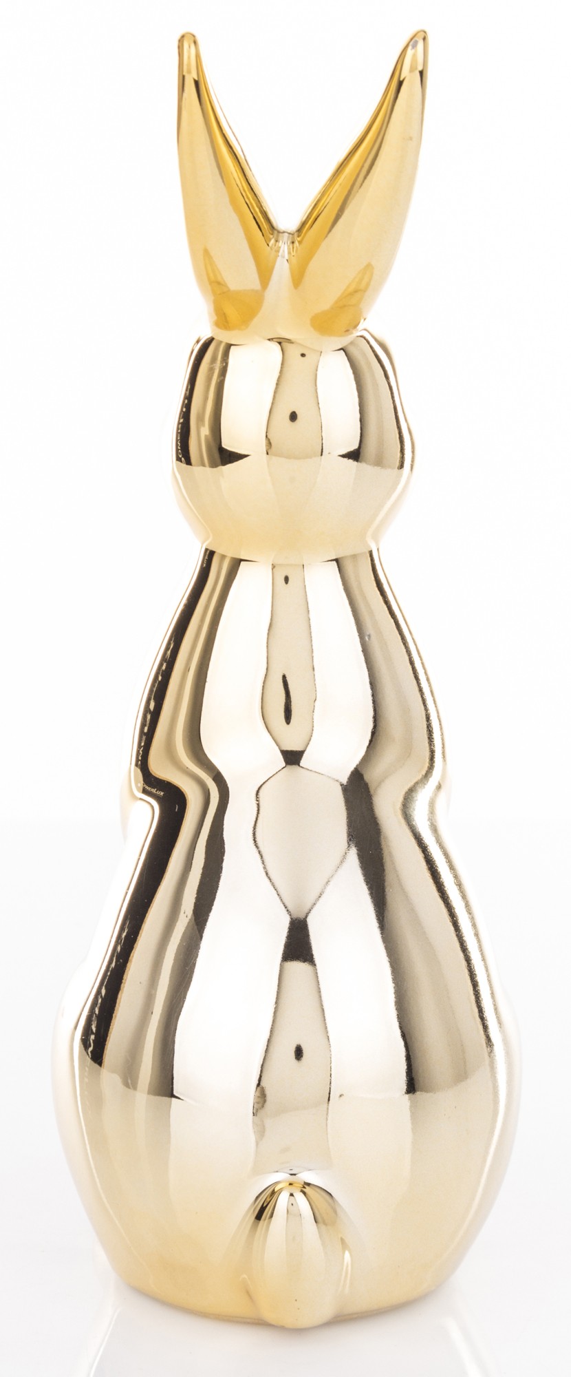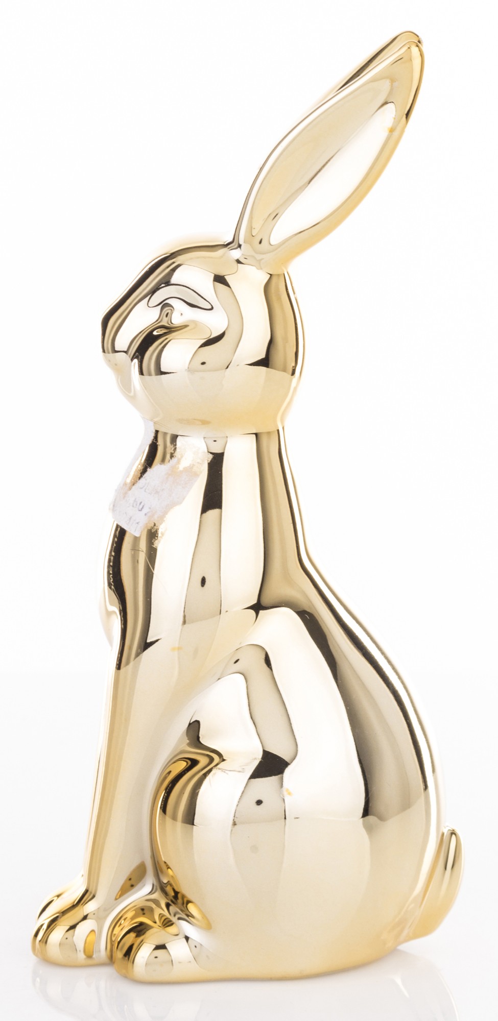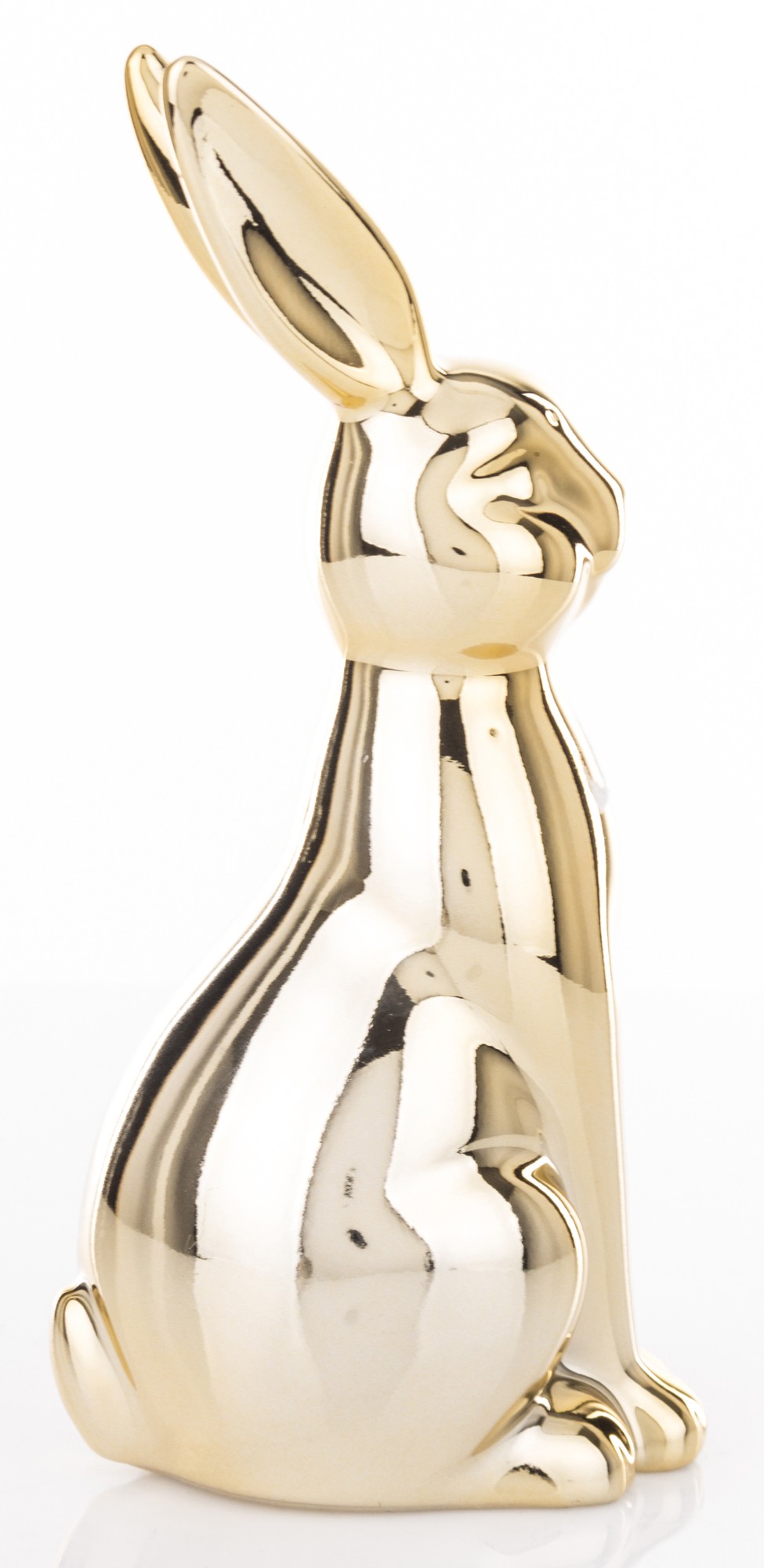 Figurka Królik METALIQUE GOLD to stylizowana rzeźba, która łączy nowoczesny design z wyrazistym, złotym wykończeniem. Wykonana z materiału o wysokim połysku, przypominającym polerowany metal, przedstawia siedzącego królika o uproszczonej, eleganckiej sylwetce. Gładkie linie, wydłużone uszy i brak zbędnych detali nadają jej rzeźbiarski, niemal futurystyczny charakter.