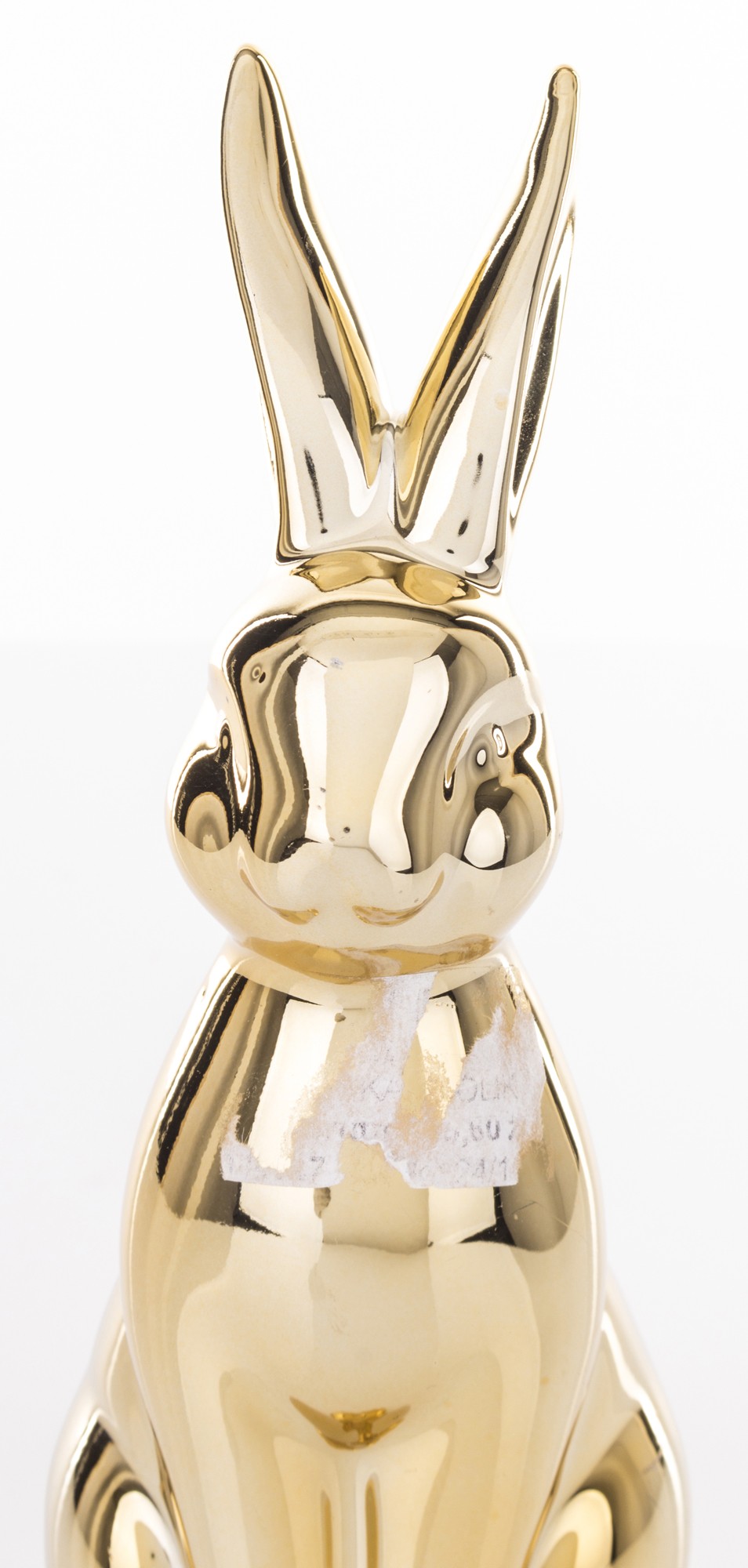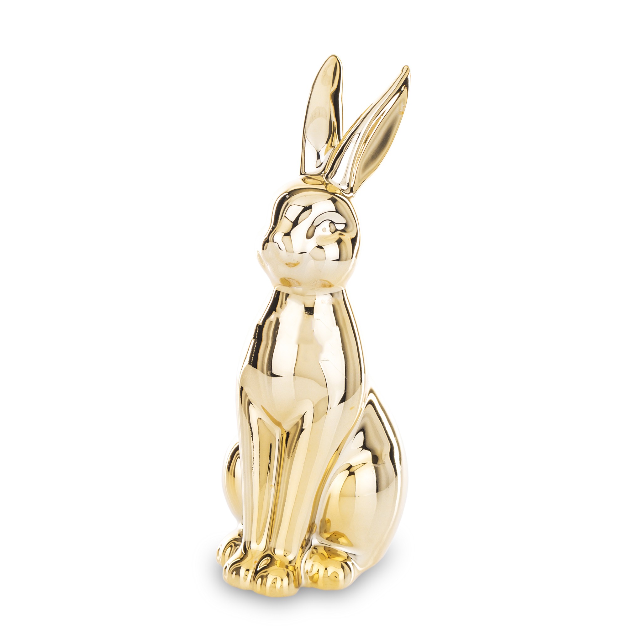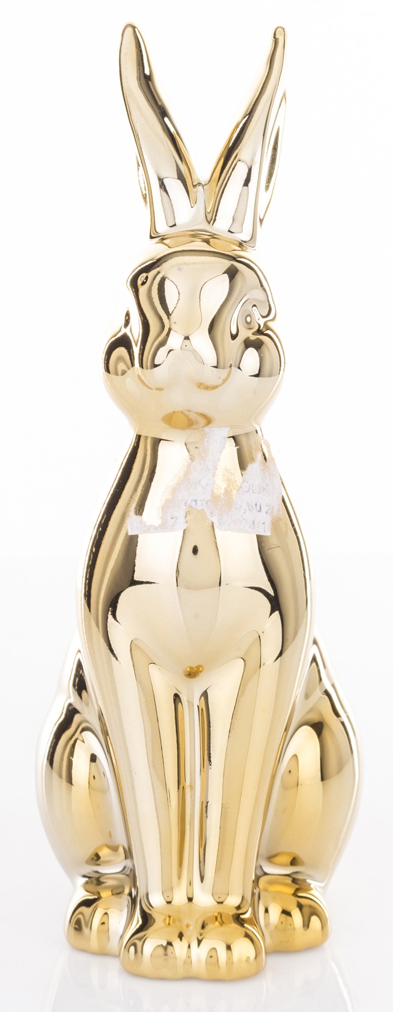 Figurka Królik METALIQUE GOLD to stylizowana rzeźba, która łączy nowoczesny design z wyrazistym, złotym wykończeniem. Wykonana z materiału o wysokim połysku, przypominającym polerowany metal, przedstawia siedzącego królika o uproszczonej, eleganckiej sylwetce. Gładkie linie, wydłużone uszy i brak zbędnych detali nadają jej rzeźbiarski, niemal futurystyczny charakter.
