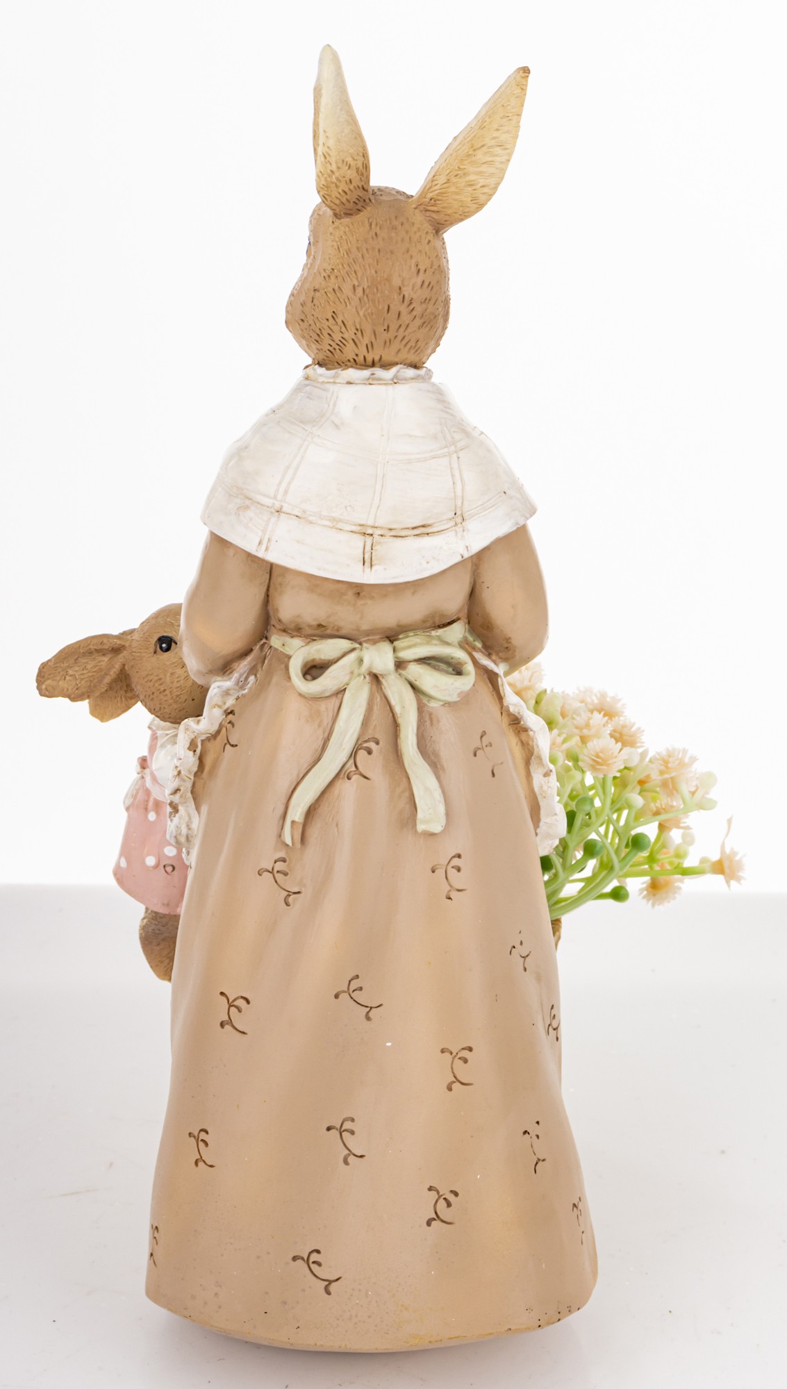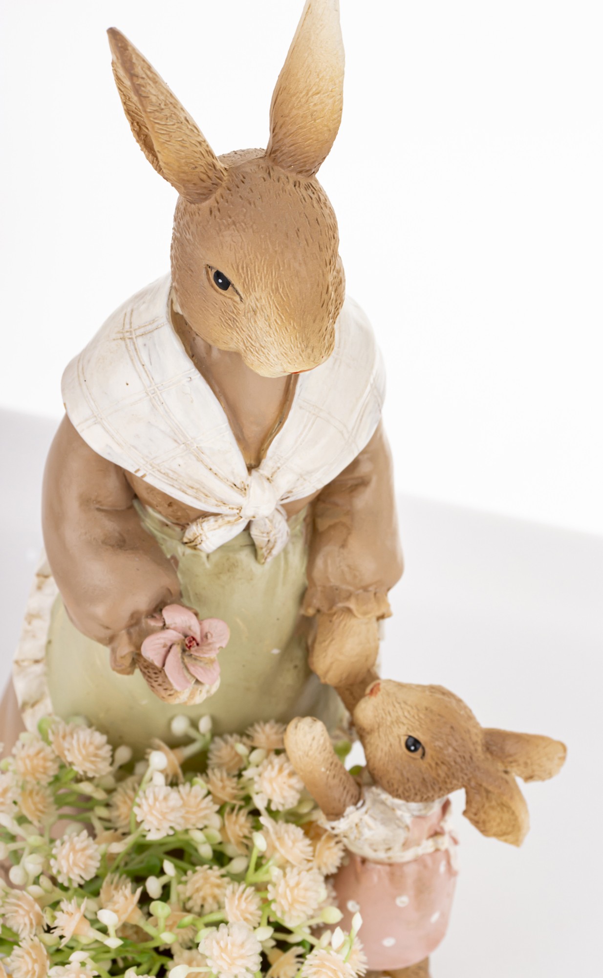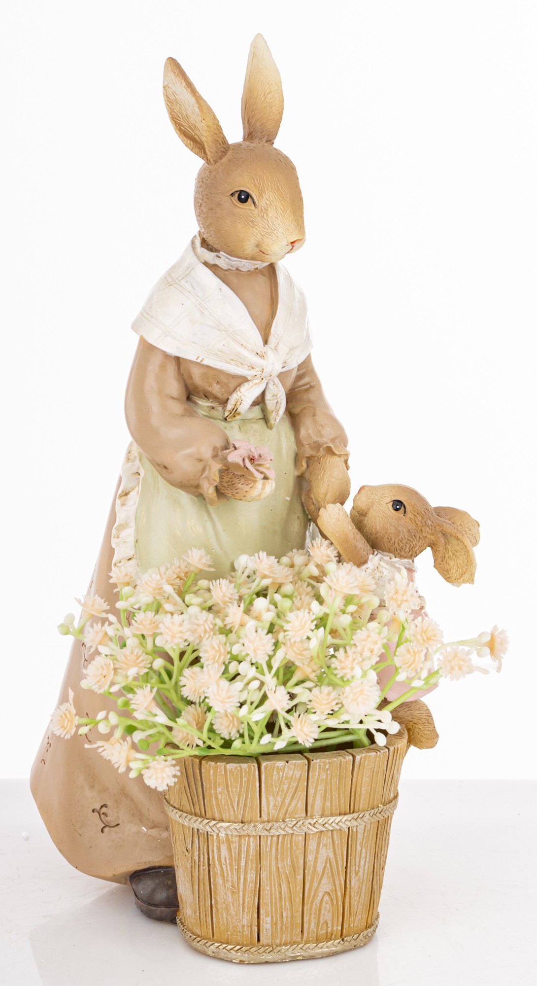 Figurka Królik MUMMY to pełna emocji dekoracja, która wnosi do wnętrza ciepło, rodzinny klimat i wielkanocną świeżość. Przedstawia stylizowaną scenkę z mamą królikiem w długiej sukni i szalu, oraz małym króliczkiem, który z ufnością wyciąga łapki w jej stronę. U ich stóp stoi drewniane wiaderko wypełnione pastelowymi kwiatami — subtelny symbol wiosny i troski.