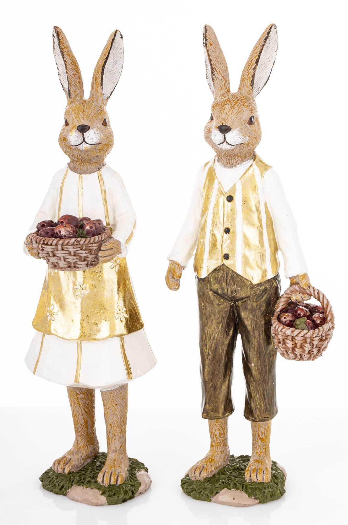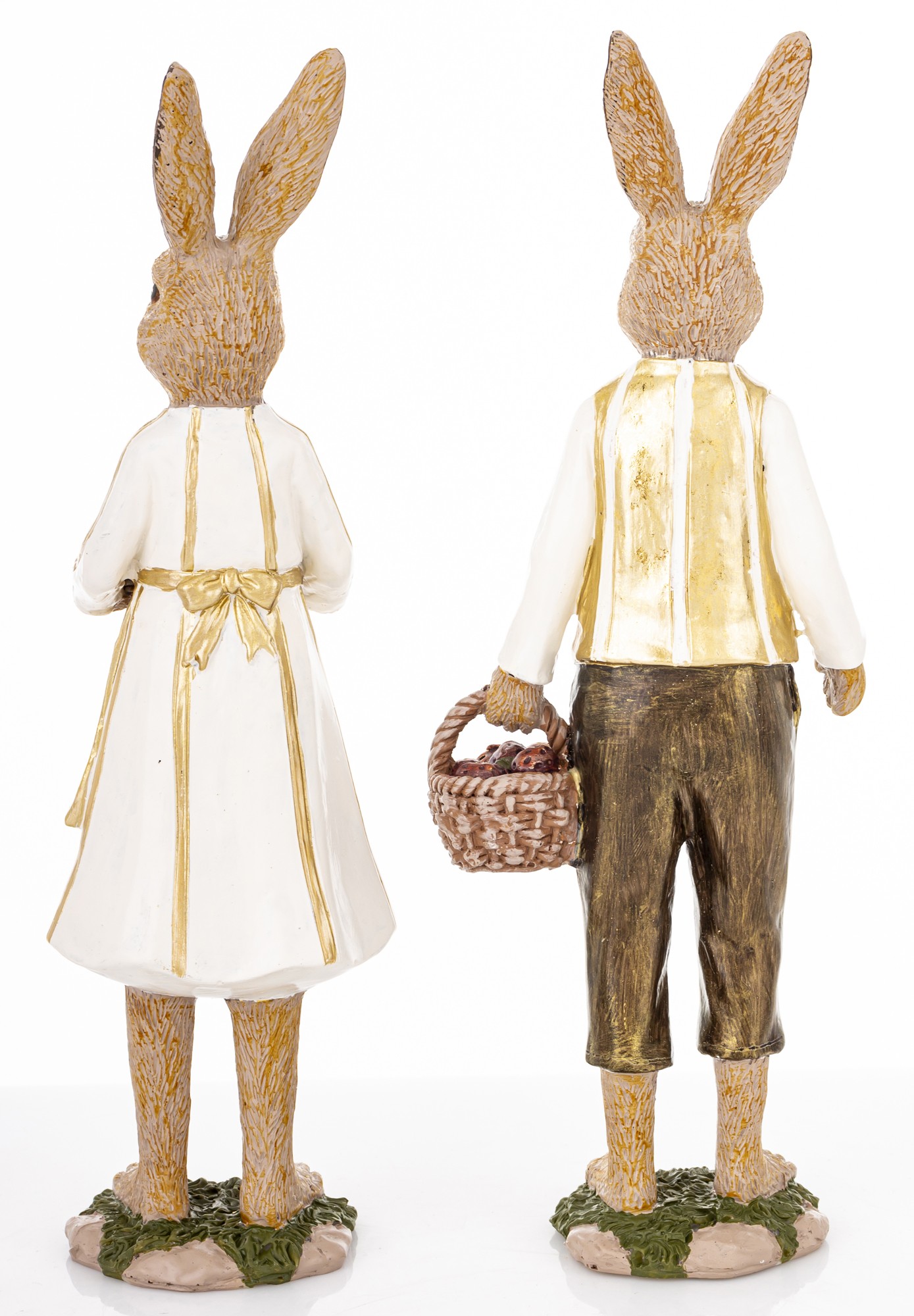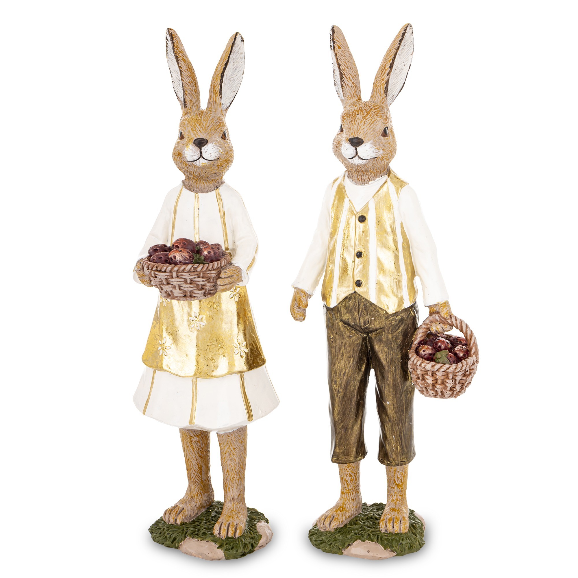 Figurka Królik YOUNG COUPLE to dekoracyjny zestaw dwóch postaci, które łączą wielkanocny klimat z nostalgiczną estetyką. Króliczka w białej sukience, złotej bluzce i fartuszku trzyma kosz pełen jajek w odcieniach czerwieni i brązu. Jej towarzysz ubrany jest w białą koszulę, złoty bezrękawnik i brązowe spodnie, również z koszem w dłoni. Obie figurki stoją na stylizowanych podstawach przypominających trawę i ziemię, co dodaje im naturalnego uroku.