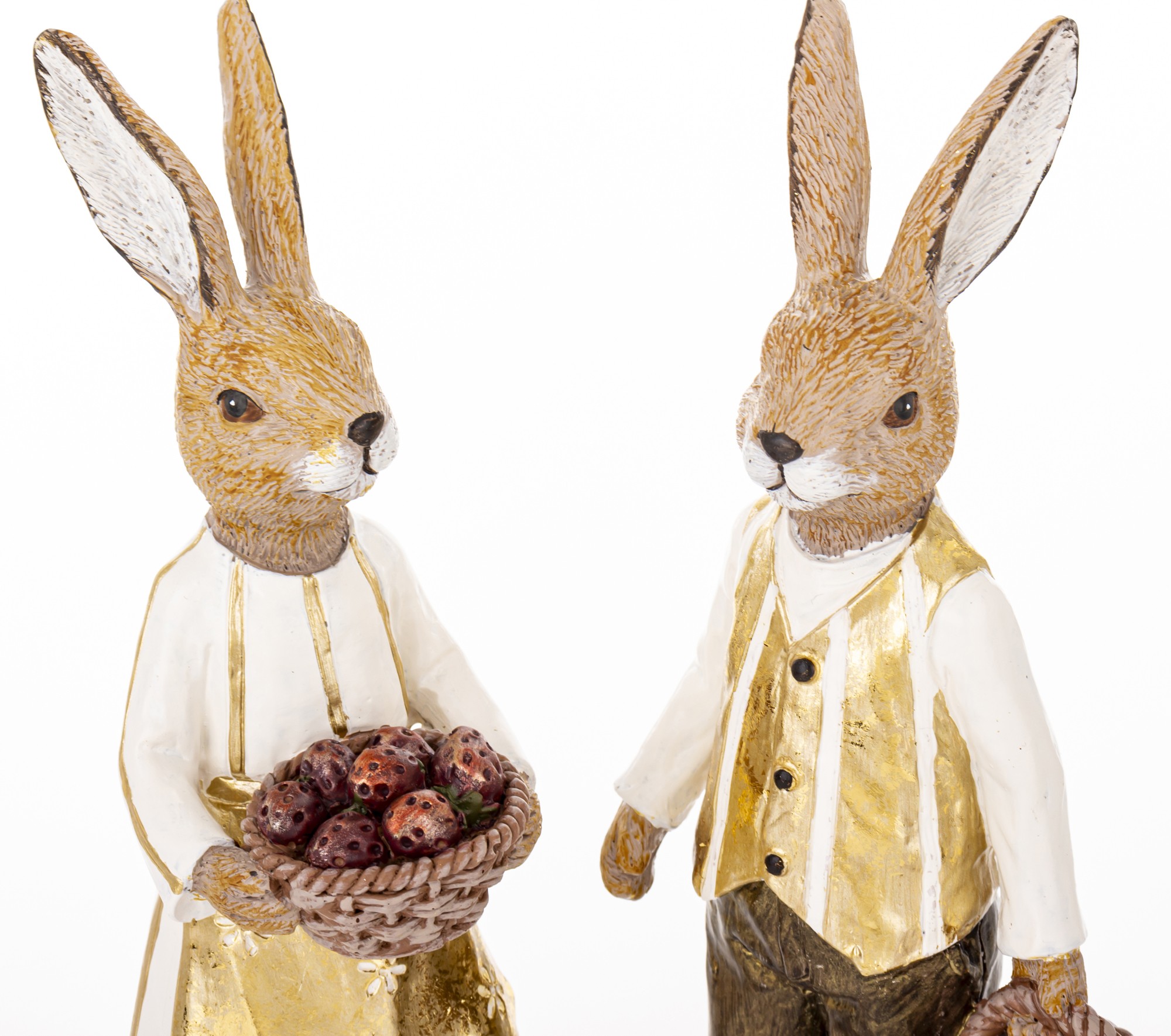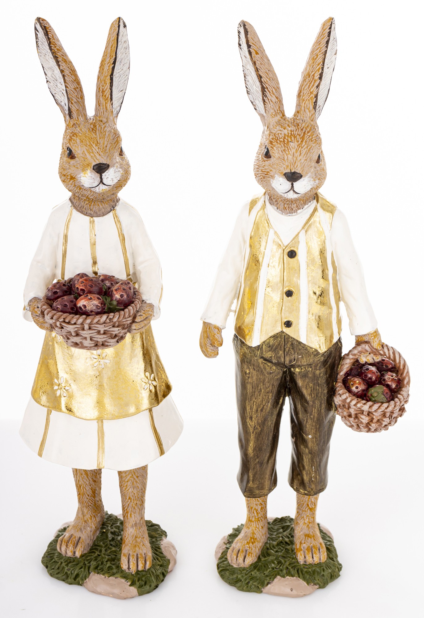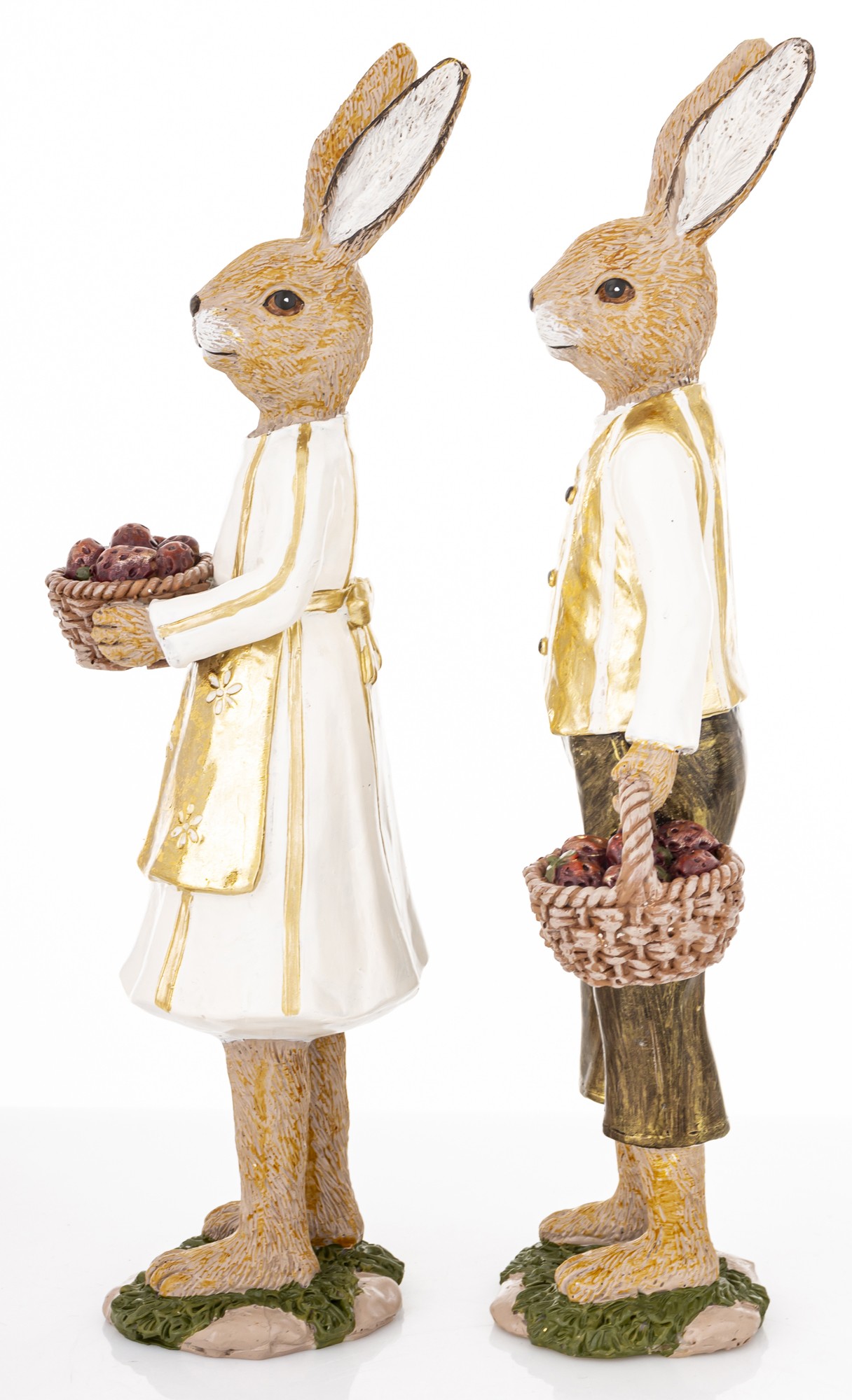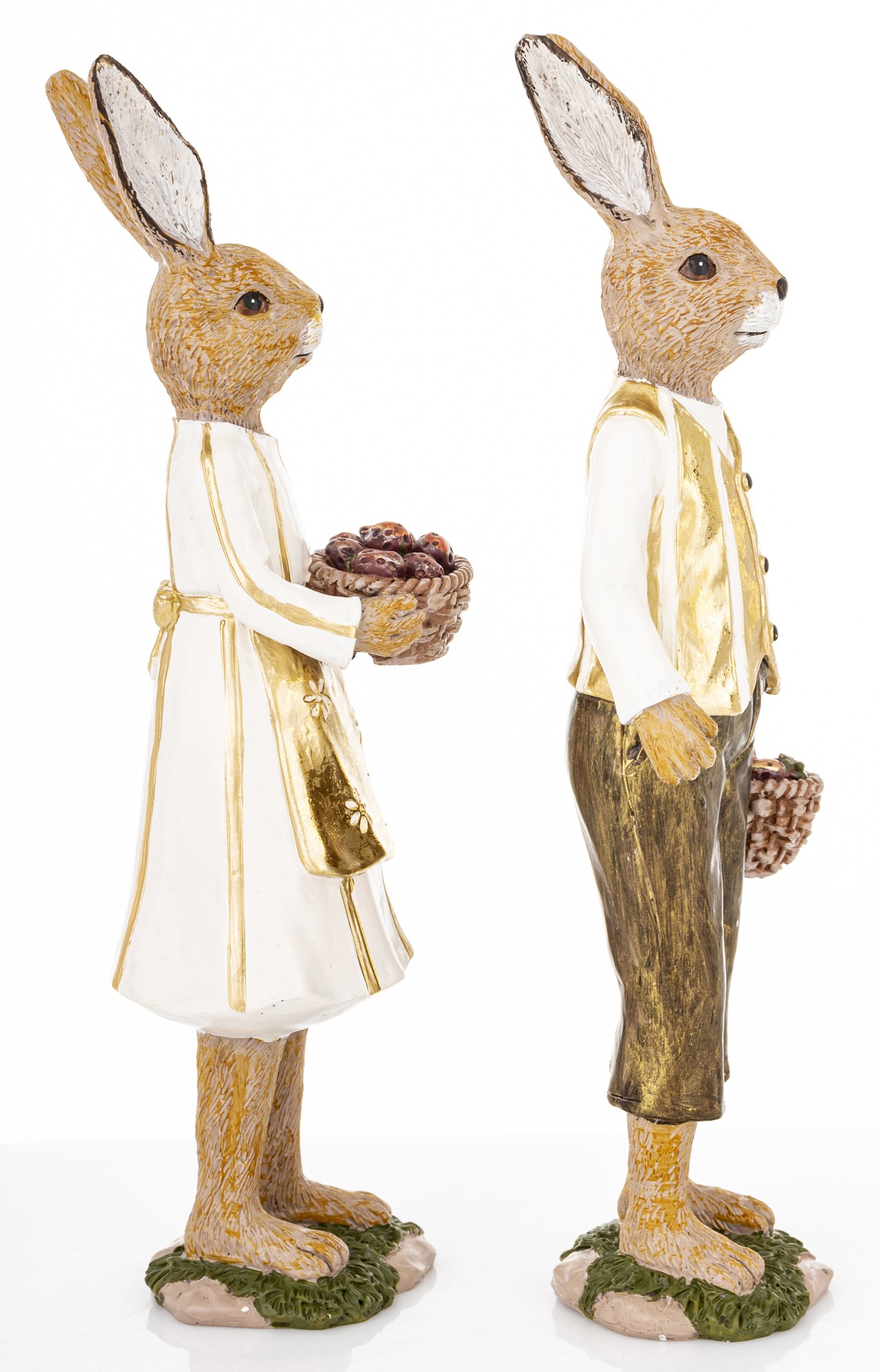 Figurka Królik YOUNG COUPLE to dekoracyjny zestaw dwóch postaci, które łączą wielkanocny klimat z nostalgiczną estetyką. Króliczka w białej sukience, złotej bluzce i fartuszku trzyma kosz pełen jajek w odcieniach czerwieni i brązu. Jej towarzysz ubrany jest w białą koszulę, złoty bezrękawnik i brązowe spodnie, również z koszem w dłoni. Obie figurki stoją na stylizowanych podstawach przypominających trawę i ziemię, co dodaje im naturalnego uroku.