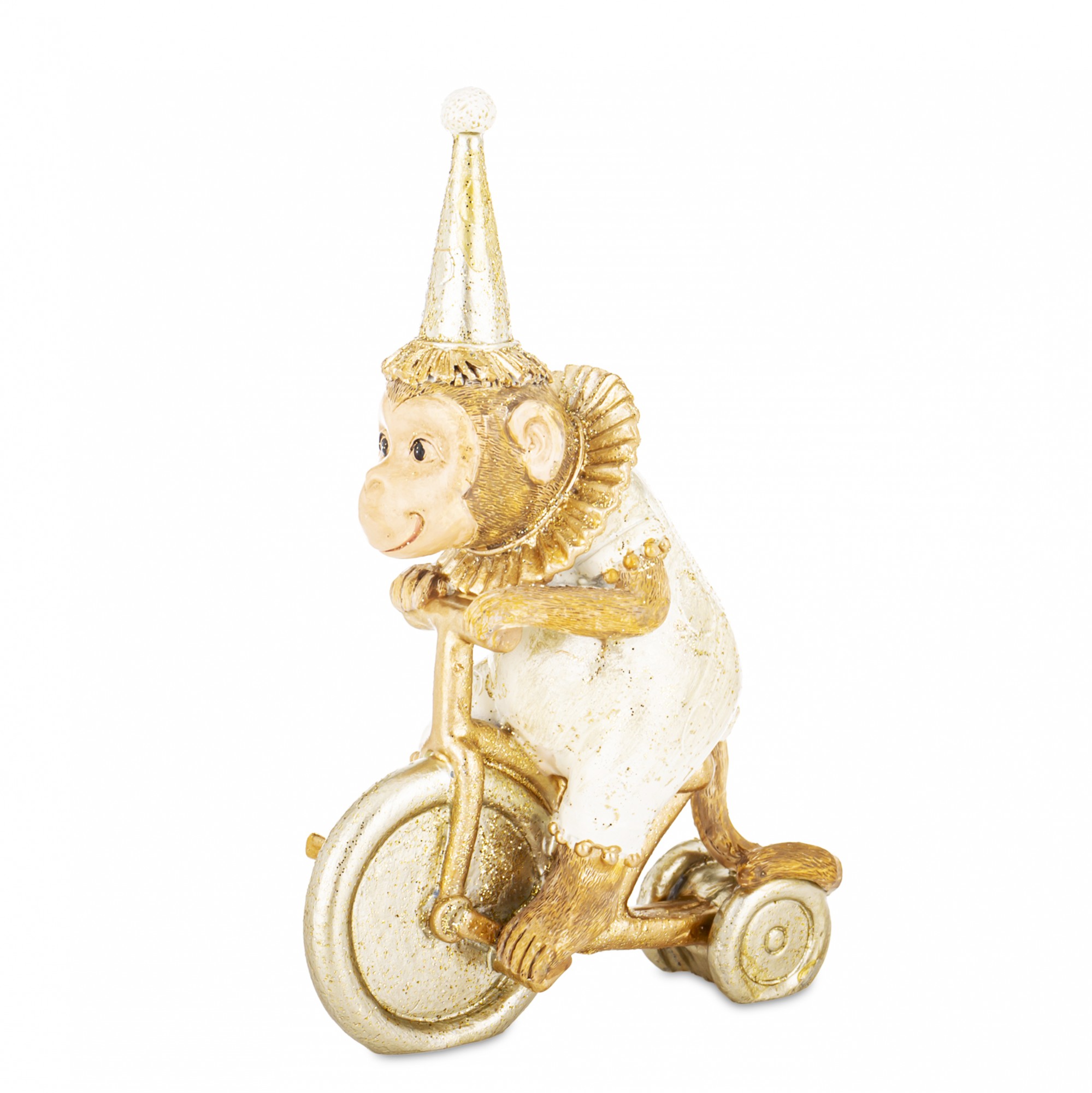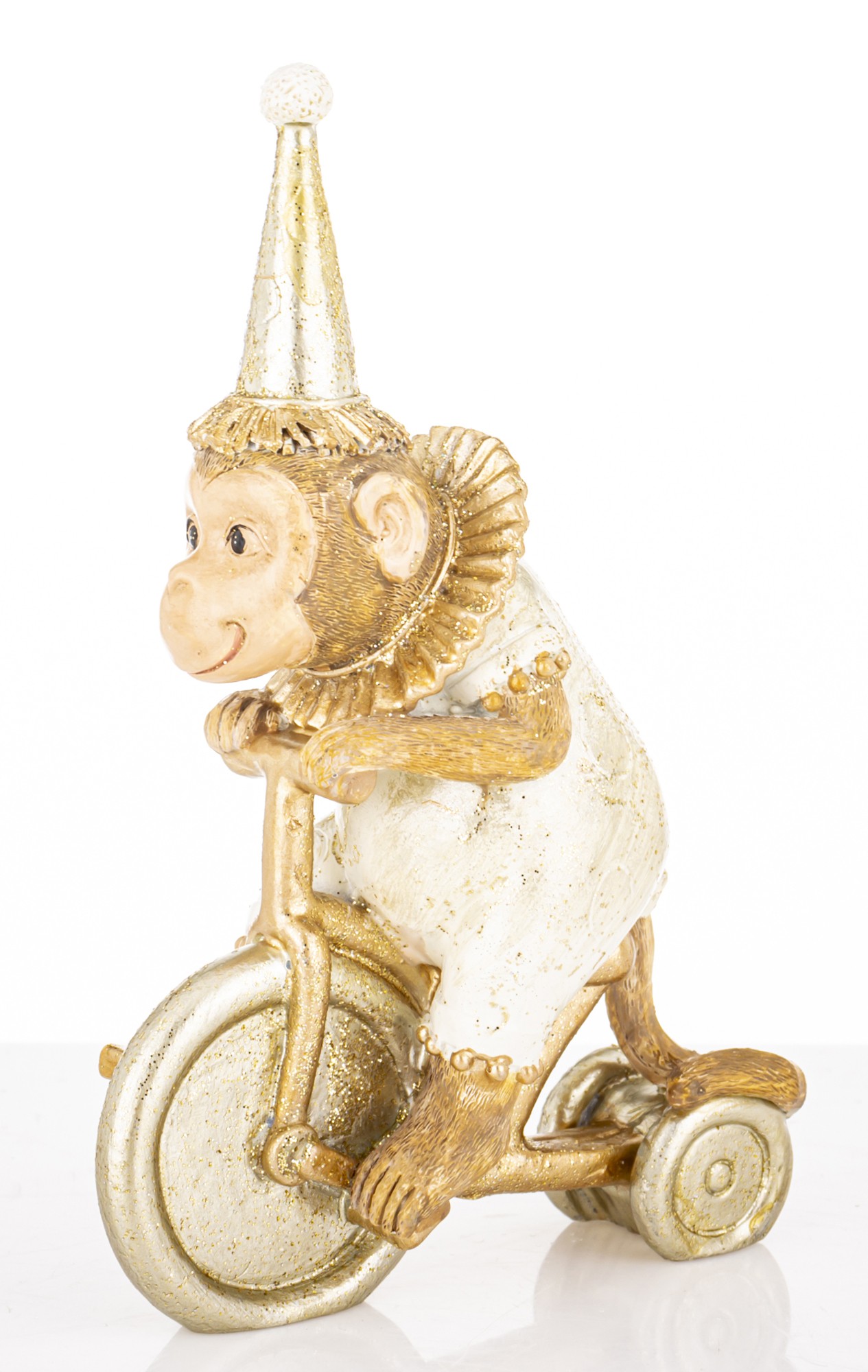 Figurka Małpka RIDER to urocza dekoracja w stylu retro‑cyrkowym. Małpka w złoto‑białym stroju jedzie na trójkołowcu, tworząc efektowny, pełen ruchu akcent, który doda wnętrzu humoru, lekkości i wyjątkowego uroku.