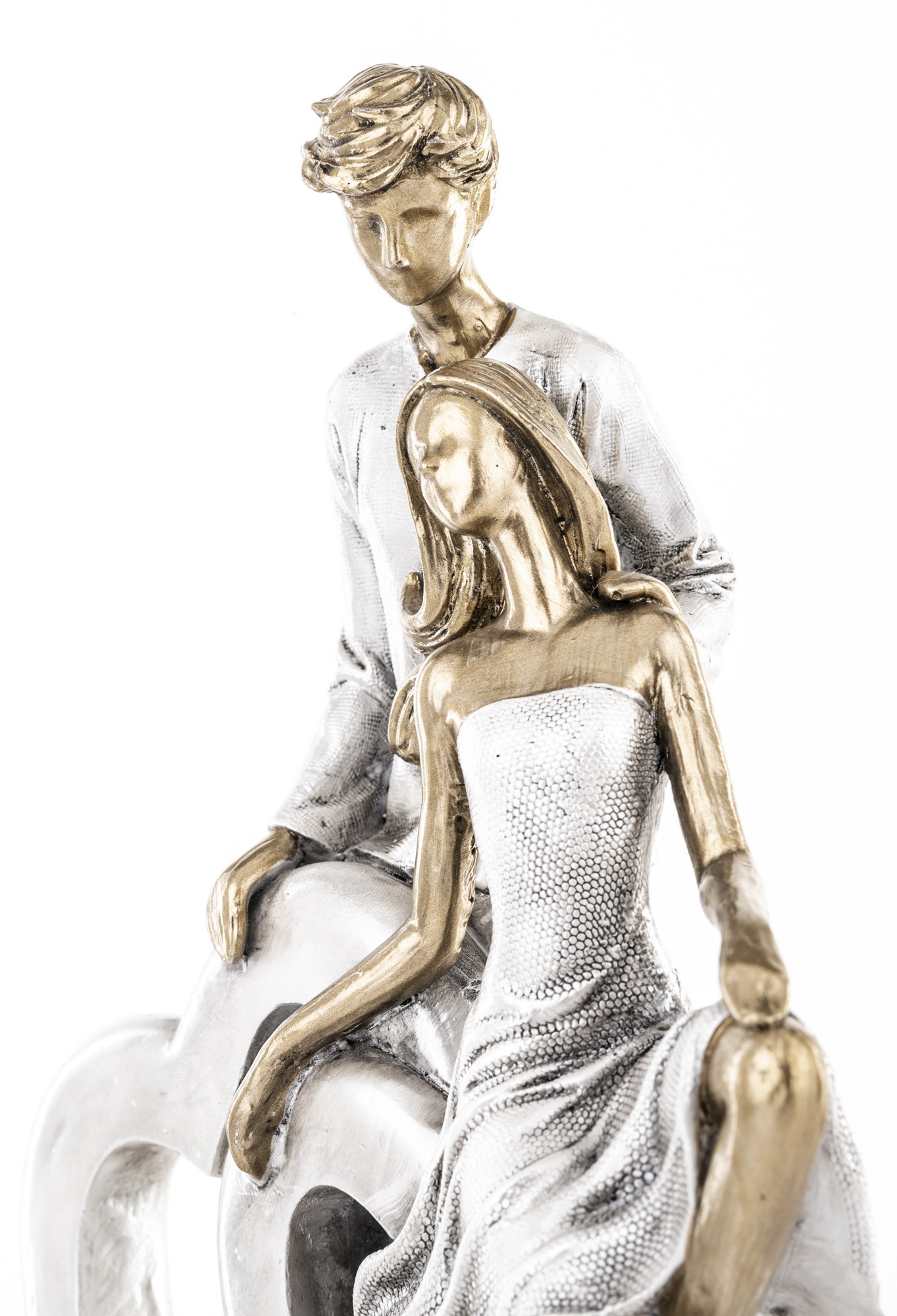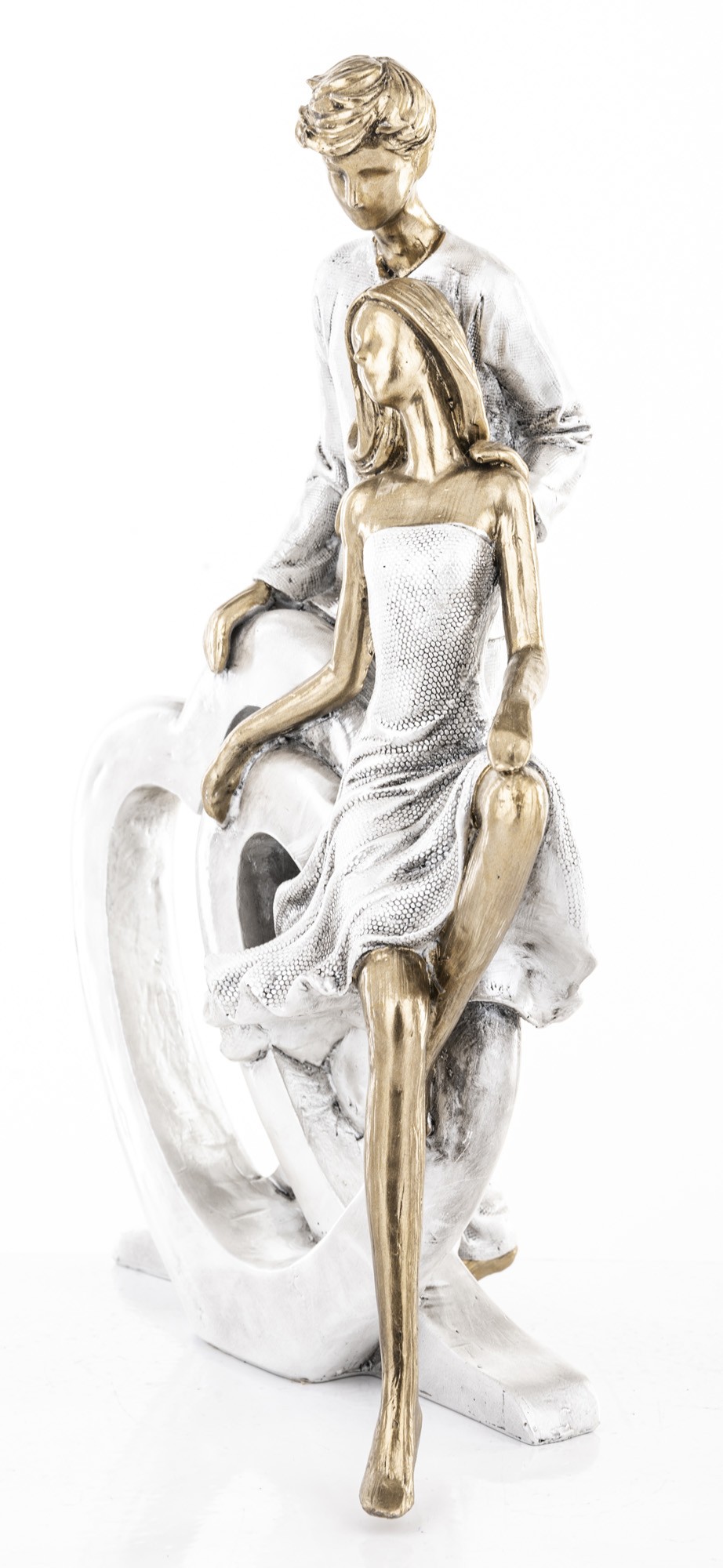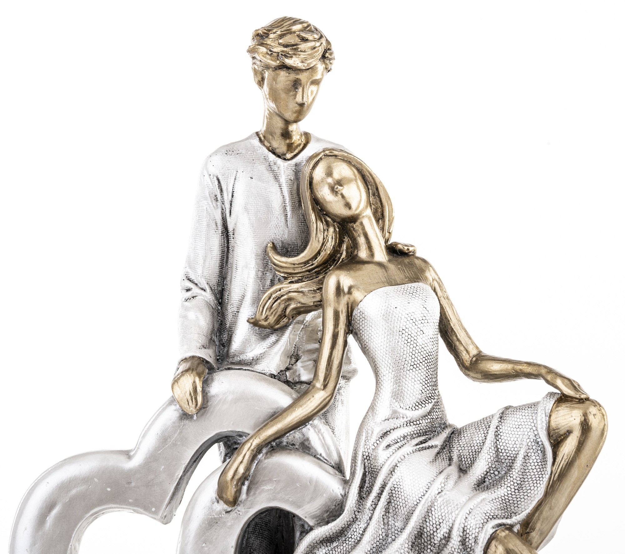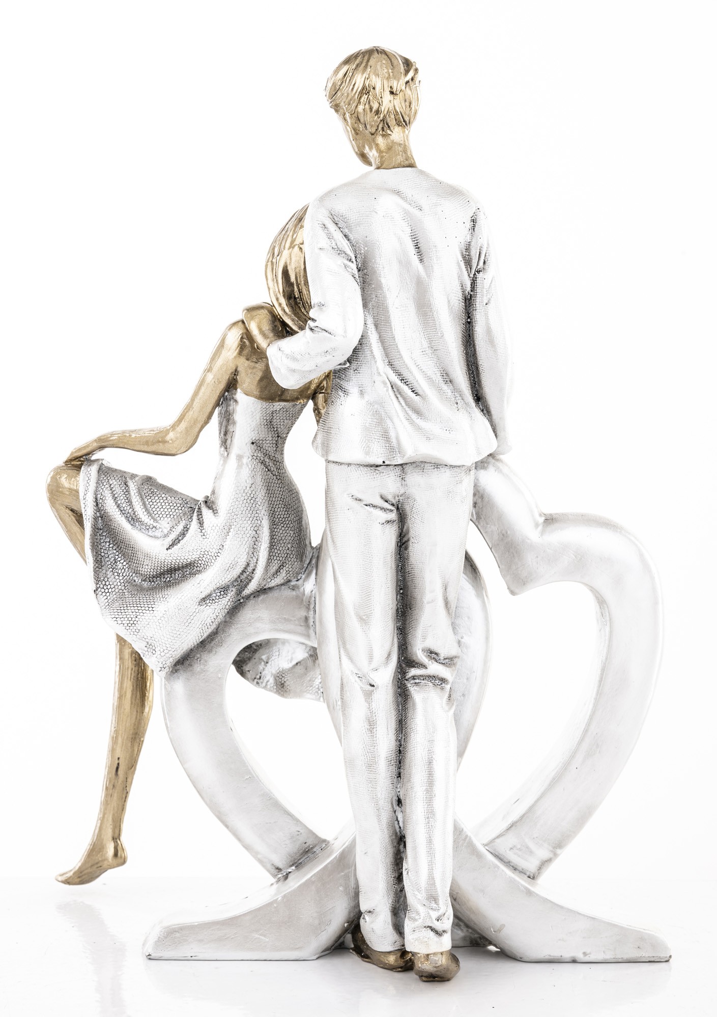 SILVER LOVE to dekoracja, która mówi więcej niż słowa. Przedstawia stylizowaną parę — ona siedzi z gracją na krawędzi serca, on stoi tuż za nią, jakby chronił ich wspólną przestrzeń. Całość zamknięta w srebrzystej ramie serca, z postaciami w złotym wykończeniu, tworzy kompozycję pełną harmonii, emocji i artystycznego wyrazu.