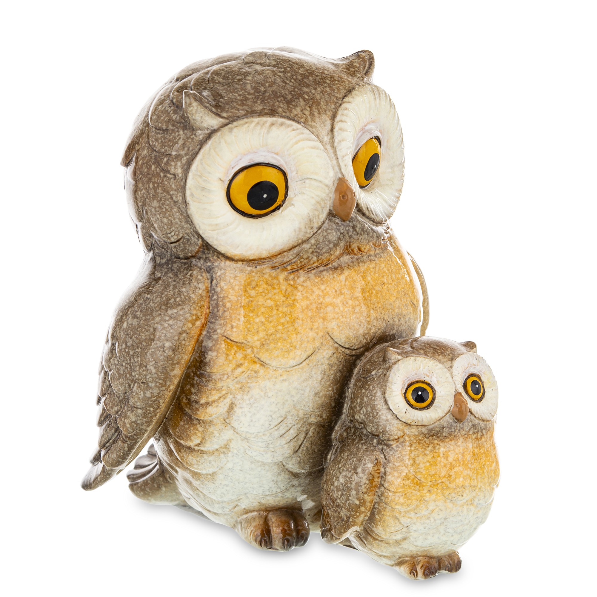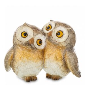 Ta wyjątkowa figurka przedstawia dwie sowy – większą i mniejszą – stojące obok siebie w spokojnej, rodzinnej pozie. Duże, żółte oczy, realistyczna faktura piór i ciepła paleta barw (brązy, beże, pomarańcze) tworzą kompozycję pełną uroku i symbolicznej głębi. Większa sowa stoi dumnie i stabilnie, podczas gdy mniejsza lekko się pochyla – jakby szukała wsparcia lub czułości. Całość emanuje spokojem, troską i poczuciem więzi.