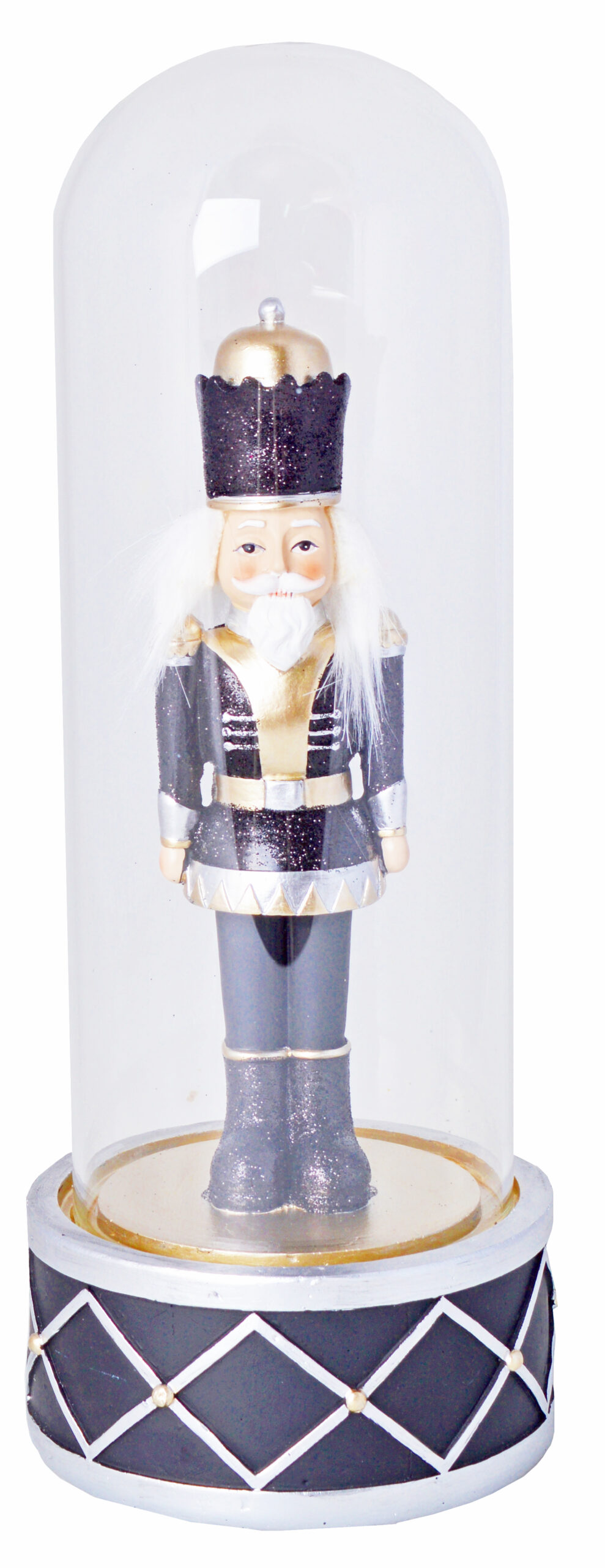 Stylowa figurka dziadka do orzechów CASPA w klasycznej czarno-złotej kolorystyce, zamknięta pod przezroczystą szklaną kopułą, to doskonały dodatek do eleganckich świątecznych aranżacji. Precyzyjnie wykonana z dbałością o detale, przedstawia charakterystyczną postać w bogatym, królewskim stroju. Podstawa zdobiona geometrycznym wzorem w odcieniach czerni i srebra podkreśla jej luksusowy charakter. Szklana kopuła nie tylko chroni figurkę, ale również dodaje jej wyrafinowanego wyglądu. Idealna jako ozdoba na świąteczny stół, komodę lub prezent dla miłośników klasyki w nowoczesnym wydaniu. Wprowadź wyjątkowy klimat do swojego wnętrza dzięki tej ponadczasowej dekoracji.