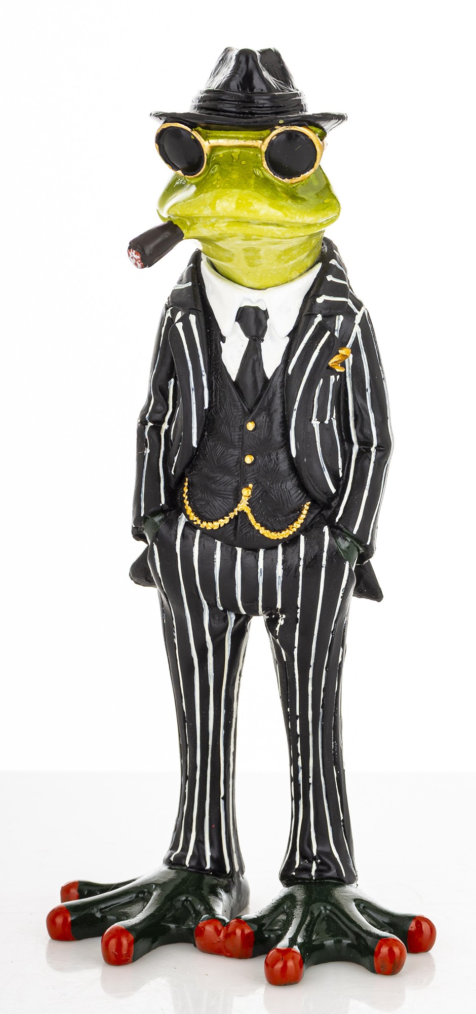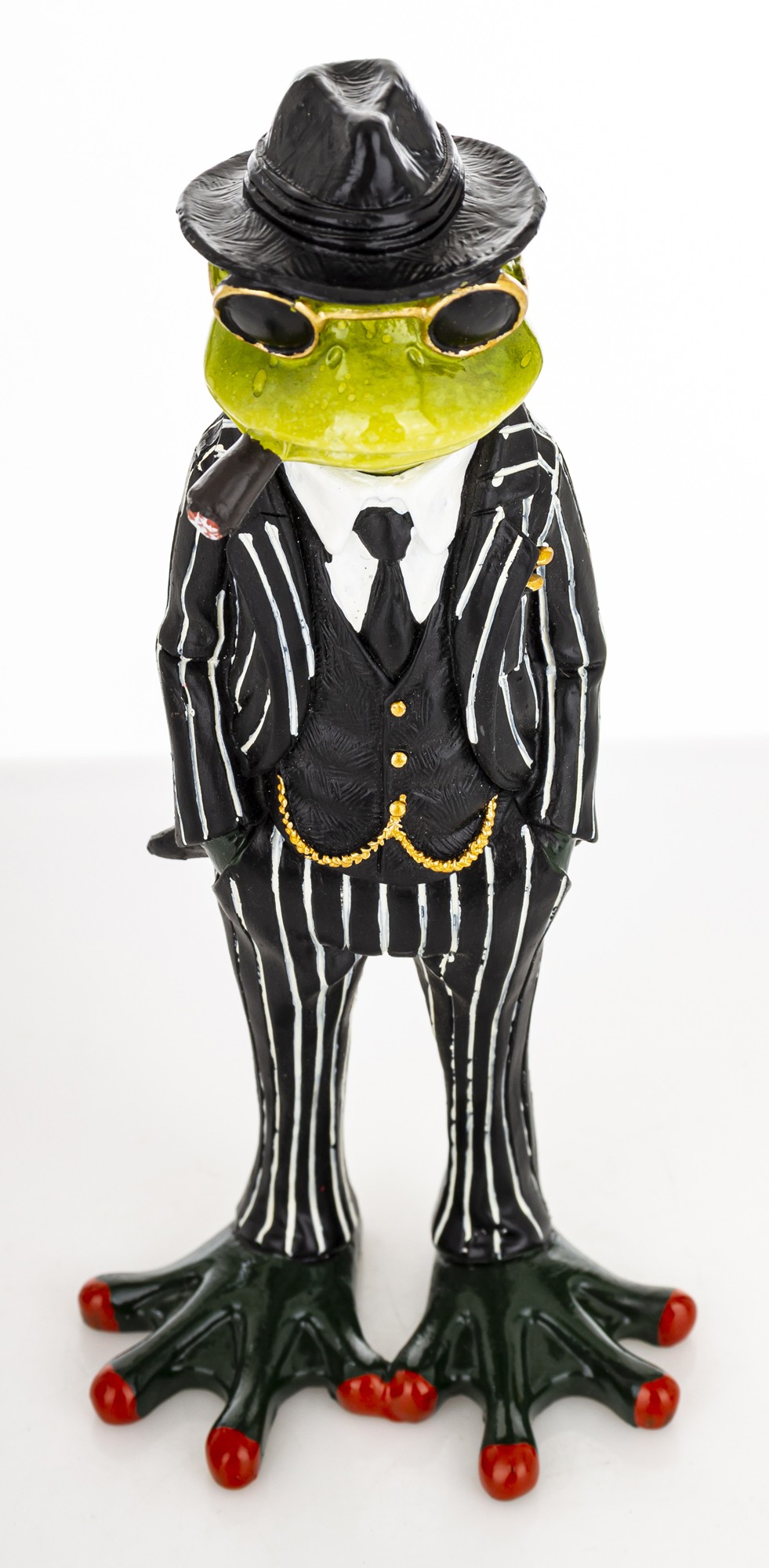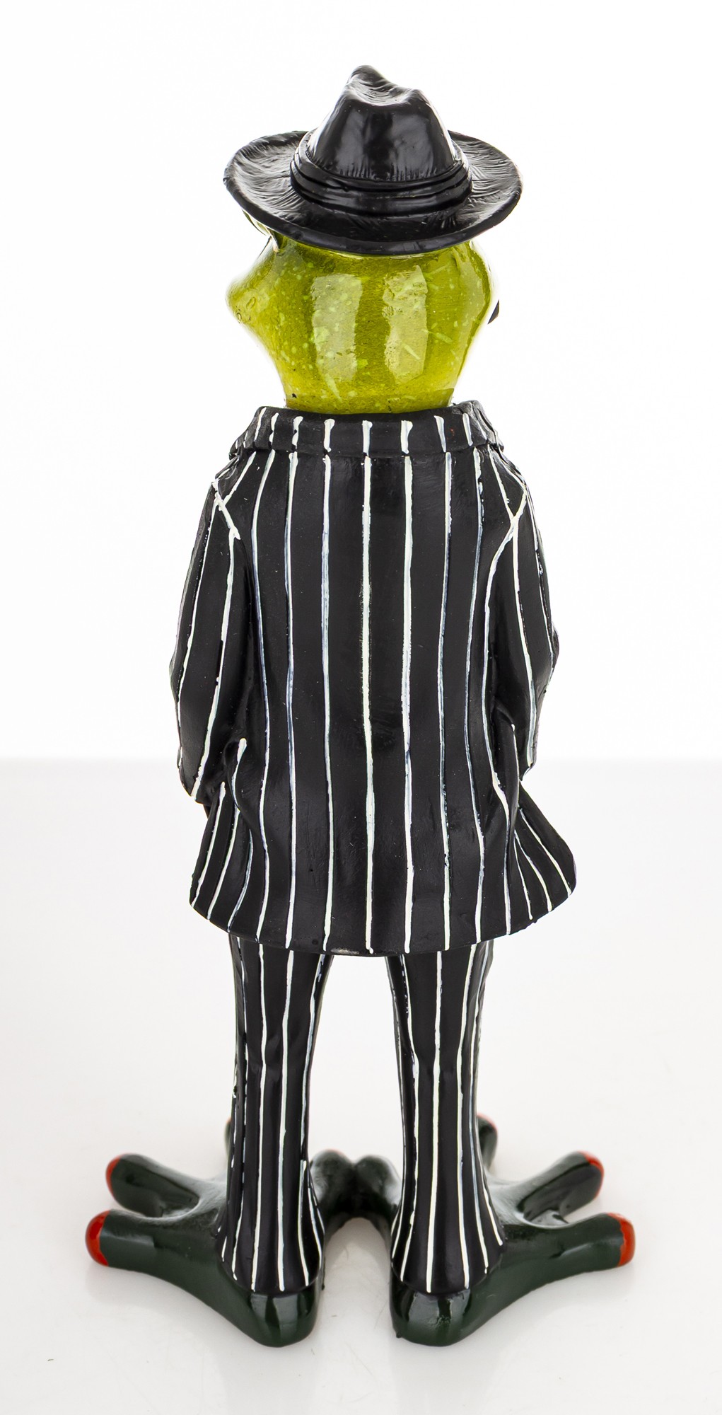 Ta wyjątkowa figurka to połączenie stylu, humoru i dekoracyjnej odwagi. Zielona żaba o intensywnie czerwonych oczach prezentuje się w czarnym garniturze w białe paski, z rękami nonszalancko schowanymi w kieszeniach. Kapelusz, okulary przeciwsłoneczne i cygaro dopełniają jej gangsterskiego looku – jakby właśnie wyszła z filmu noir, gotowa na wieczór w klubie z jazzem i whisky.
