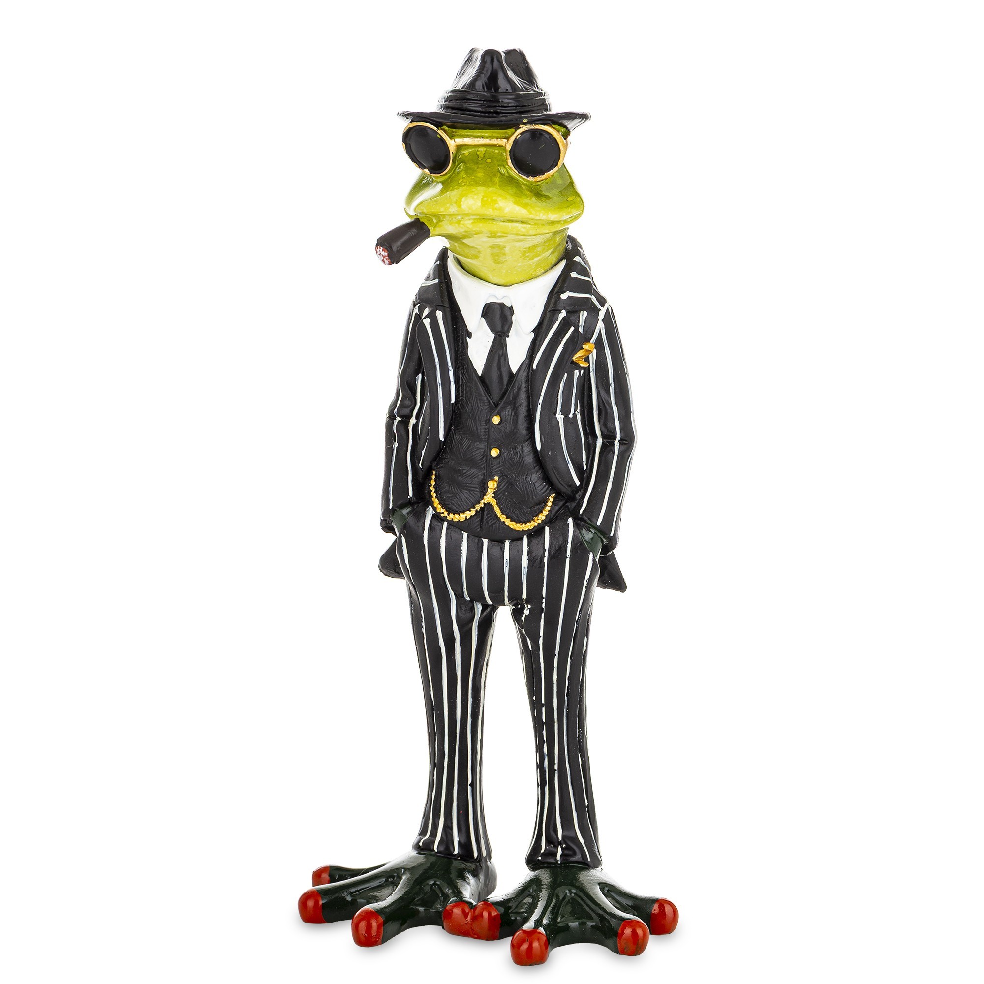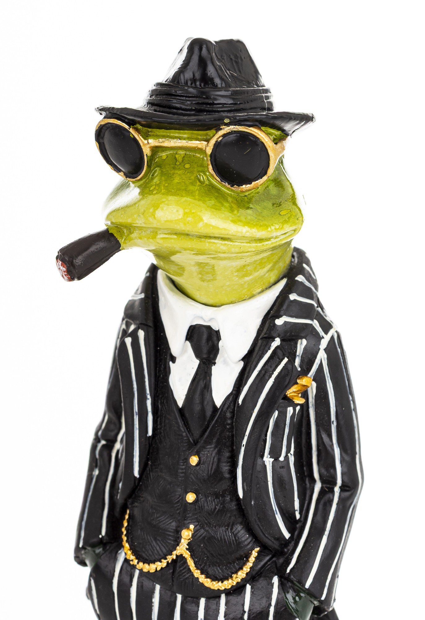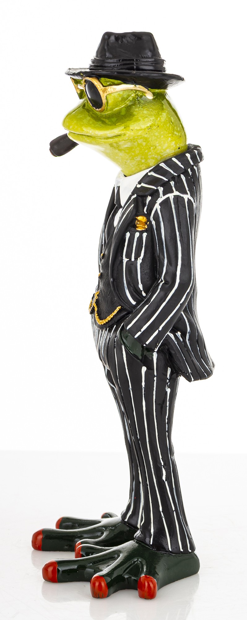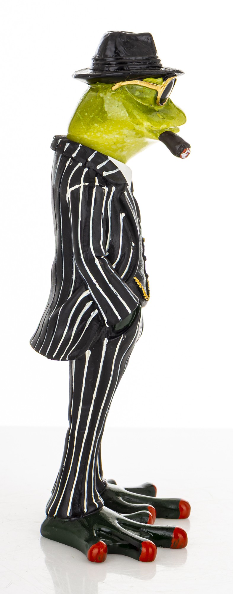 Ta wyjątkowa figurka to połączenie stylu, humoru i dekoracyjnej odwagi. Zielona żaba o intensywnie czerwonych oczach prezentuje się w czarnym garniturze w białe paski, z rękami nonszalancko schowanymi w kieszeniach. Kapelusz, okulary przeciwsłoneczne i cygaro dopełniają jej gangsterskiego looku – jakby właśnie wyszła z filmu noir, gotowa na wieczór w klubie z jazzem i whisky.