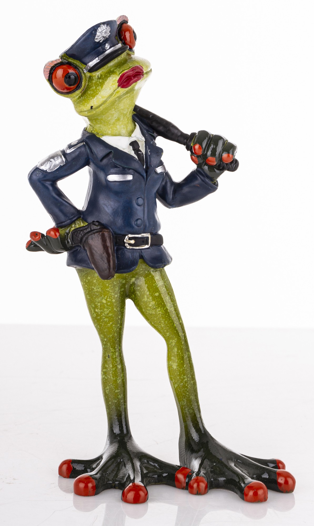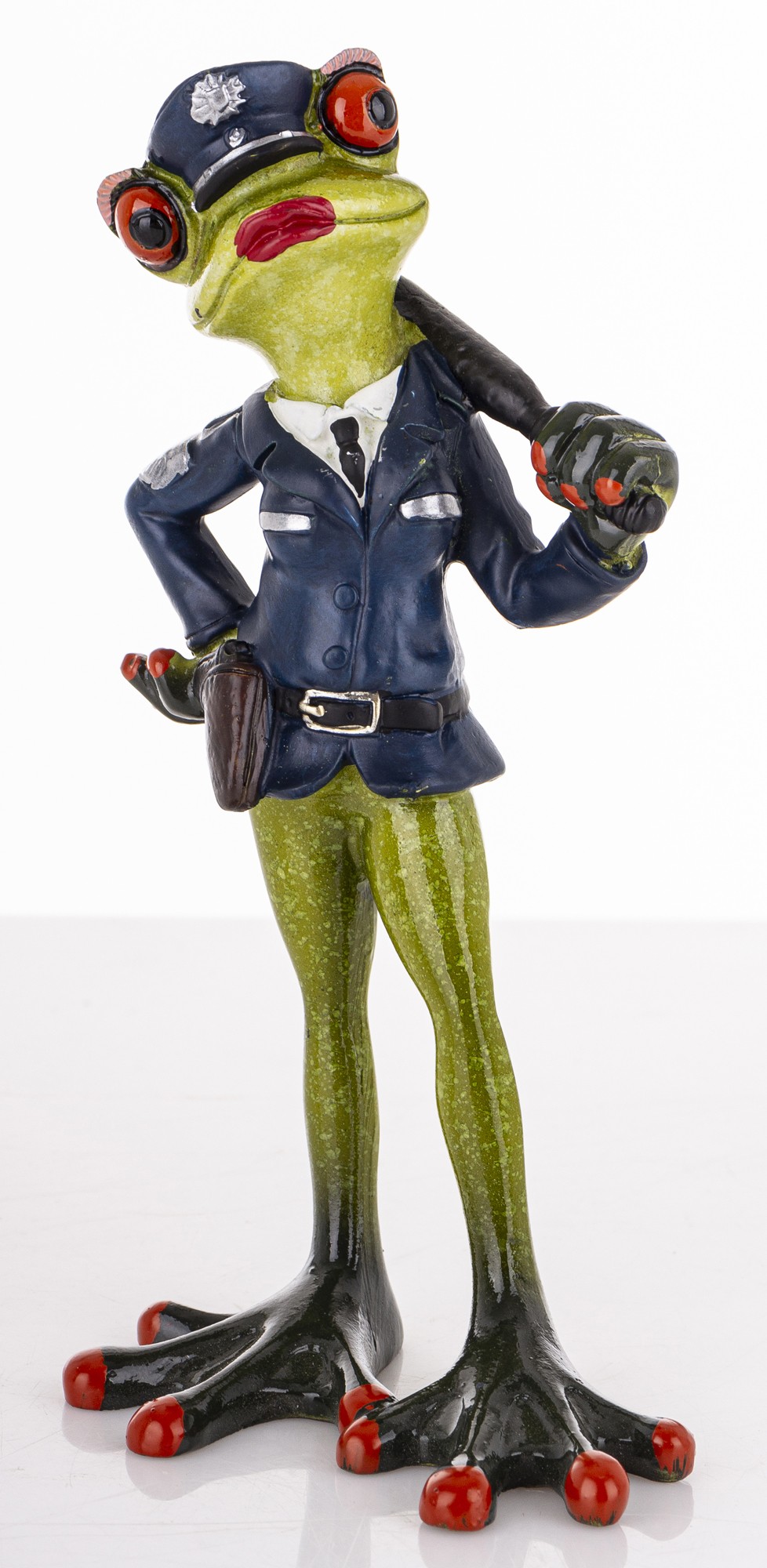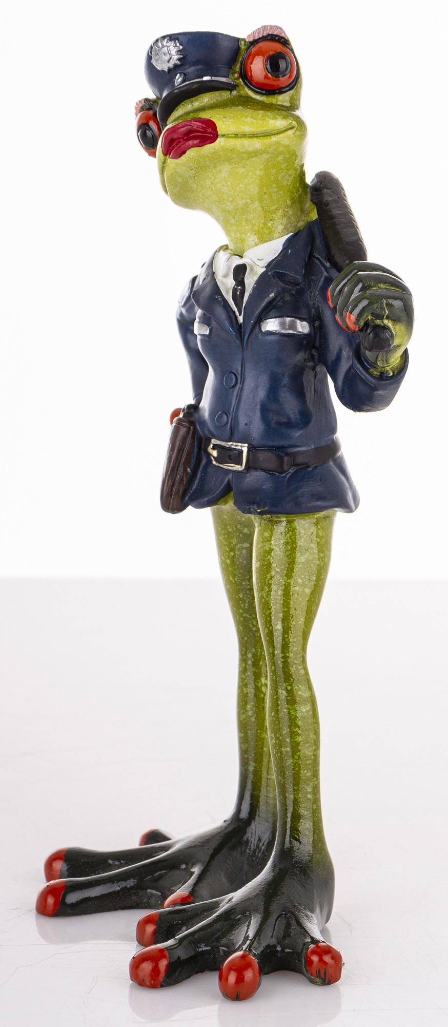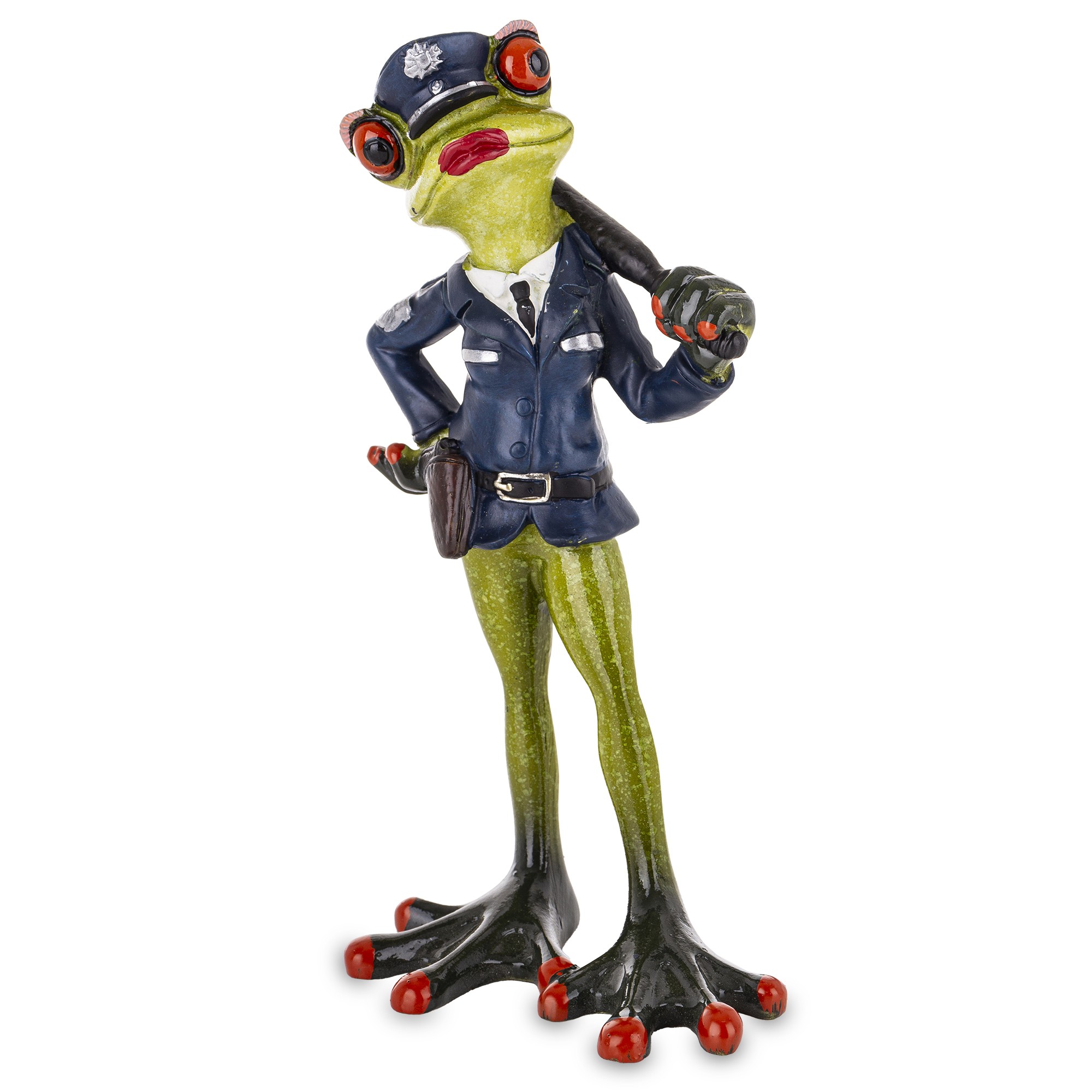 Ta dekoracyjna figurka to urocze połączenie żabiego wdzięku i policyjnej powagi. Zielona żaba z czerwonymi oczami dumnie prezentuje się w granatowym mundurze, z czapką, pasem i pałką zarzuconą nonszalancko na ramię. Jej postawa – jedna łapka na biodrze, druga gotowa do akcji – emanuje pewnością siebie i figlarnym charakterem.