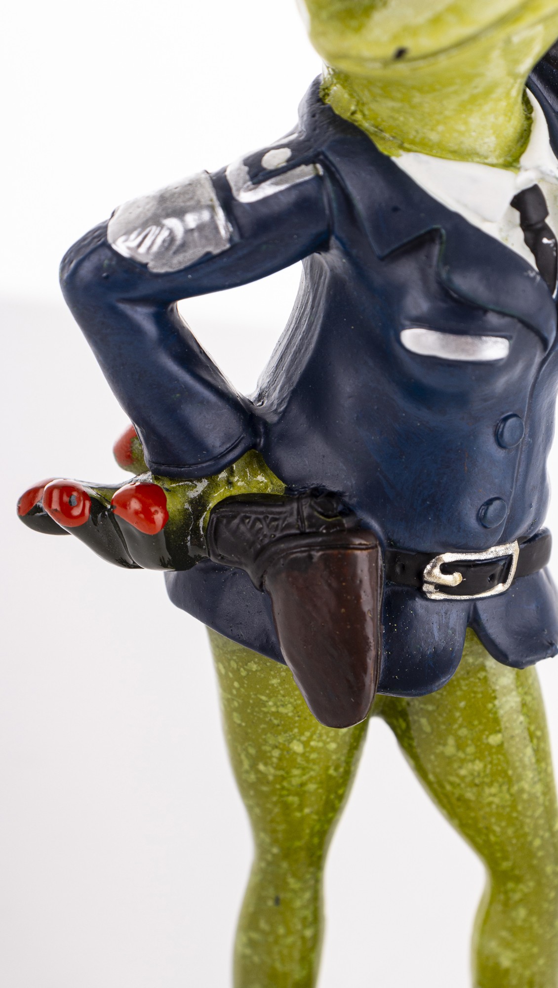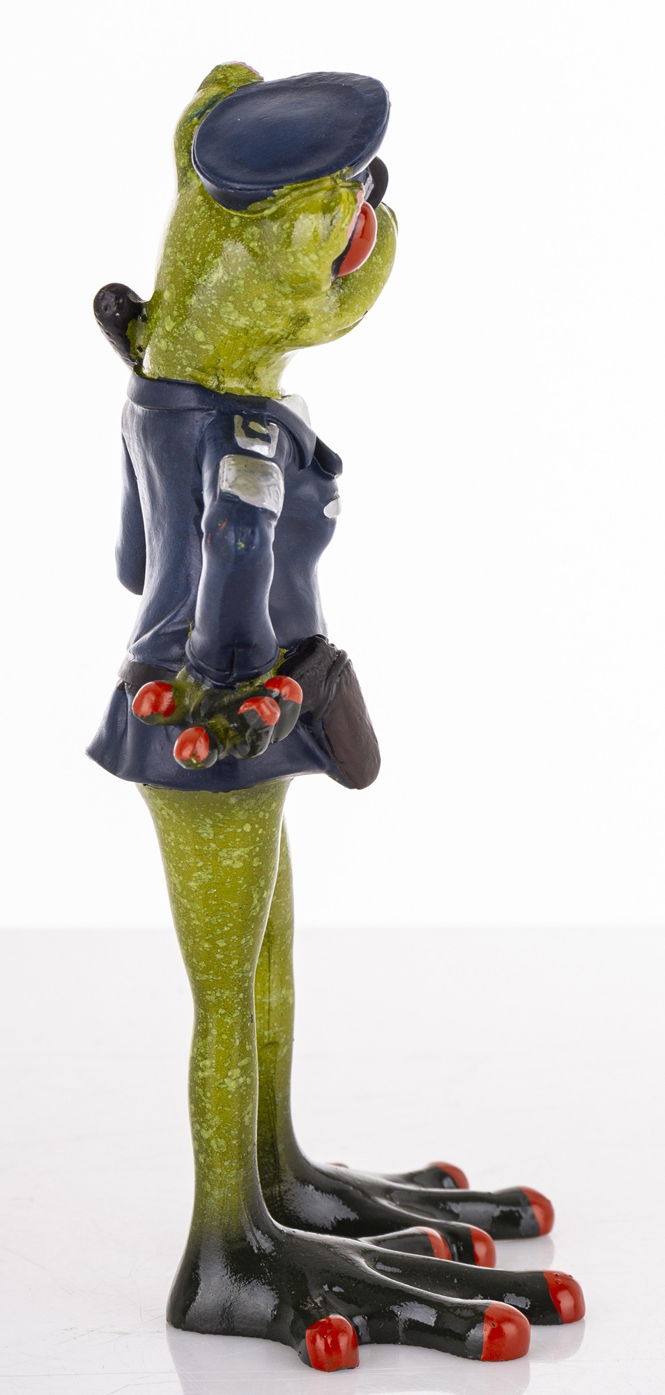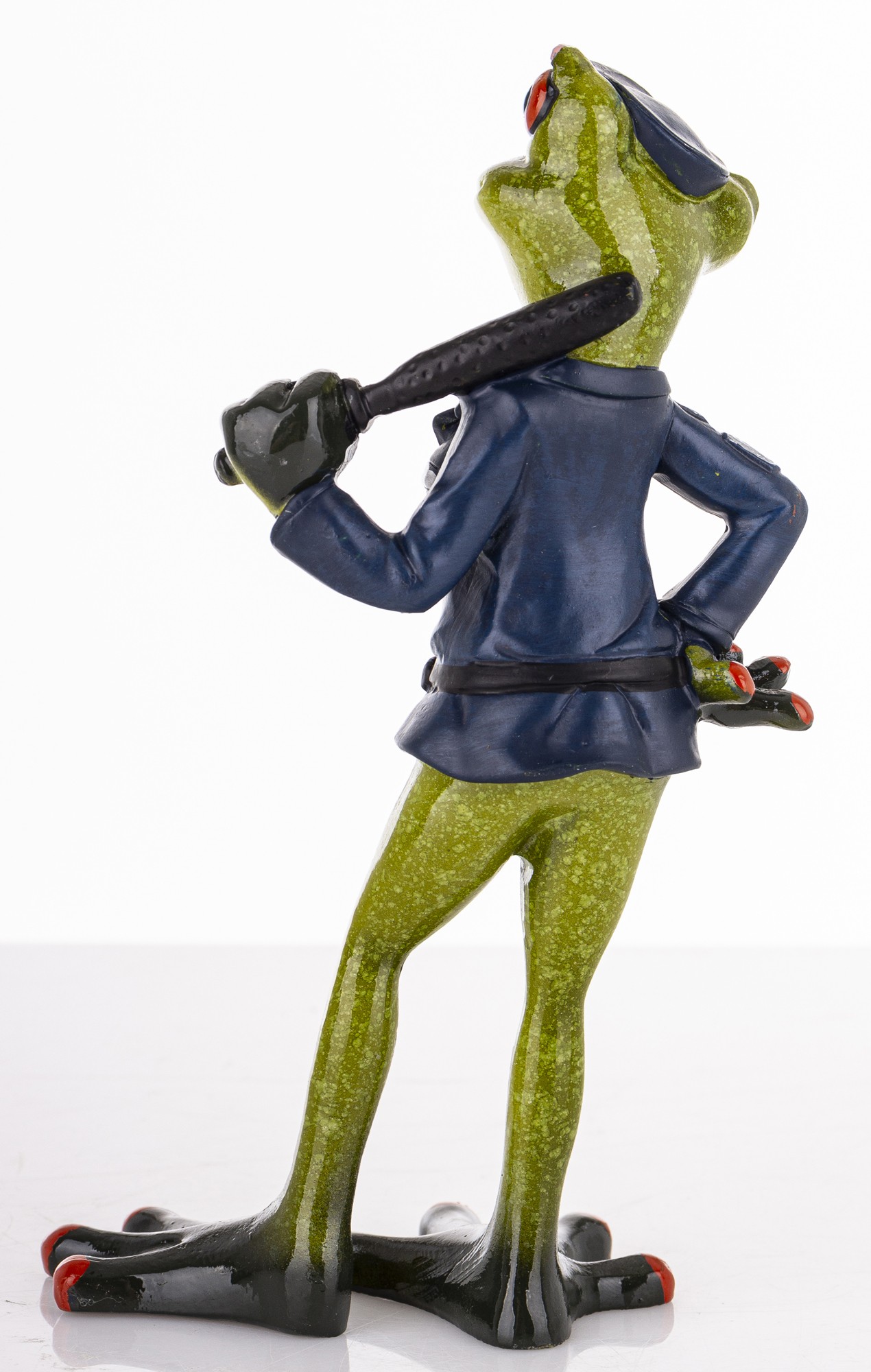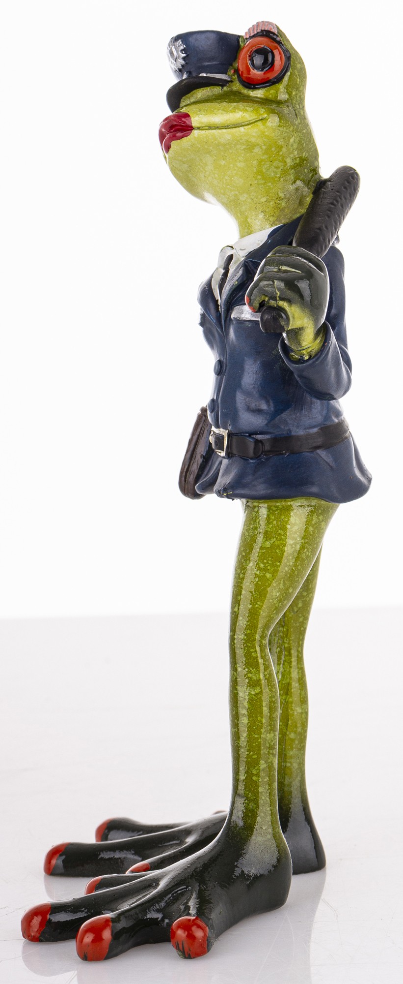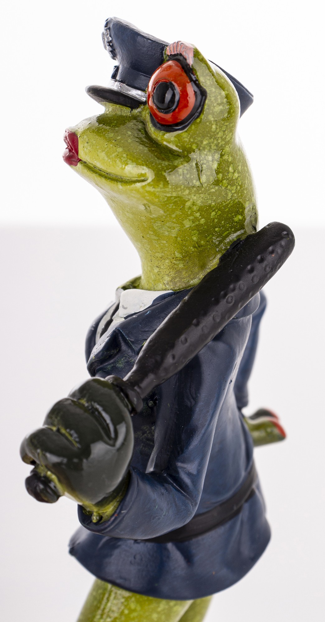 Ta dekoracyjna figurka to urocze połączenie żabiego wdzięku i policyjnej powagi. Zielona żaba z czerwonymi oczami dumnie prezentuje się w granatowym mundurze, z czapką, pasem i pałką zarzuconą nonszalancko na ramię. Jej postawa – jedna łapka na biodrze, druga gotowa do akcji – emanuje pewnością siebie i figlarnym charakterem.