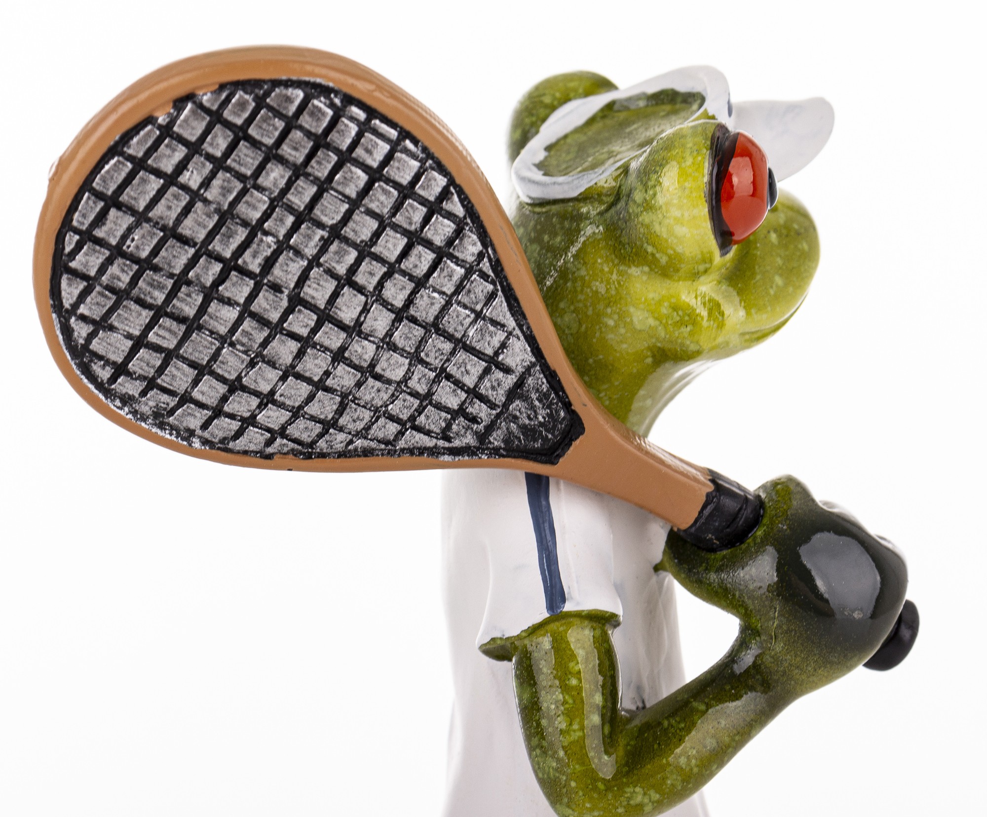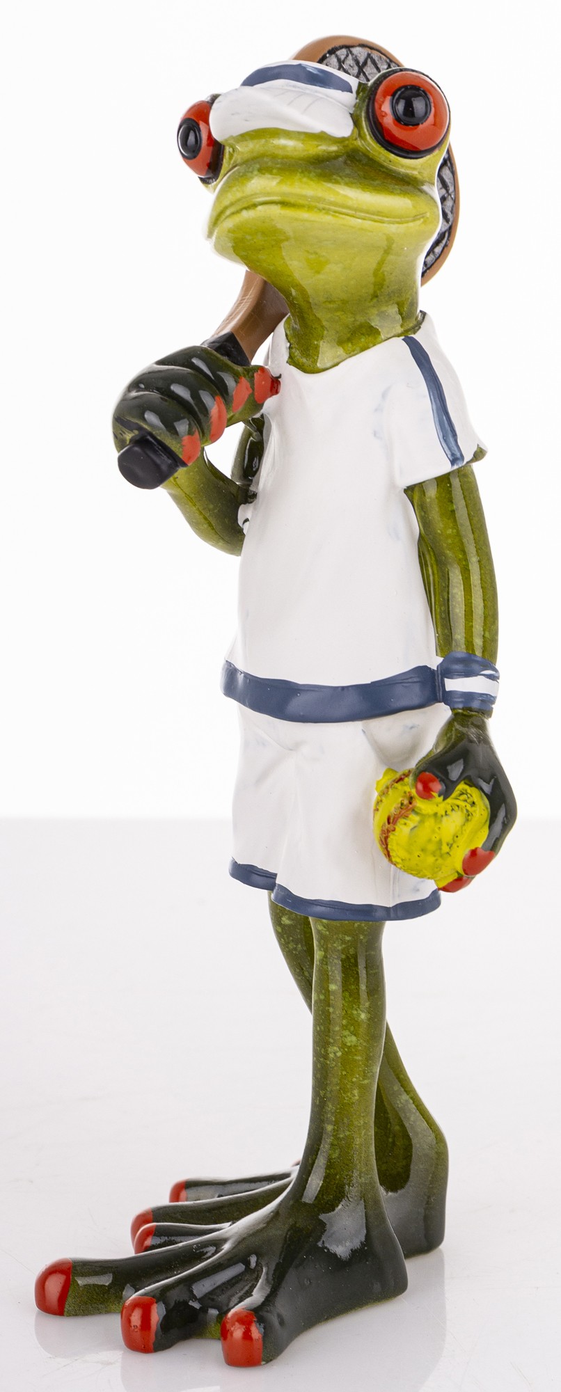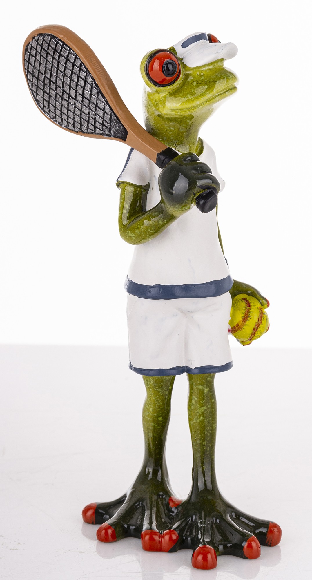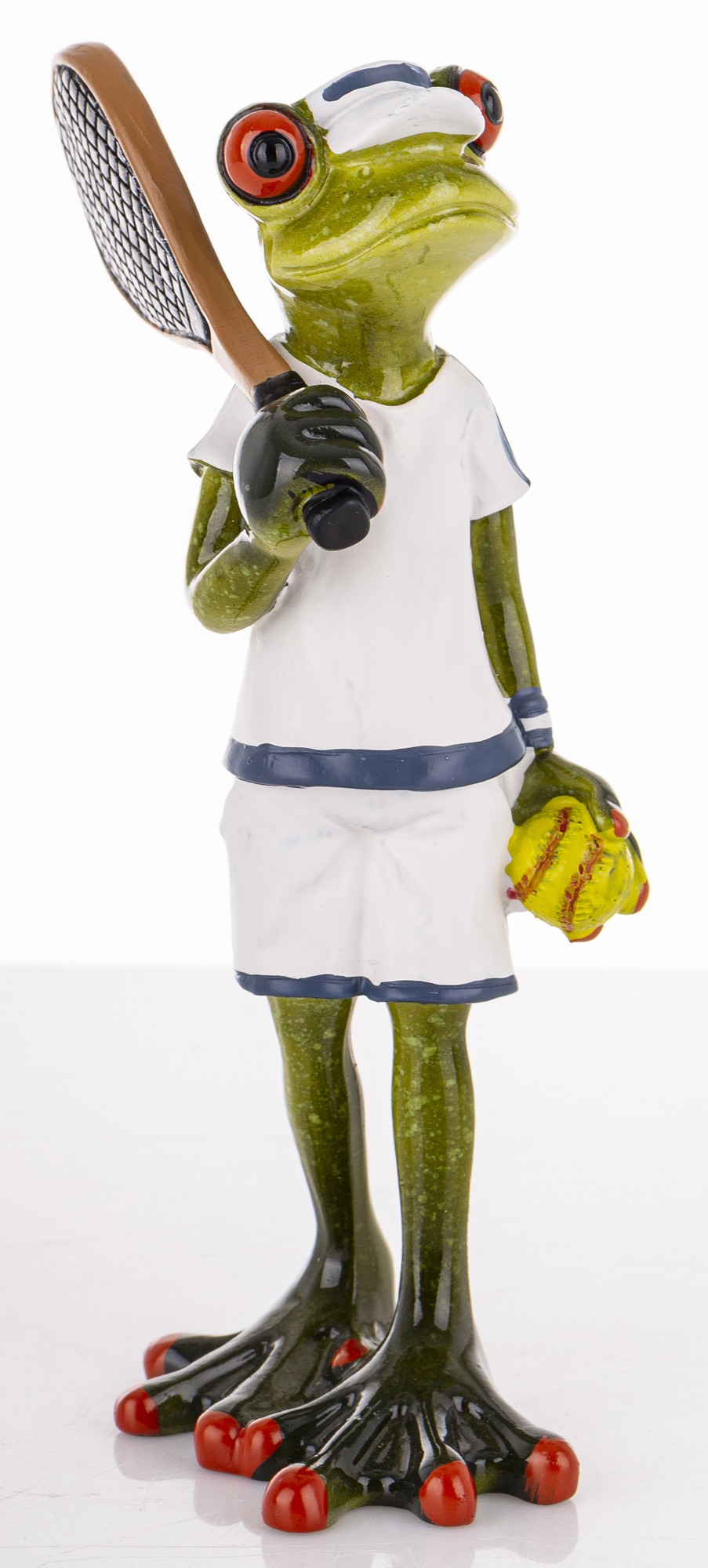 Figurka Żaba TENIS to pełna energii dekoracja przedstawiająca żabkę w stroju tenisowym, gotową do gry. Z rakietą na ramieniu i piłką w dłoni, wnosi do wnętrza sportowy klimat i odrobinę humoru. Idealna dla fanów tenisa i niebanalnych dodatków.