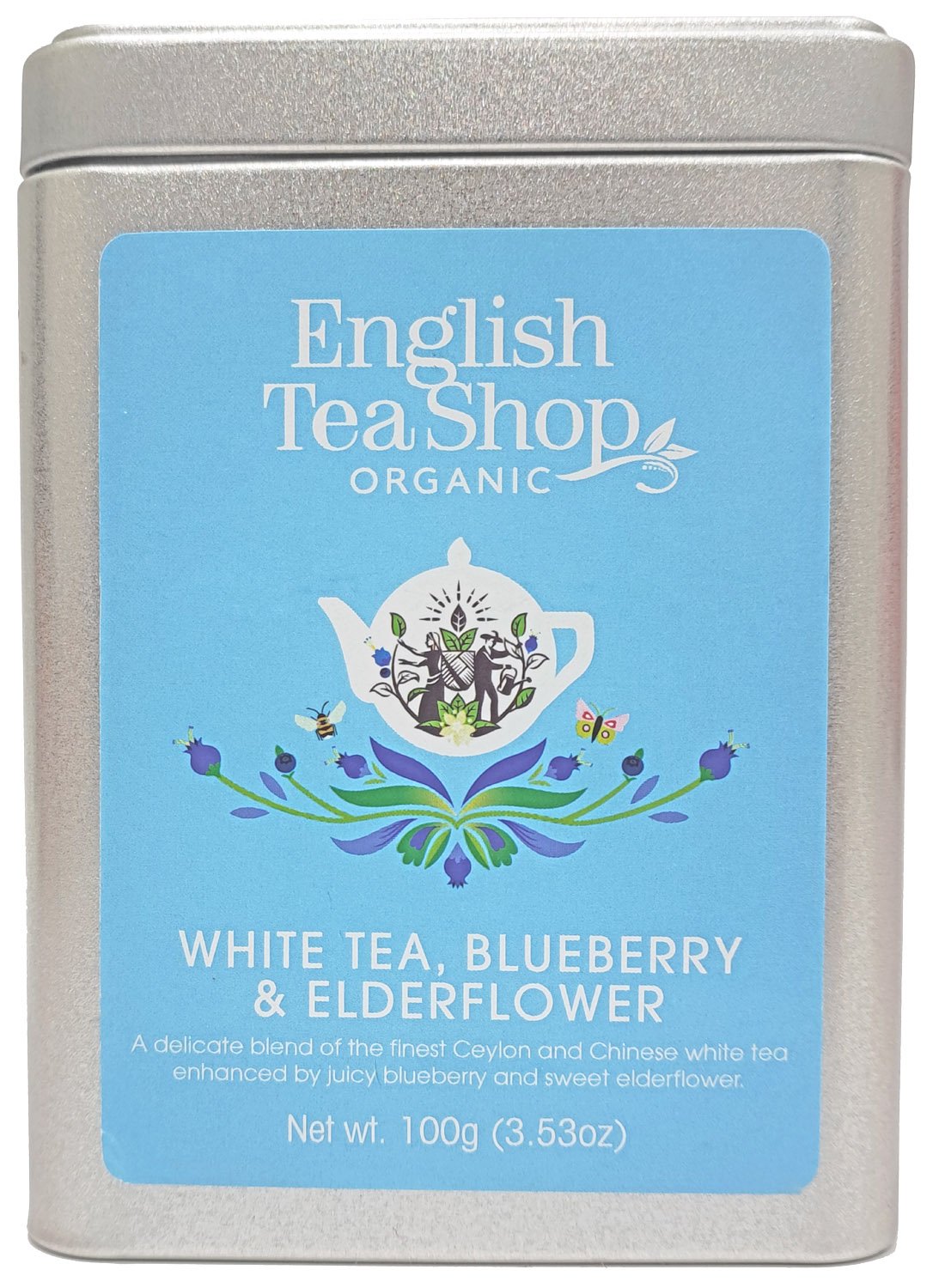 English Tea Shop White Tea, Blueberry & Elderflower – organiczna biała herbata z dodatkiem jagód i kwiatów czarnego bzu. Delikatność i owocowa świeżość w jednej filiżance.