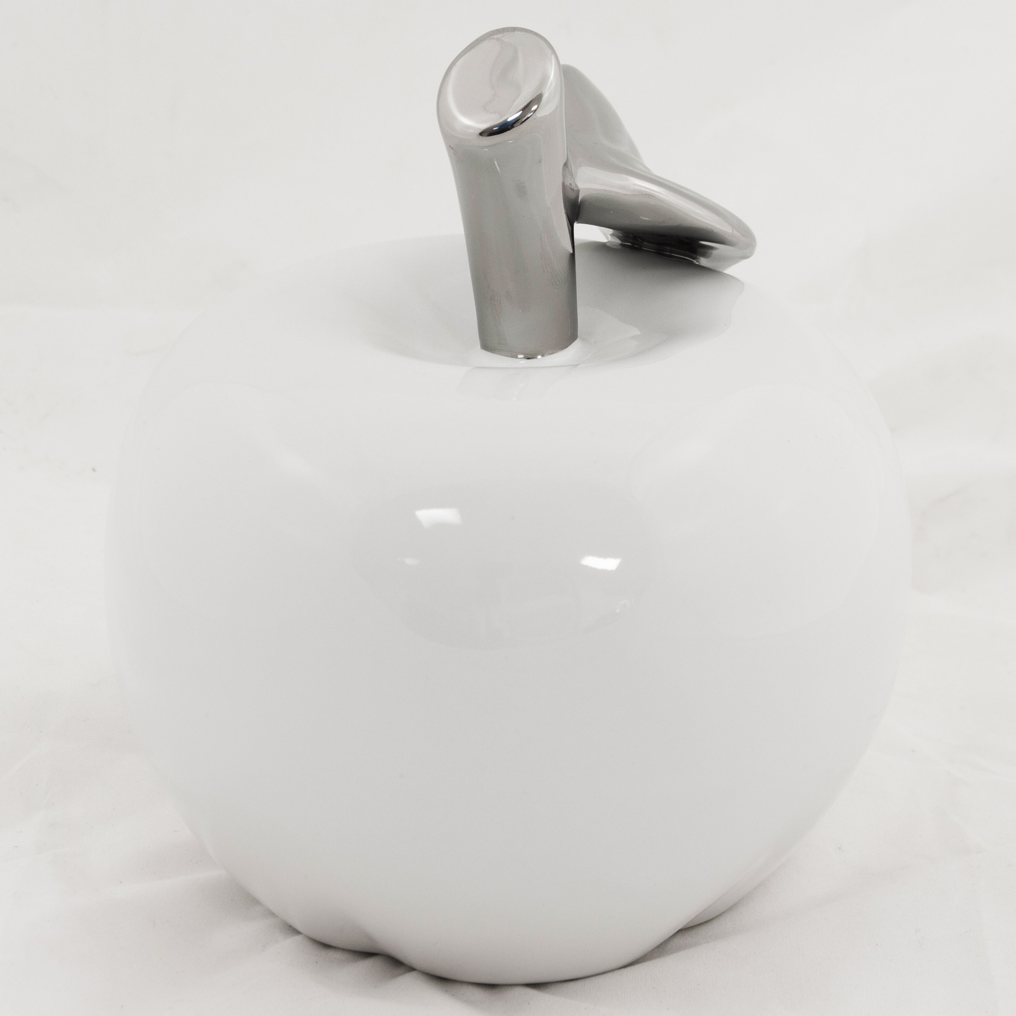 Białe ceramiczne jabłko dekoracyjne ze srebrnym listkiem to elegancki dodatek do Twojego wnętrza. Przyciąga wzrok swoim prostym, ale stylowym designem. Idealne na półkę, komodę lub stół. Jego wymiary to 11,5x10x10 cm.
