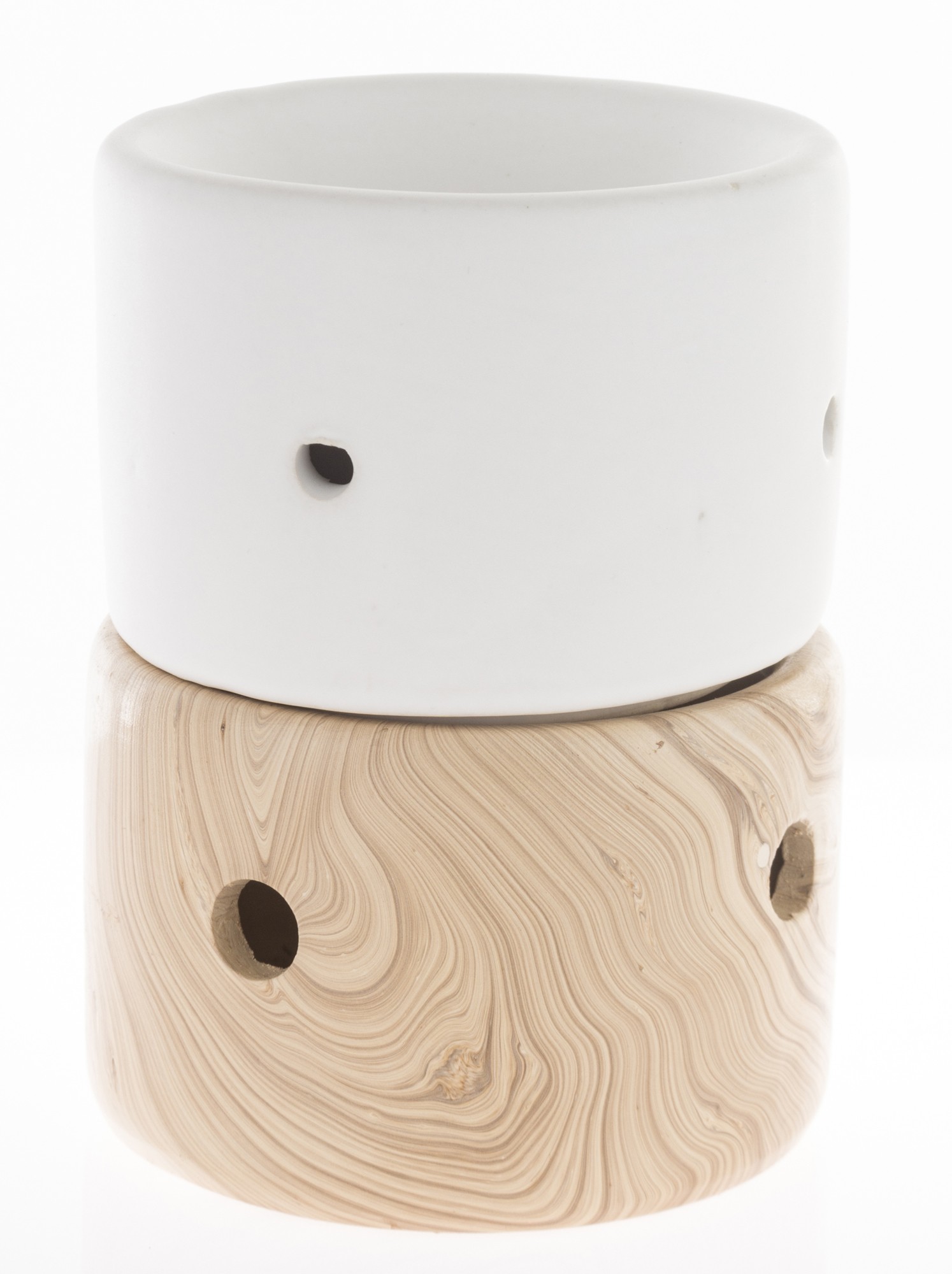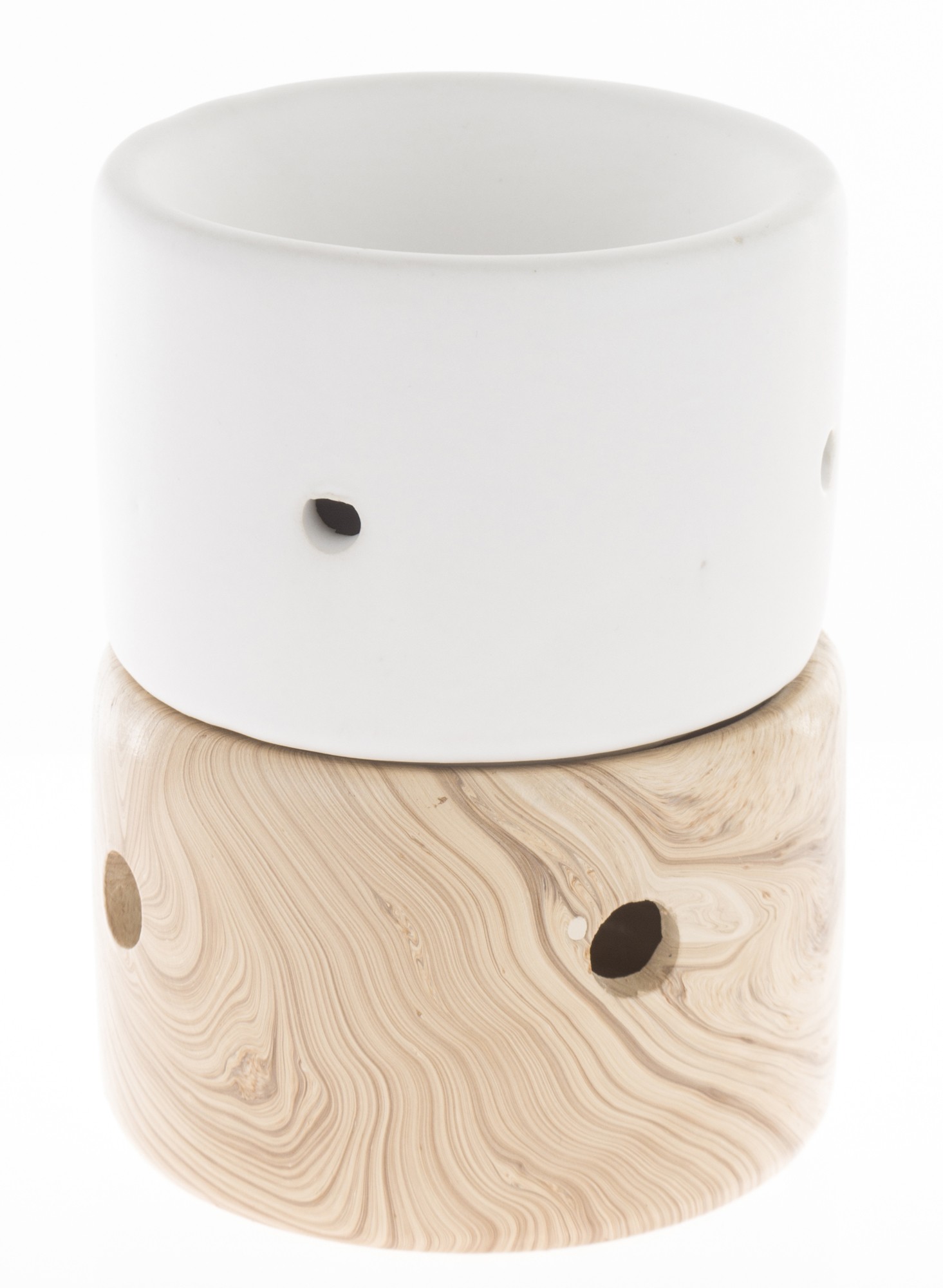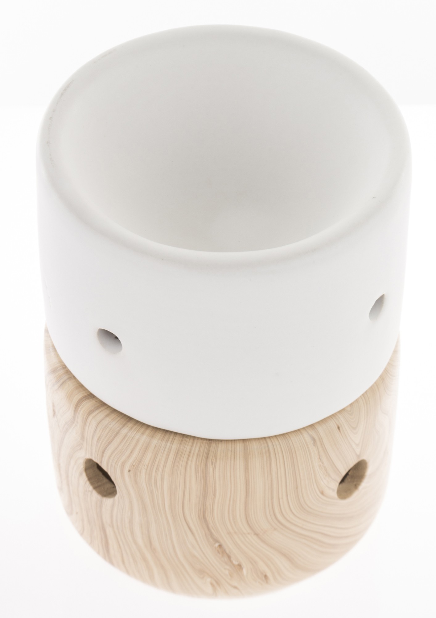 Elegancki dwuczęściowy kominek zapachowy, którego dolna część jest z brązowego tworzywa imitującego drewno z otworami odprowadzającymi ciepło, a z nią idealnie współgra z górna część z białej ceramiki, która zawiera wgłębienie na wosk. Naturalne połączenie bieli i brązu tworzy klasycznie elegancki wygląd, co sprawia, że ten niewielki dodatek wspaniale sprawdzi się w każdym pomieszczeniu, wypełniając je ulubioną wonią.