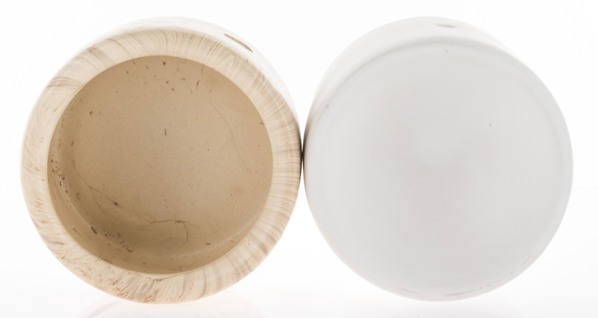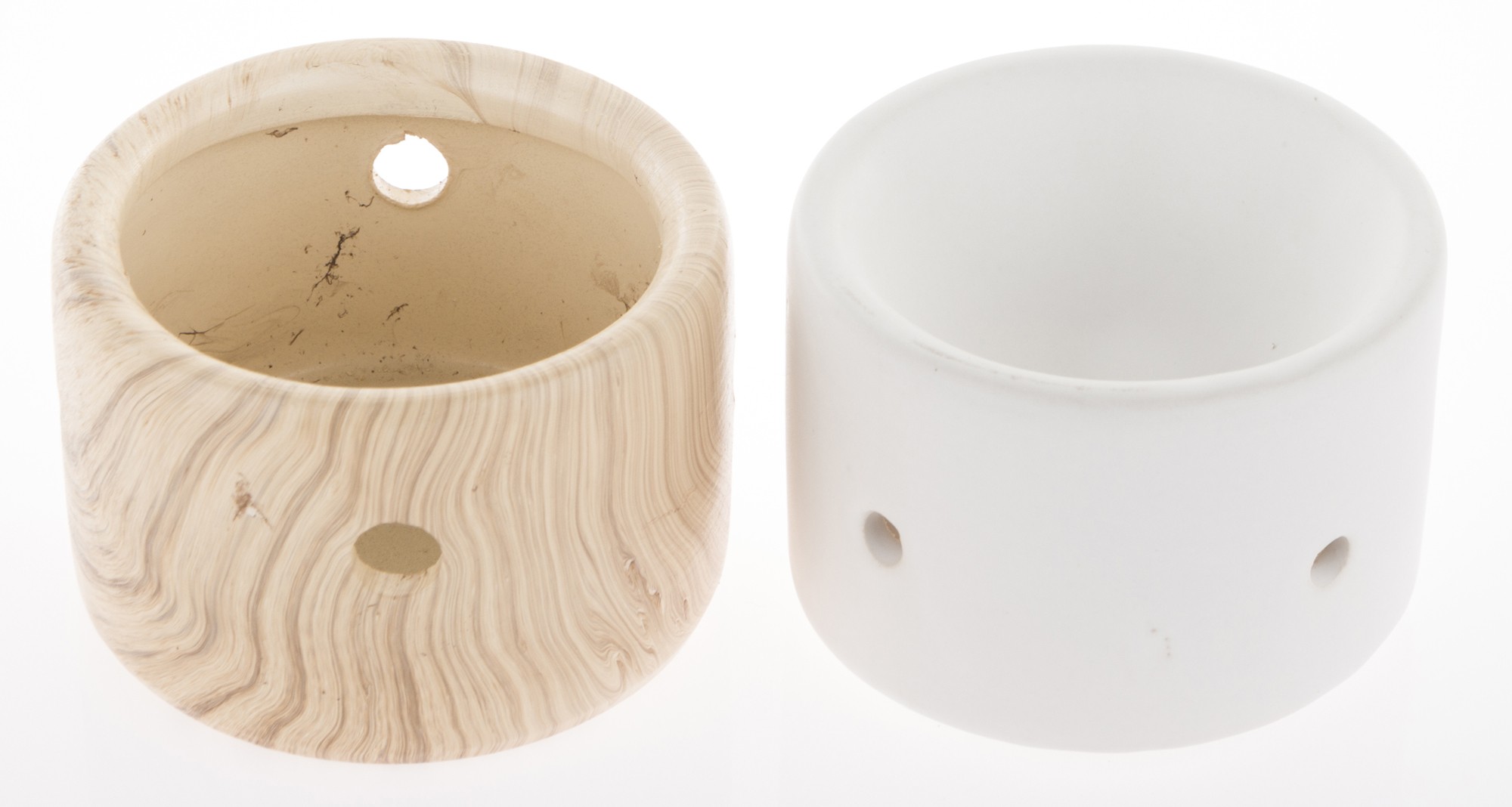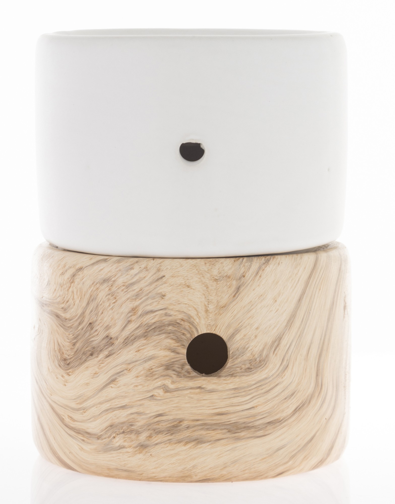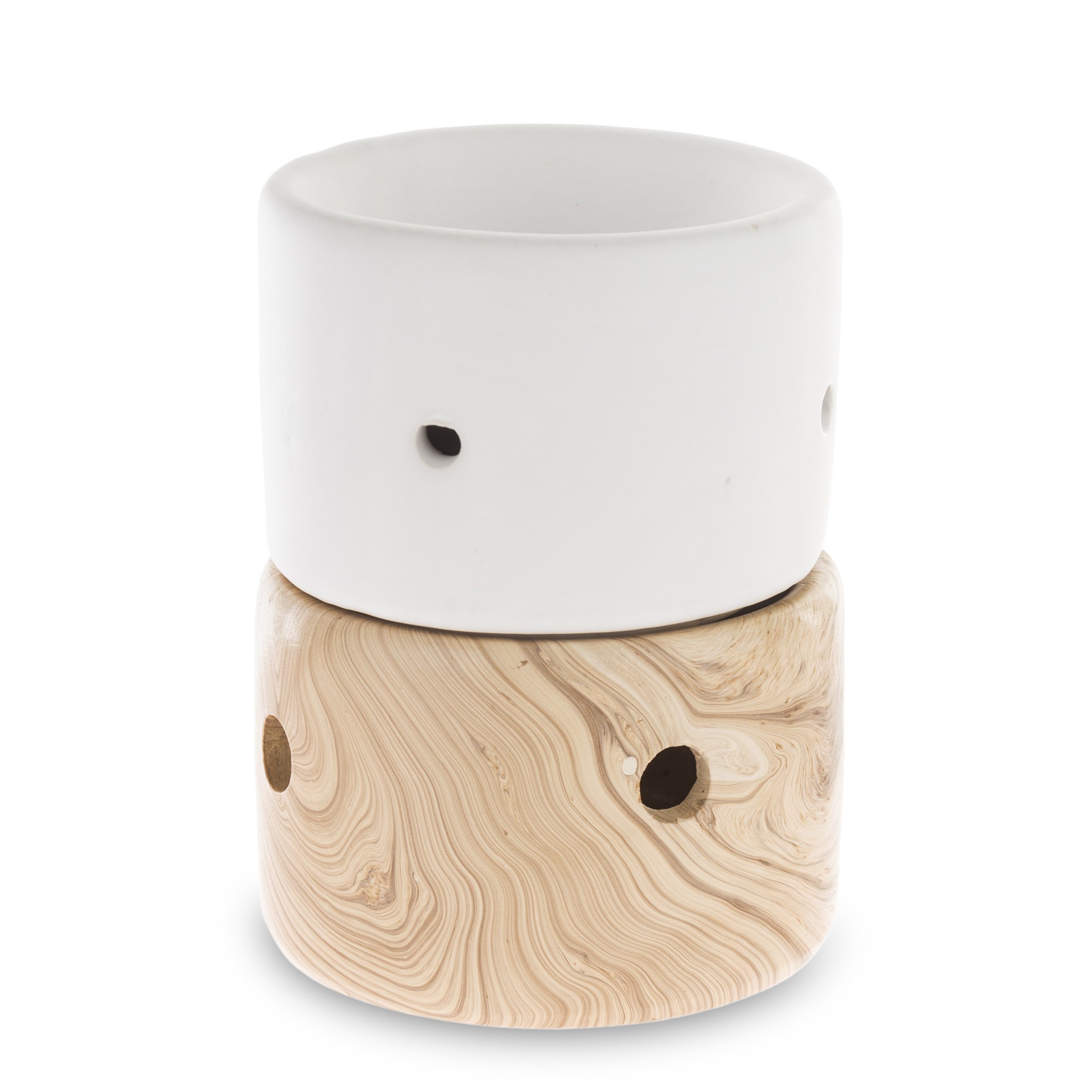 Elegancki dwuczęściowy kominek zapachowy, którego dolna część jest z brązowego tworzywa imitującego drewno z otworami odprowadzającymi ciepło, a z nią idealnie współgra z górna część z białej ceramiki, która zawiera wgłębienie na wosk. Naturalne połączenie bieli i brązu tworzy klasycznie elegancki wygląd, co sprawia, że ten niewielki dodatek wspaniale sprawdzi się w każdym pomieszczeniu, wypełniając je ulubioną wonią.